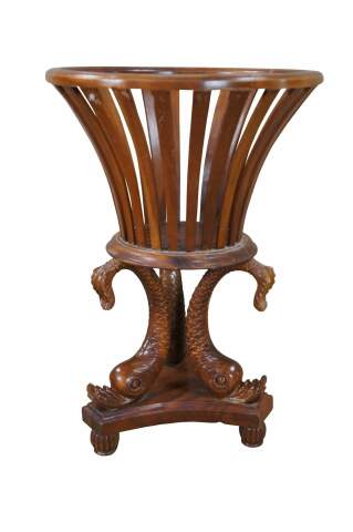 Late 20th Century Maitland Smith jardiniere plant stand. Made from mahogany with a tripod carved delphin base over reeded bun feet and a reticulated planter top.