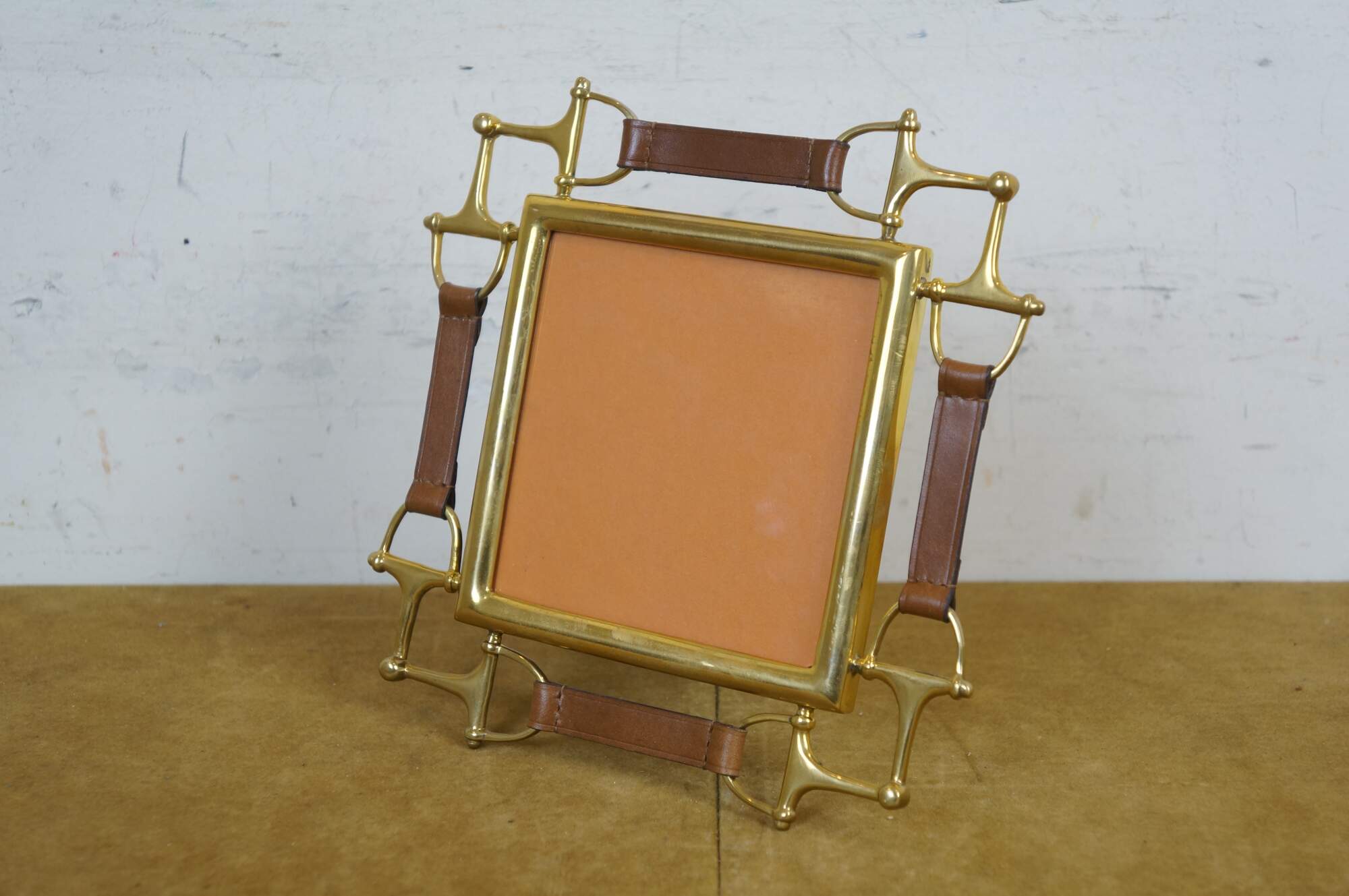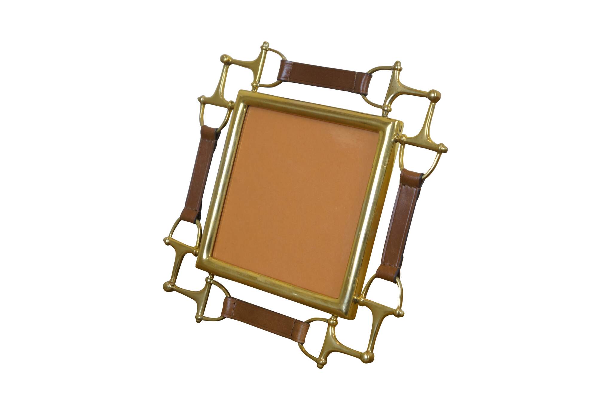 Ralph Lauren Austen Horsebit Corner Frame. Square picture / photo frame trimmed with brass horse bits and brown leather straps. Easel back.
