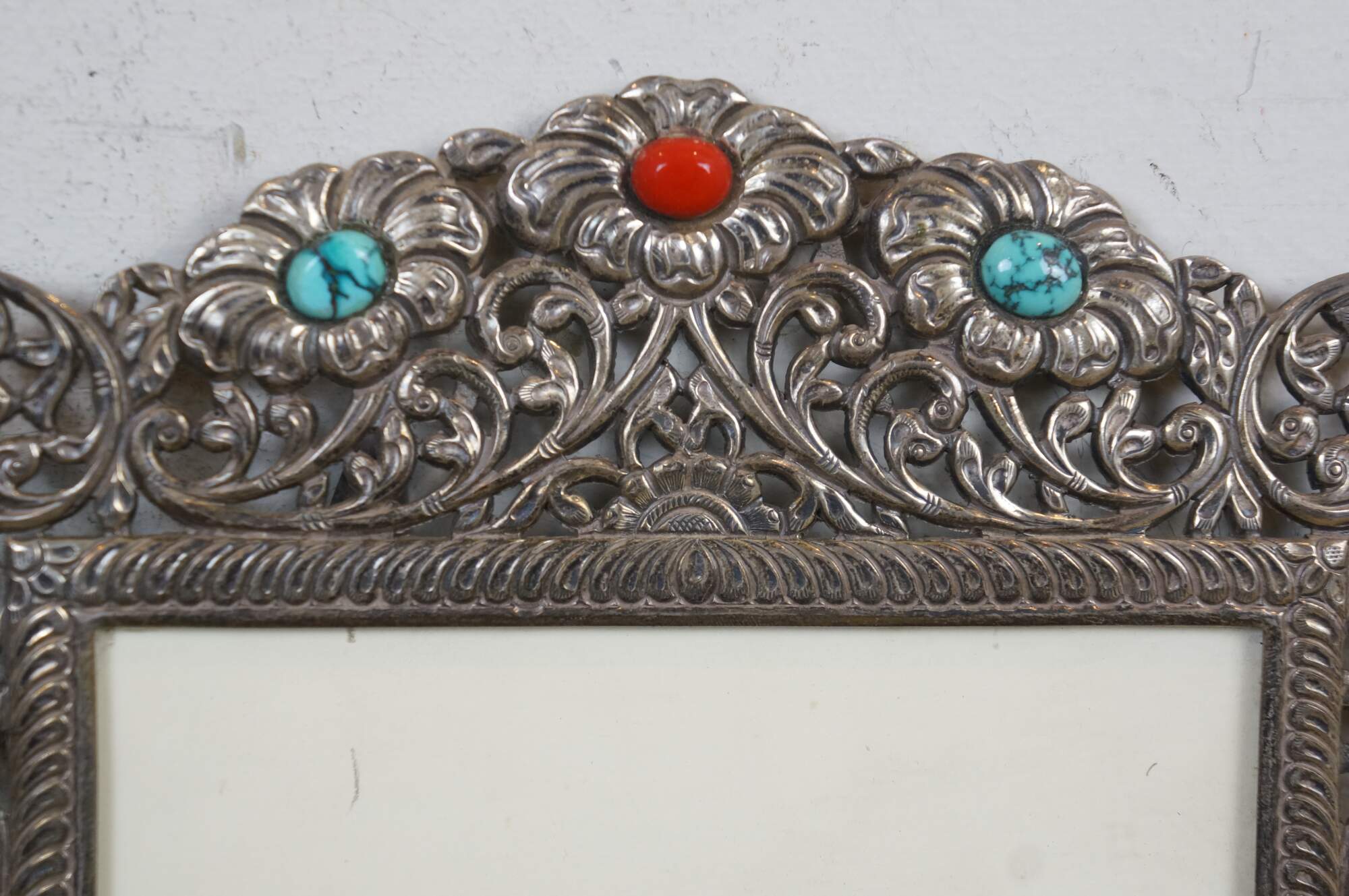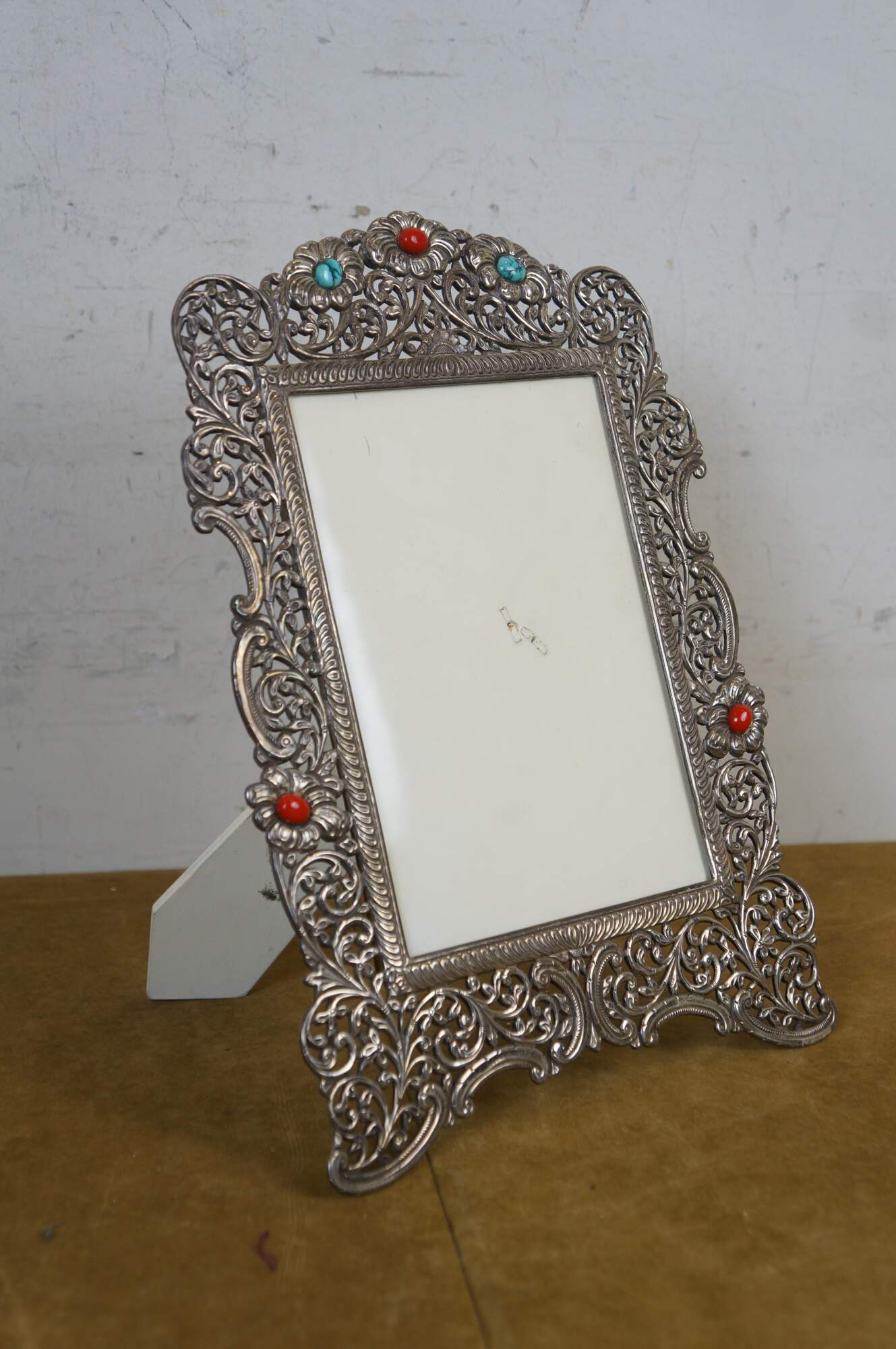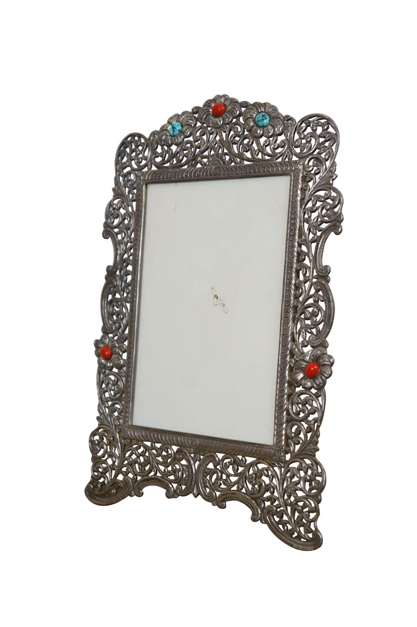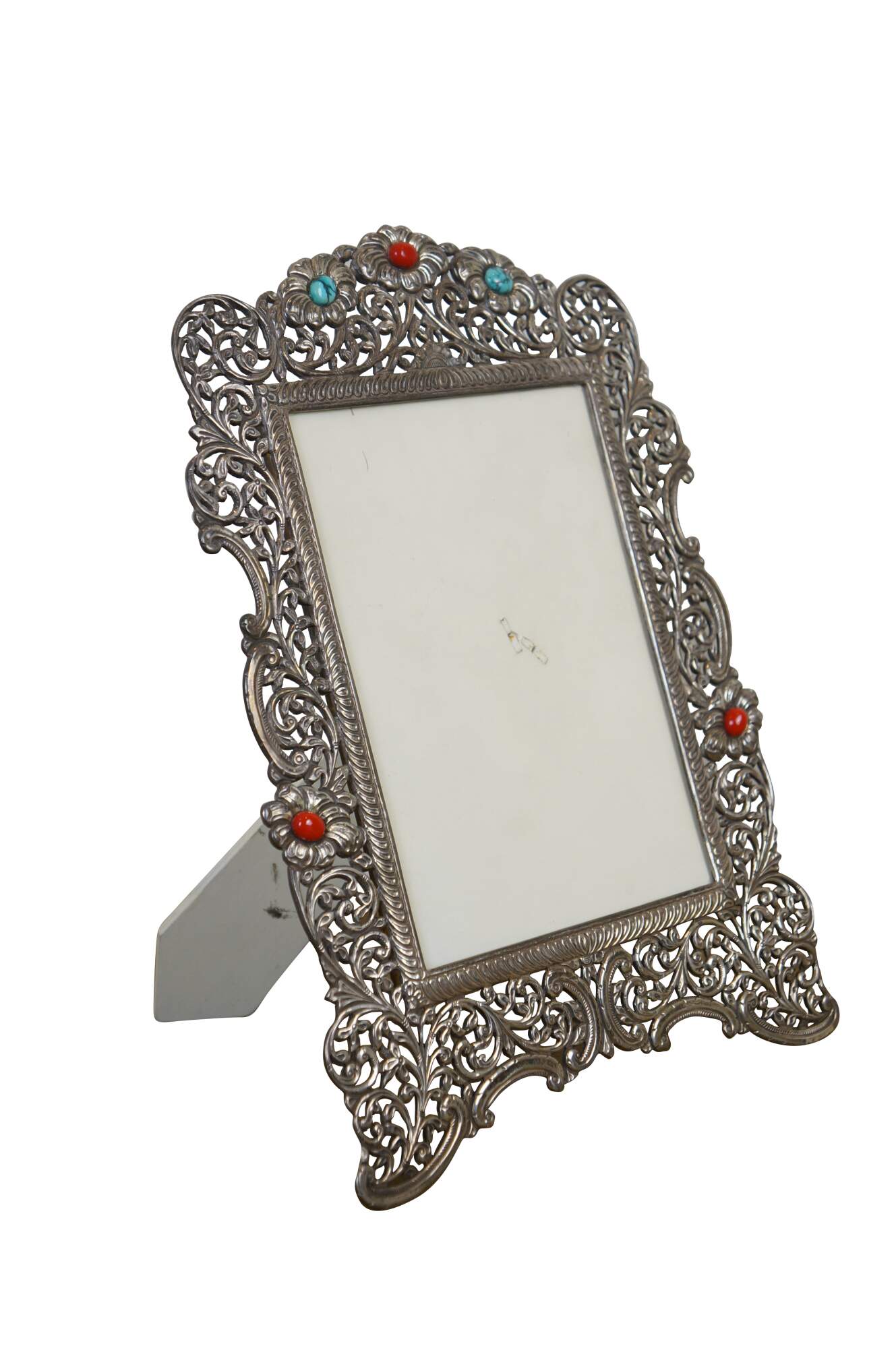 925 sterling silver art nouveau style vertical rectangular picture / photo frame featuring pierced, swirling floral and foliate filigree accented with coral red and veined turquoise stones. Easel back.