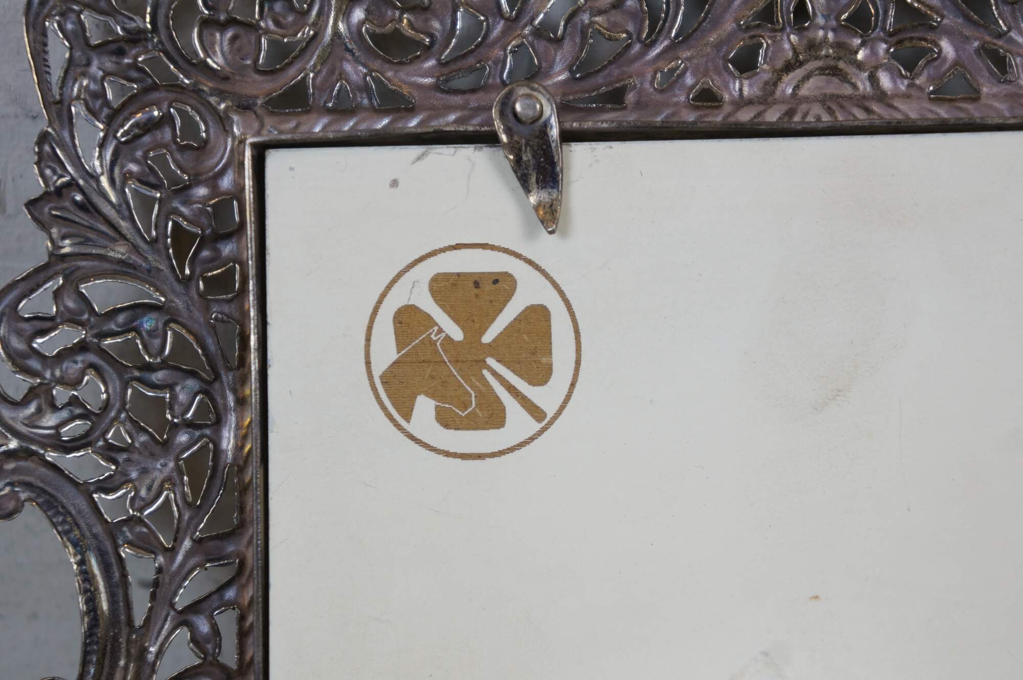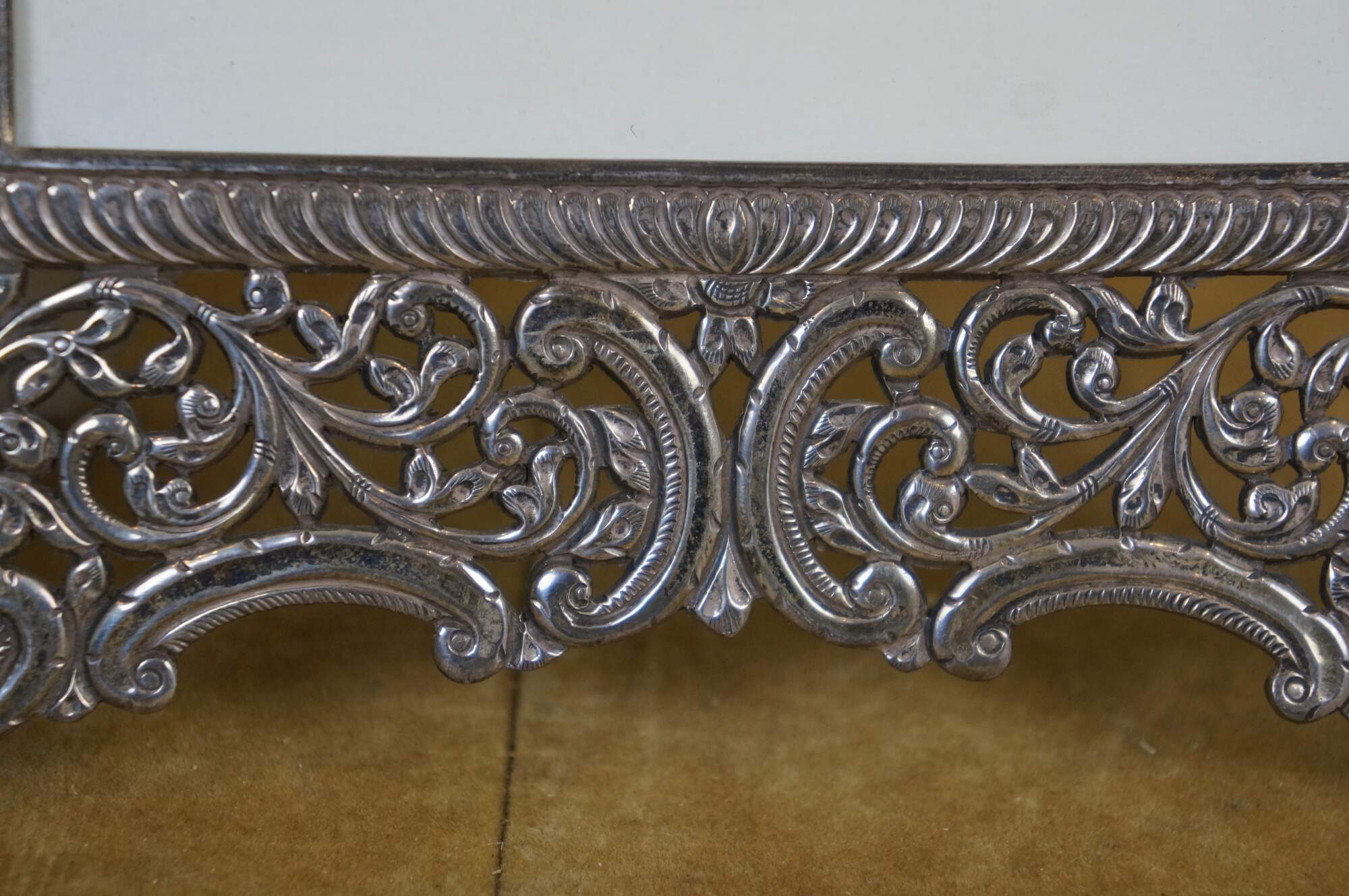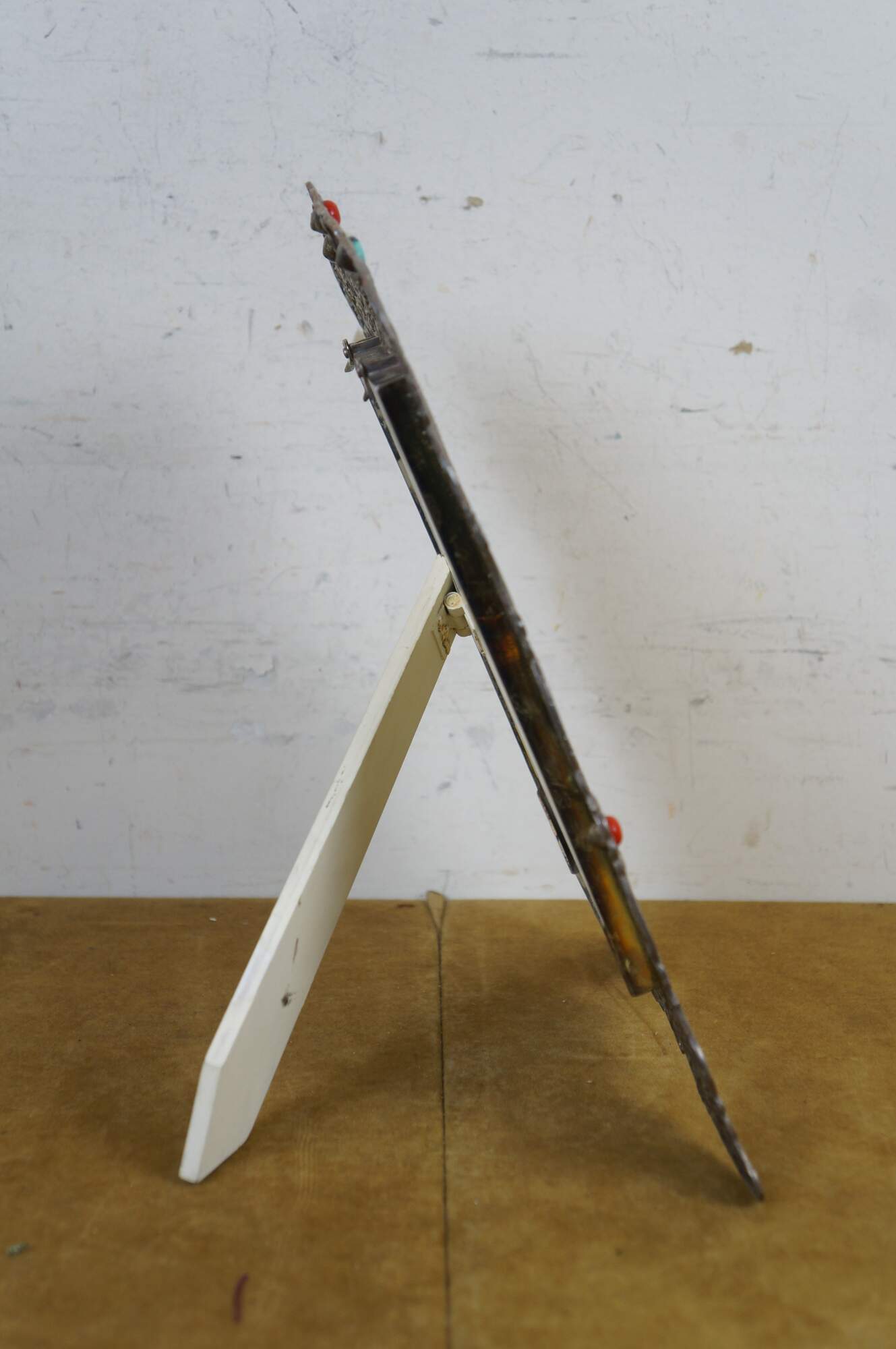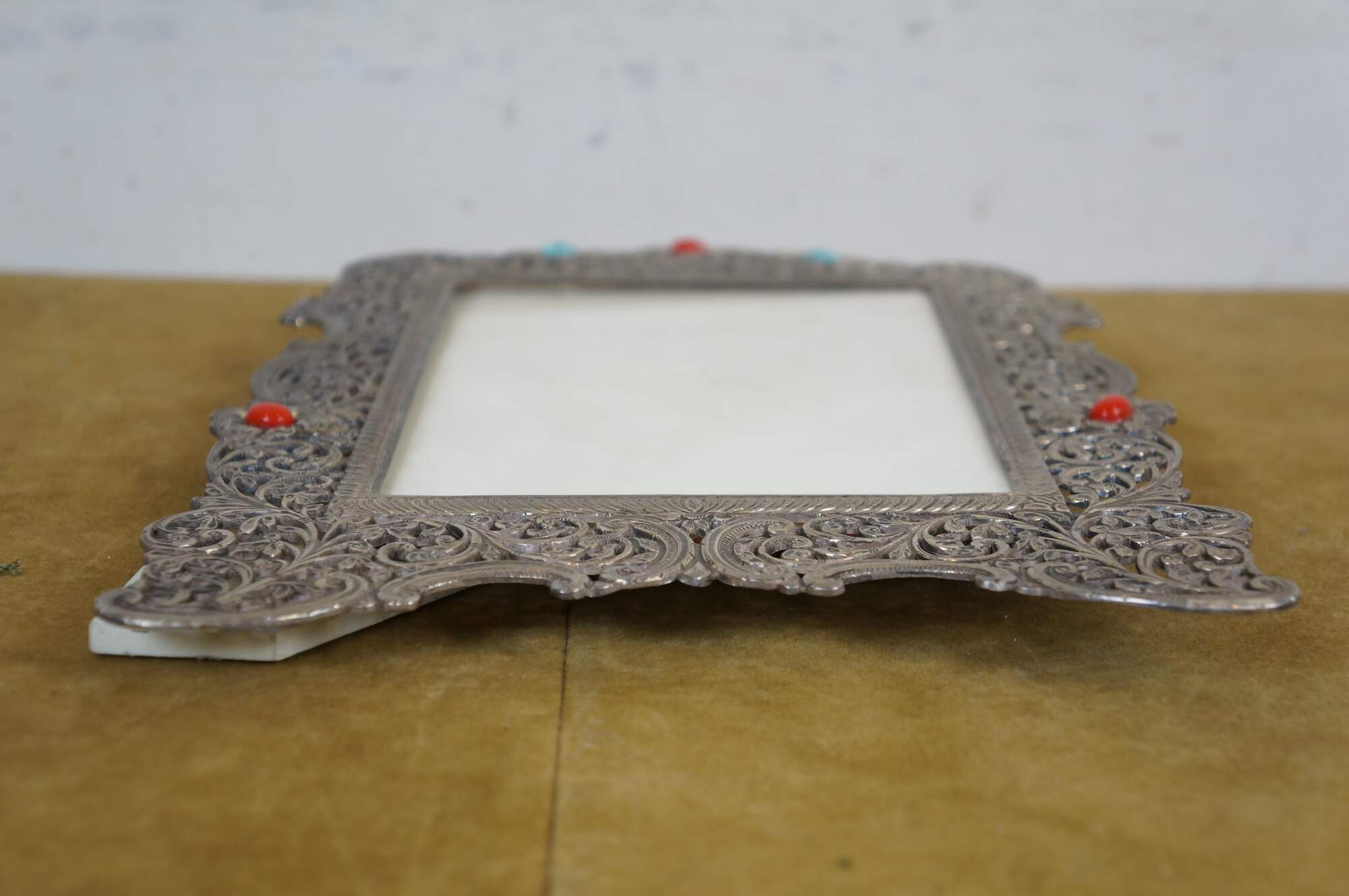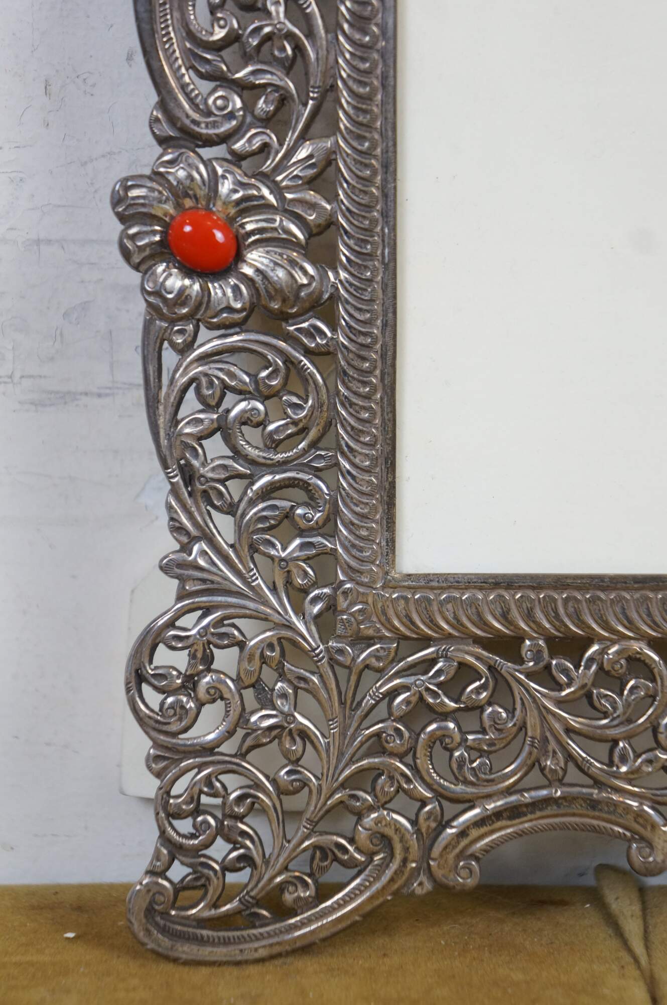 925 sterling silver art nouveau style vertical rectangular picture / photo frame featuring pierced, swirling floral and foliate filigree accented with coral red and veined turquoise stones. Easel back.