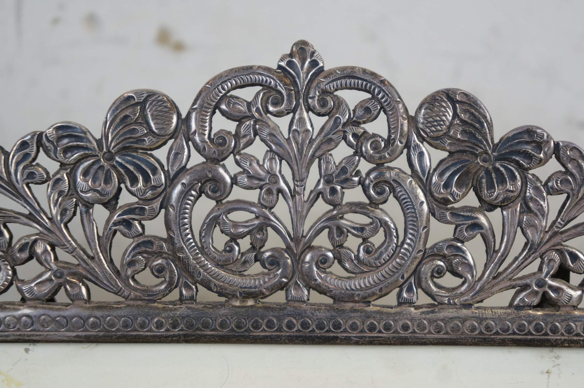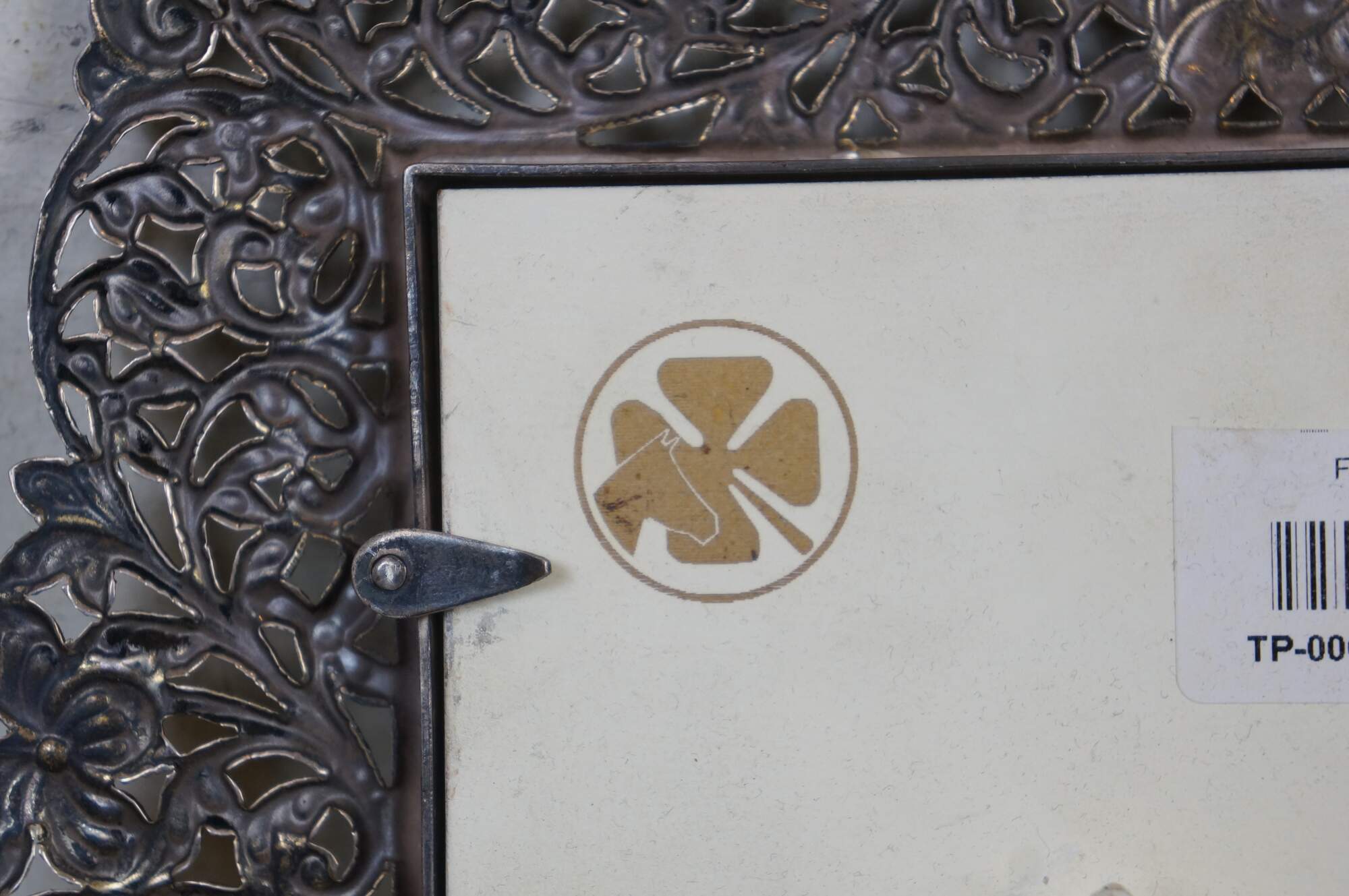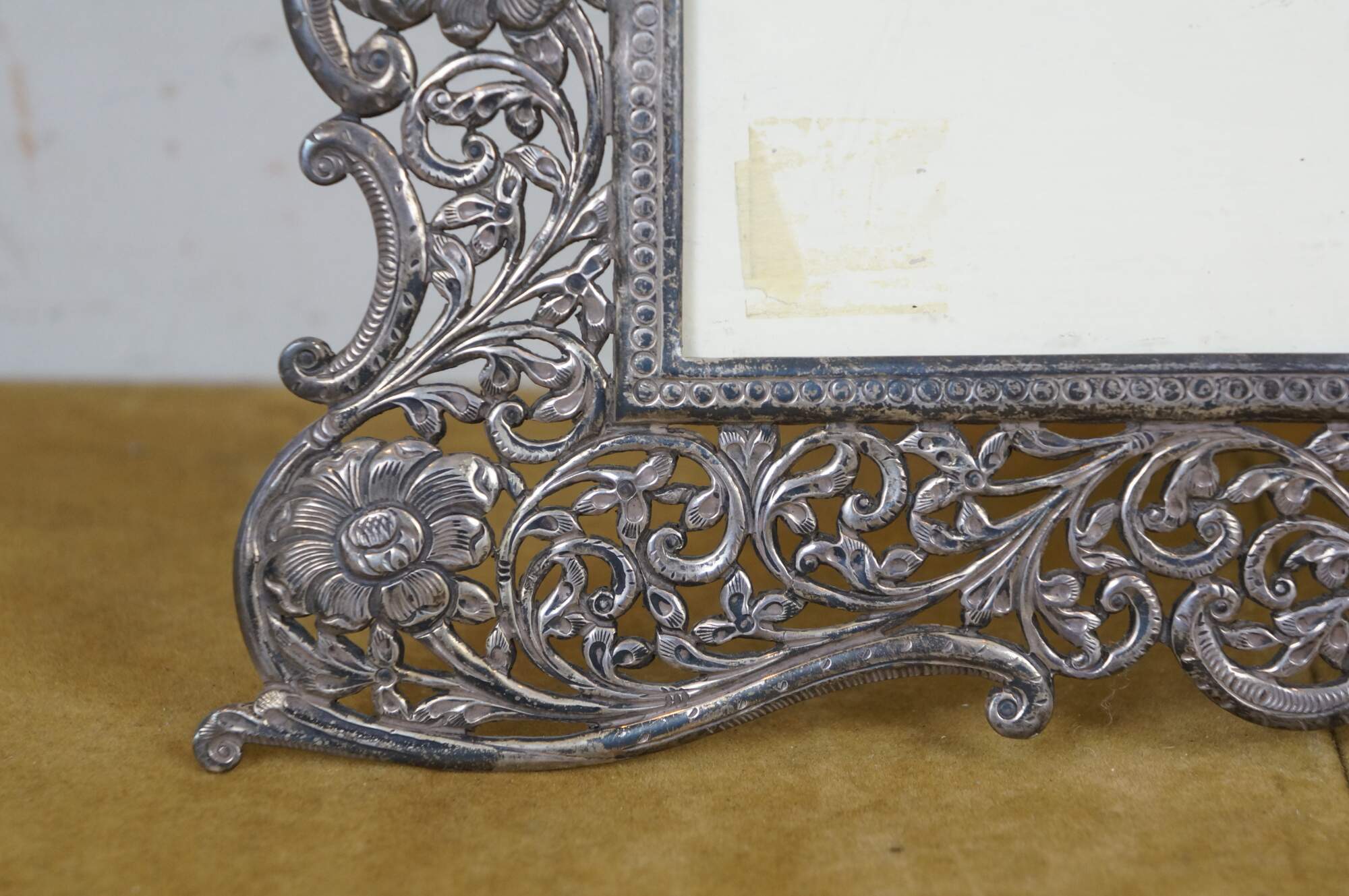 925 sterling silver art nouveau style horizontal rectangular picture / photo frame featuring pierced, swirling floral and foliate filigree. Easel back.
