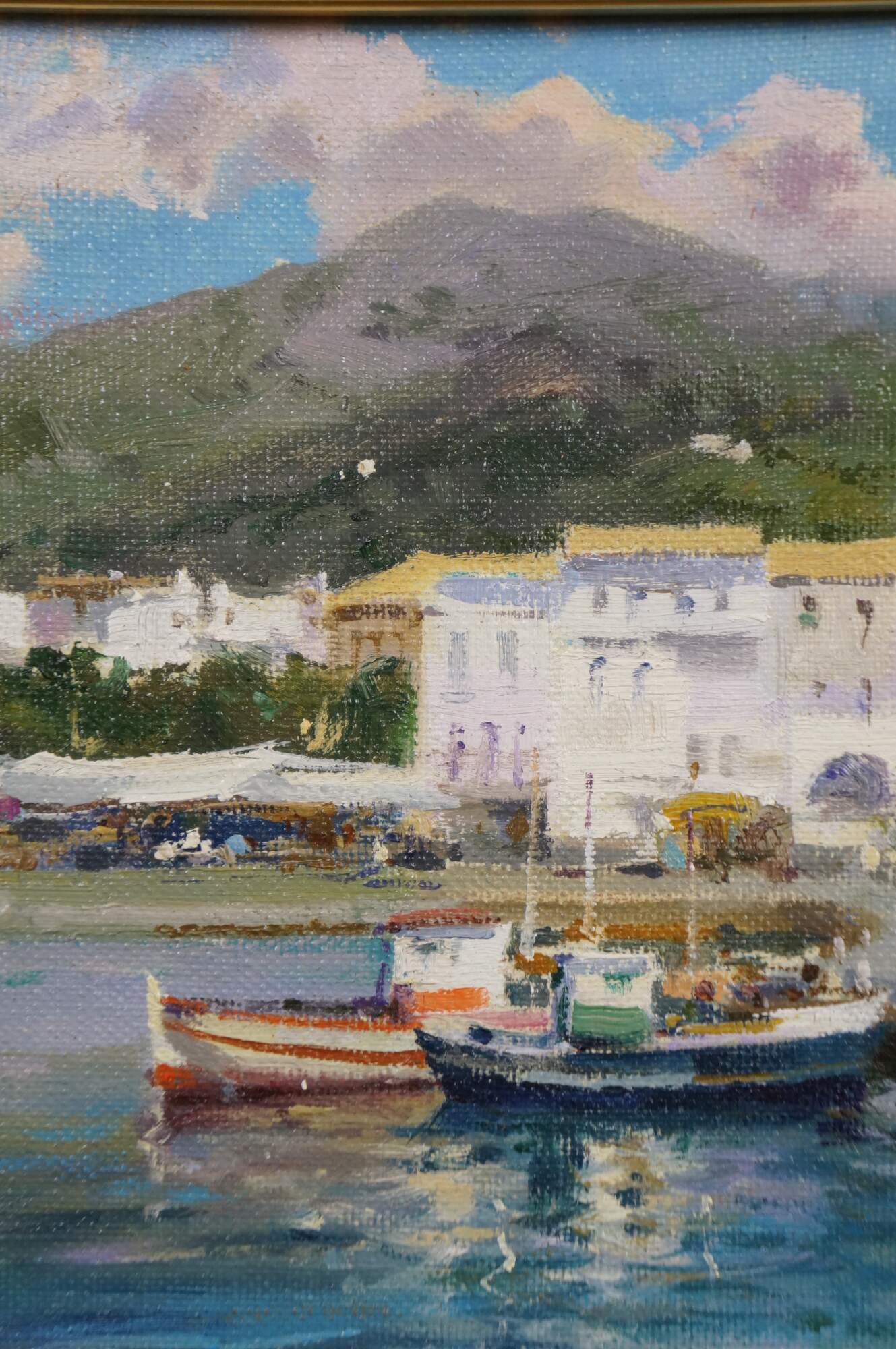 Circa late 20th century oil on canvas painting titled "Rincon de Cadaques - Costa Brava" by Salvador Caballero. Depicts a view from the beach of a street corner and small inlet lined with boats along the waterfront of Cadaques, Spain. Beveled gilt wood frame with black inner border and white fabric mat.