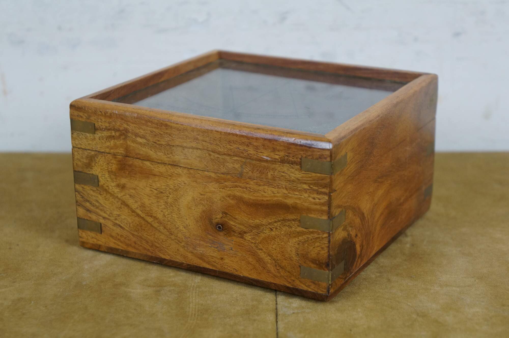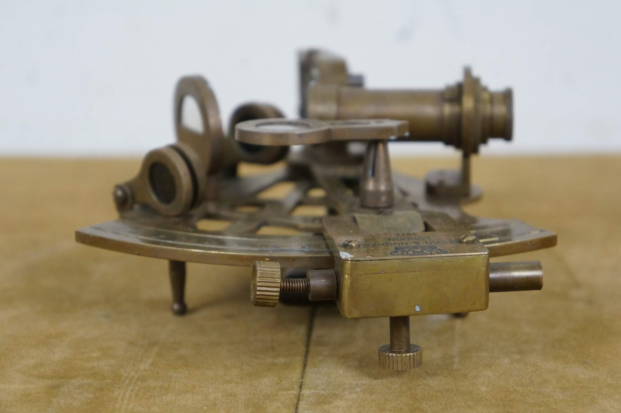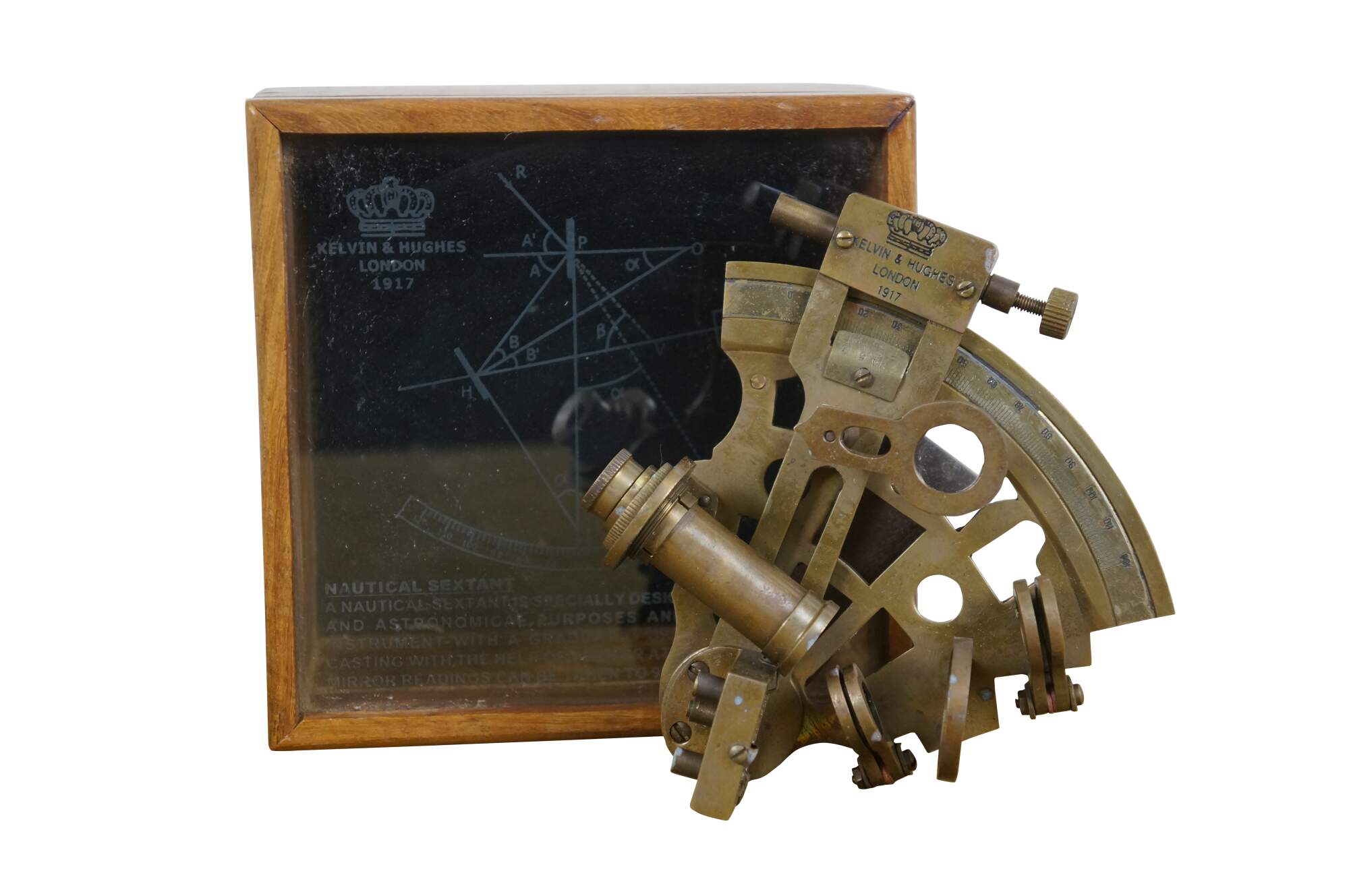Mid 20th century Kelvin & Hughes brass nautical sextant, displayed in a hardwood box / display case with brass corners and painted glass front.