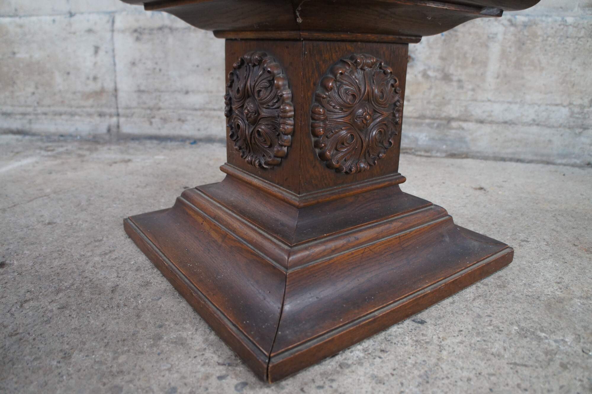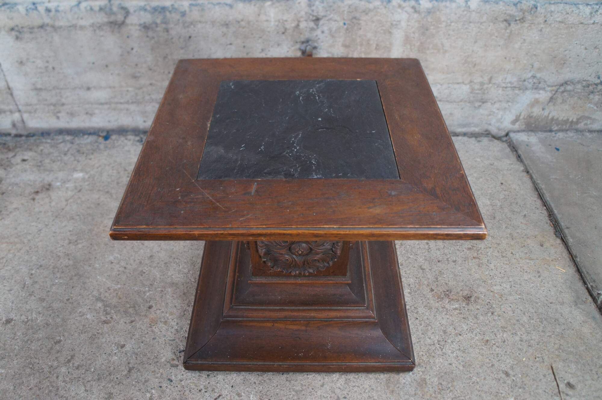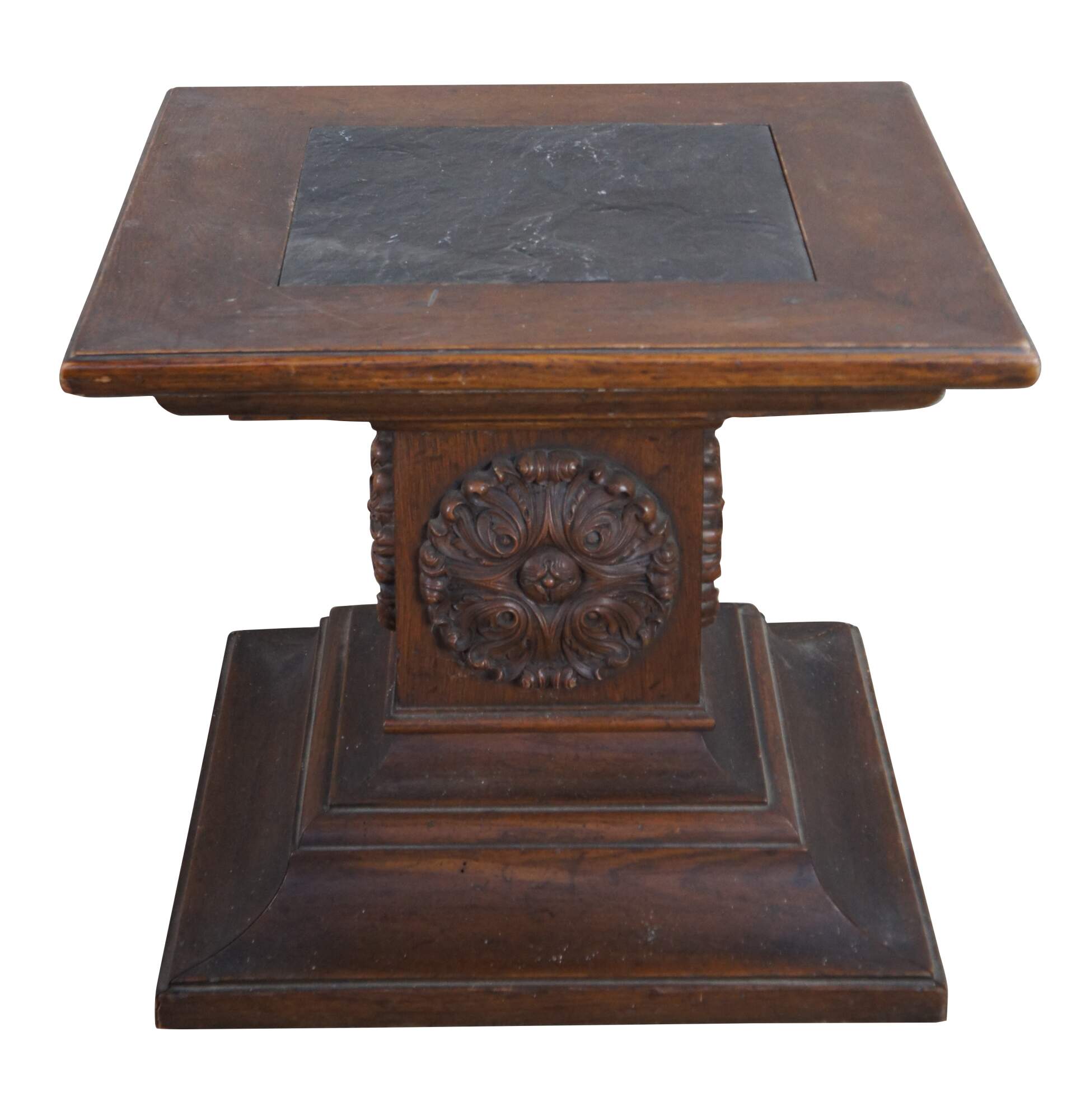 Pair of 1960s Drexel Grand Tour pedestal side tables. Made from oak with an inset slate top over a central column with round carved medallion and stepped plinth base. Marked along underside Heritage Grand Tour, 23-507-43. Great for use as end tables, pushed together for use as a coffee table or sculpture / plant stands.