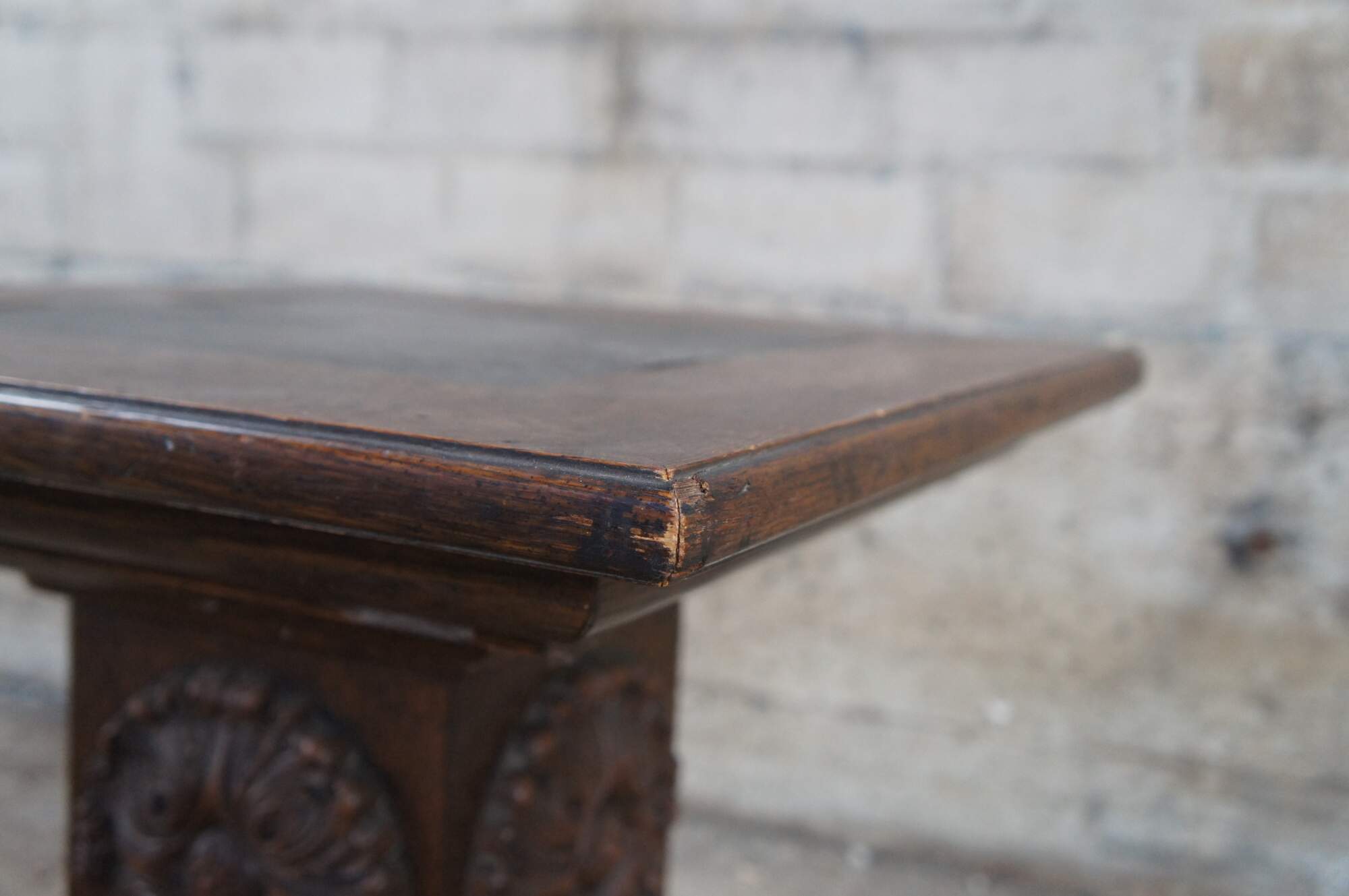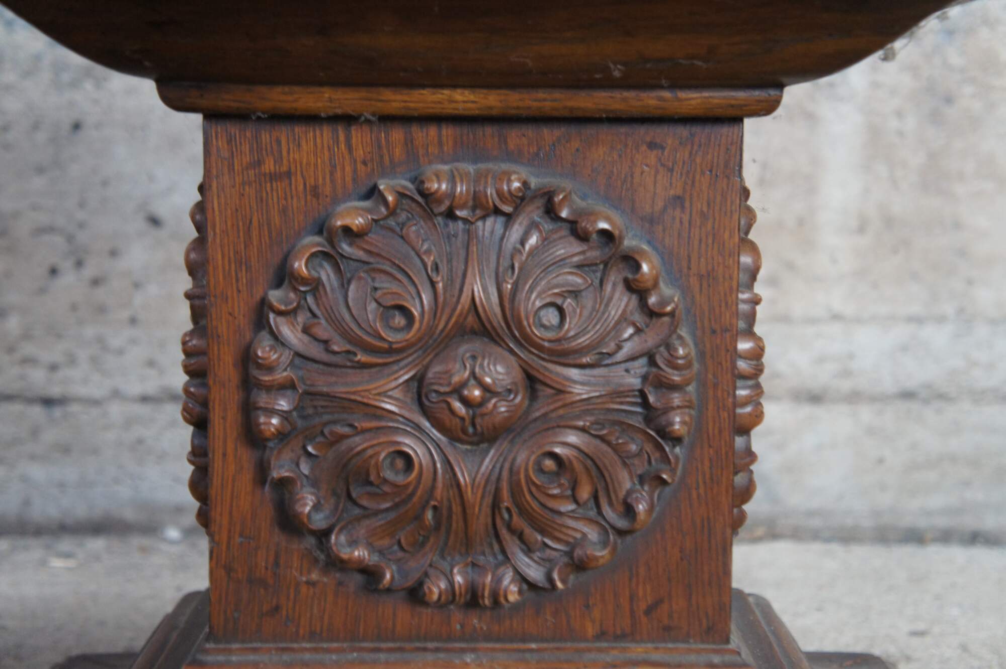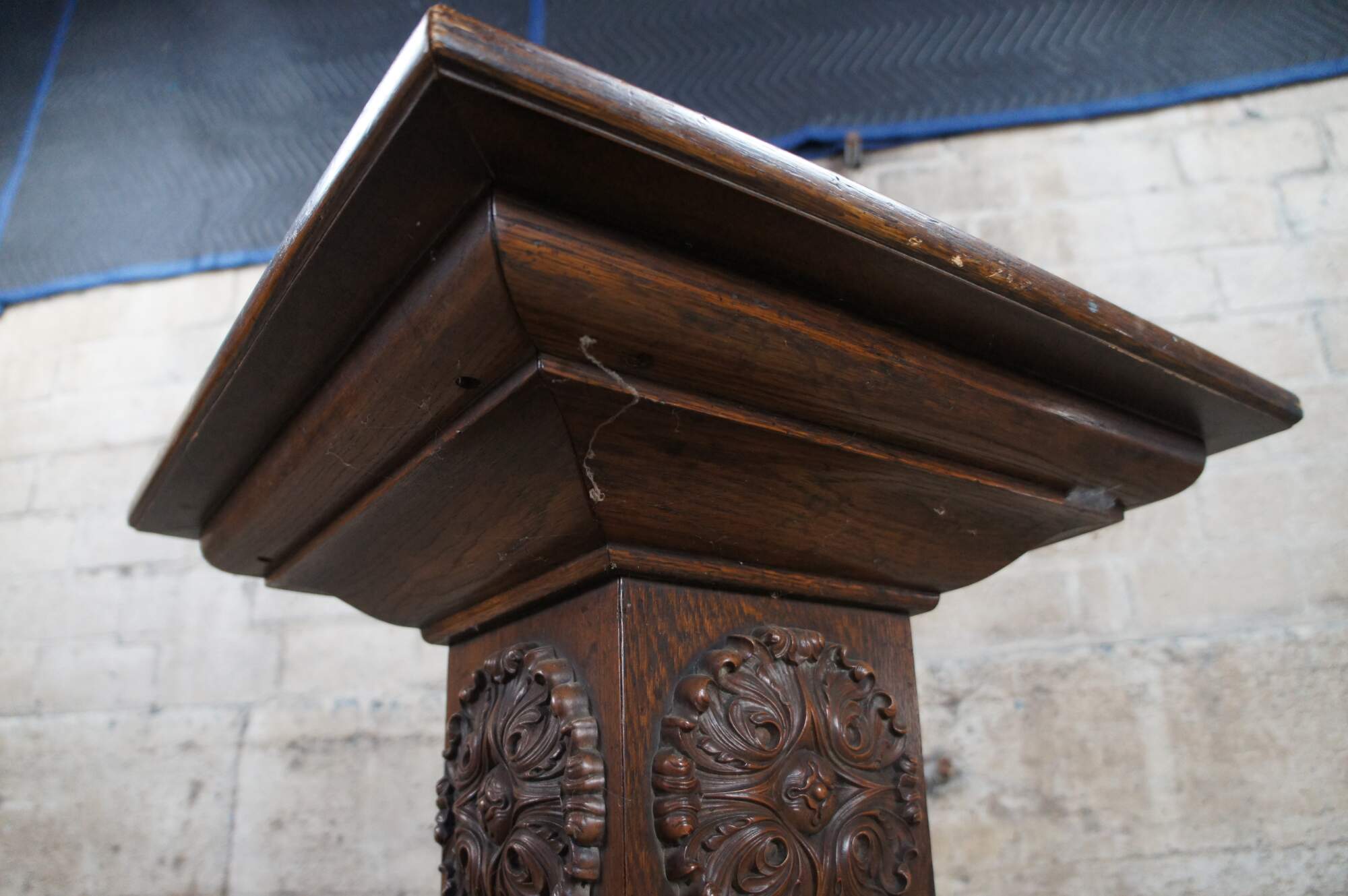 Pair of 1960s Drexel Grand Tour pedestal side tables. Made from oak with an inset slate top over a central column with round carved medallion and stepped plinth base. Marked along underside Heritage Grand Tour, 23-507-43. Great for use as end tables, pushed together for use as a coffee table or sculpture / plant stands.