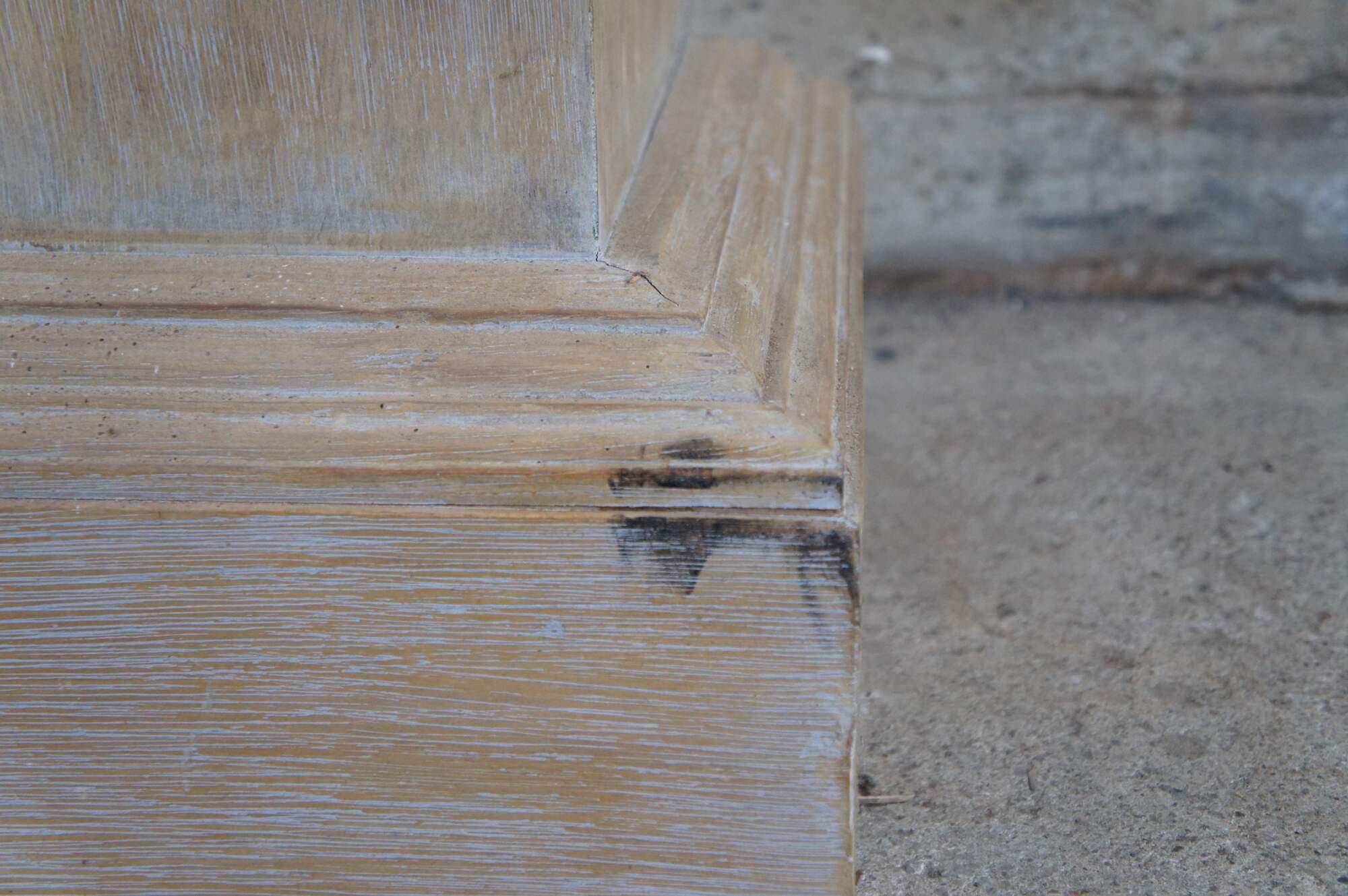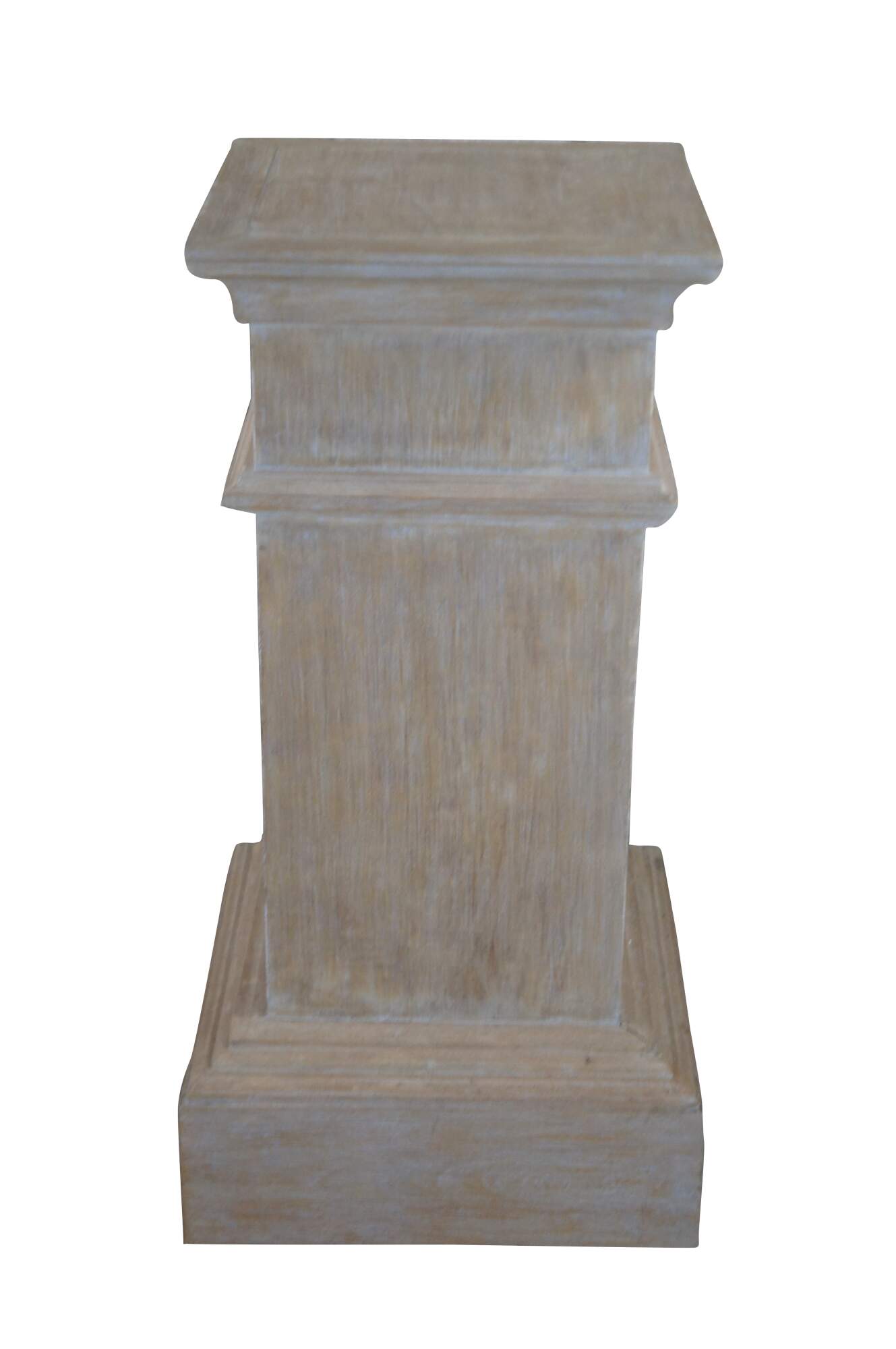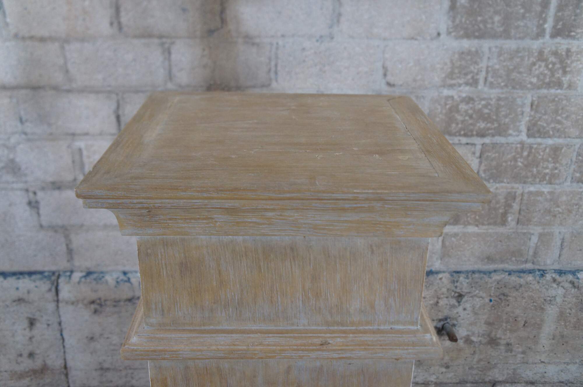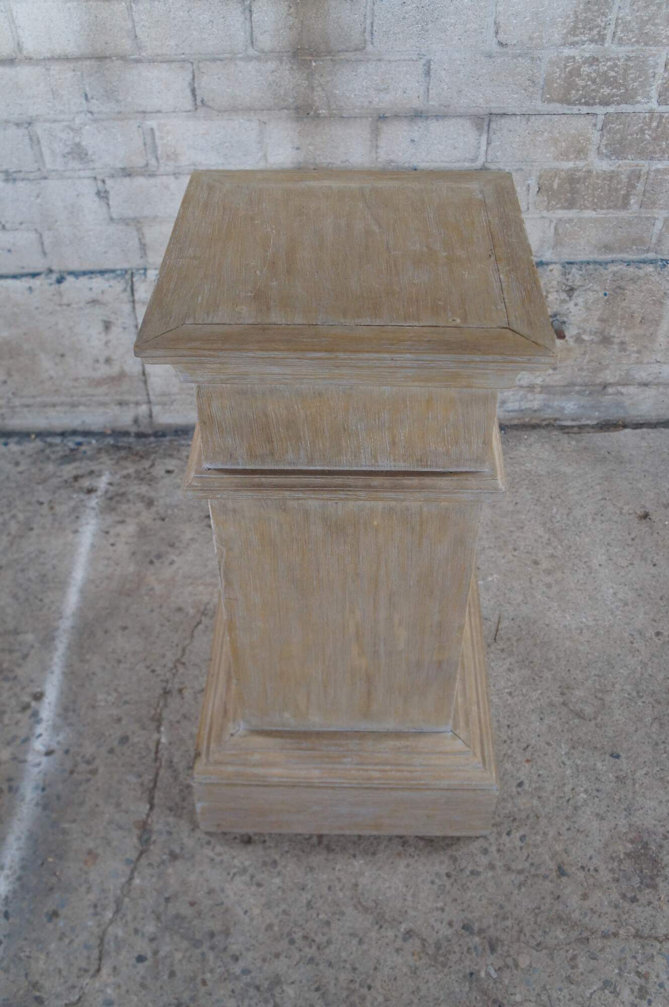 Early 21st Century White Washed Oak Pedestal. Great for use to display a plant or sculpture. Features a square form over plinth base.