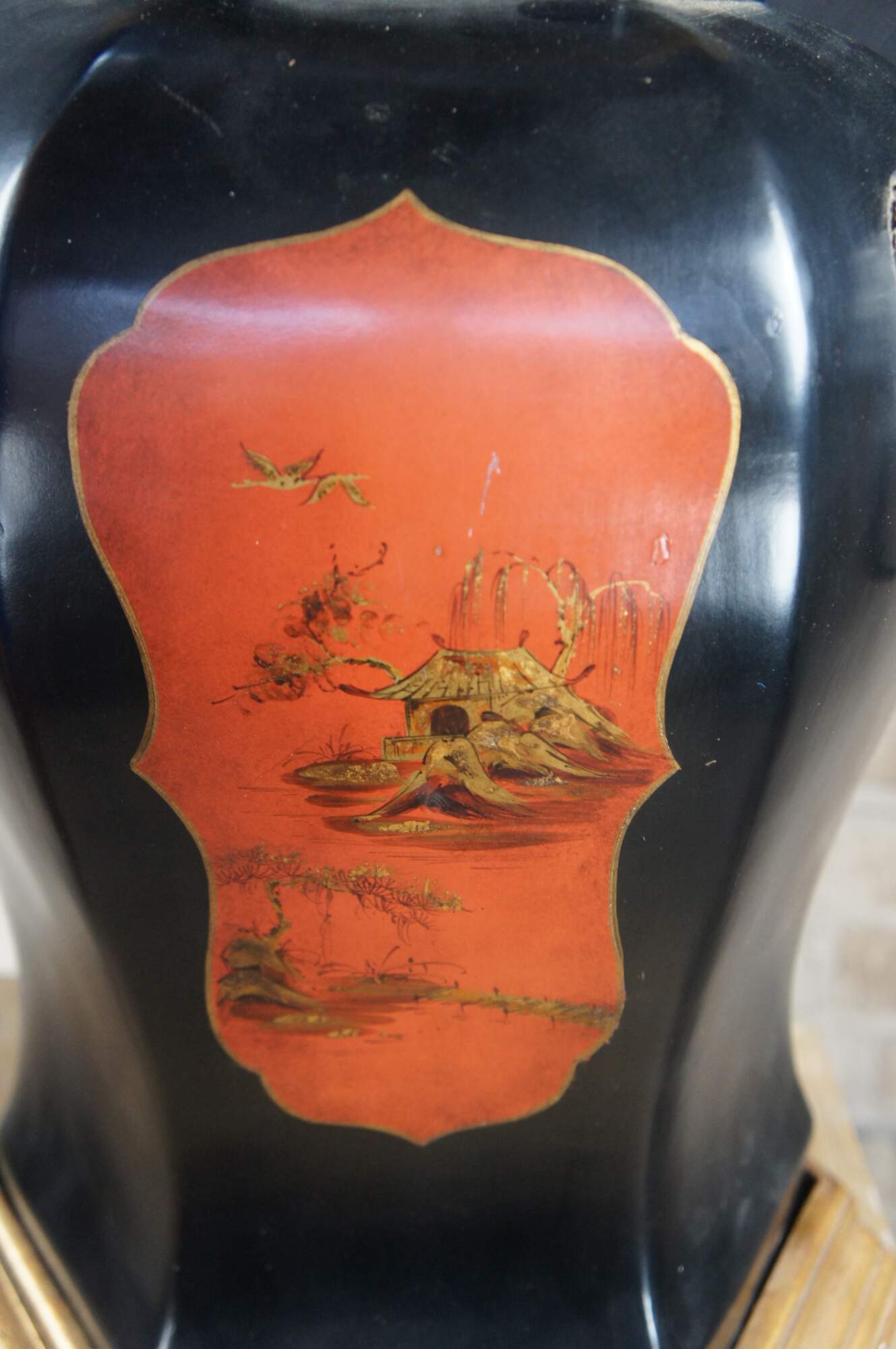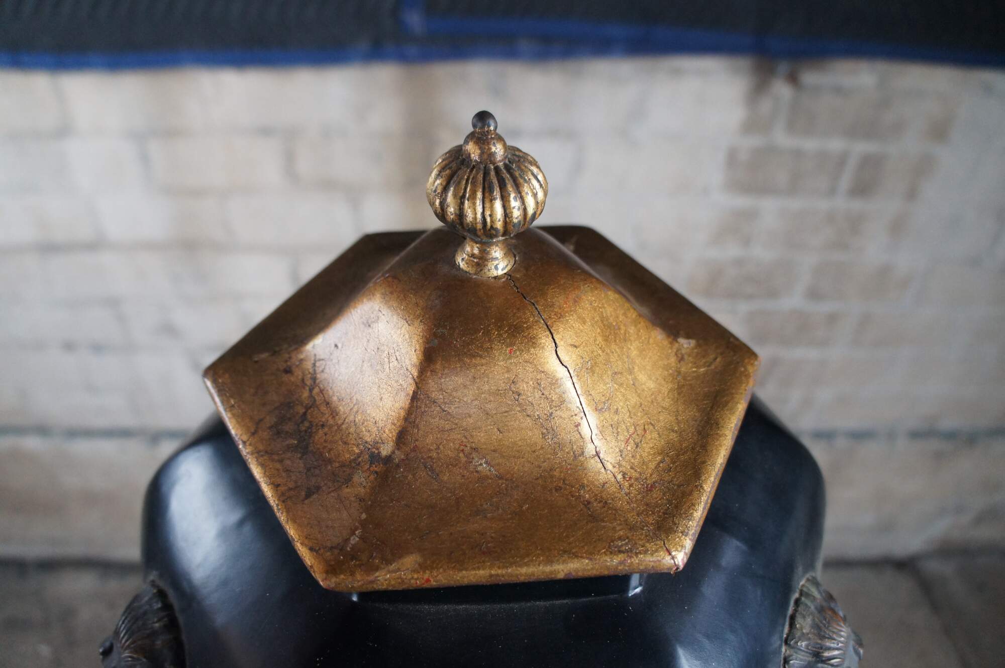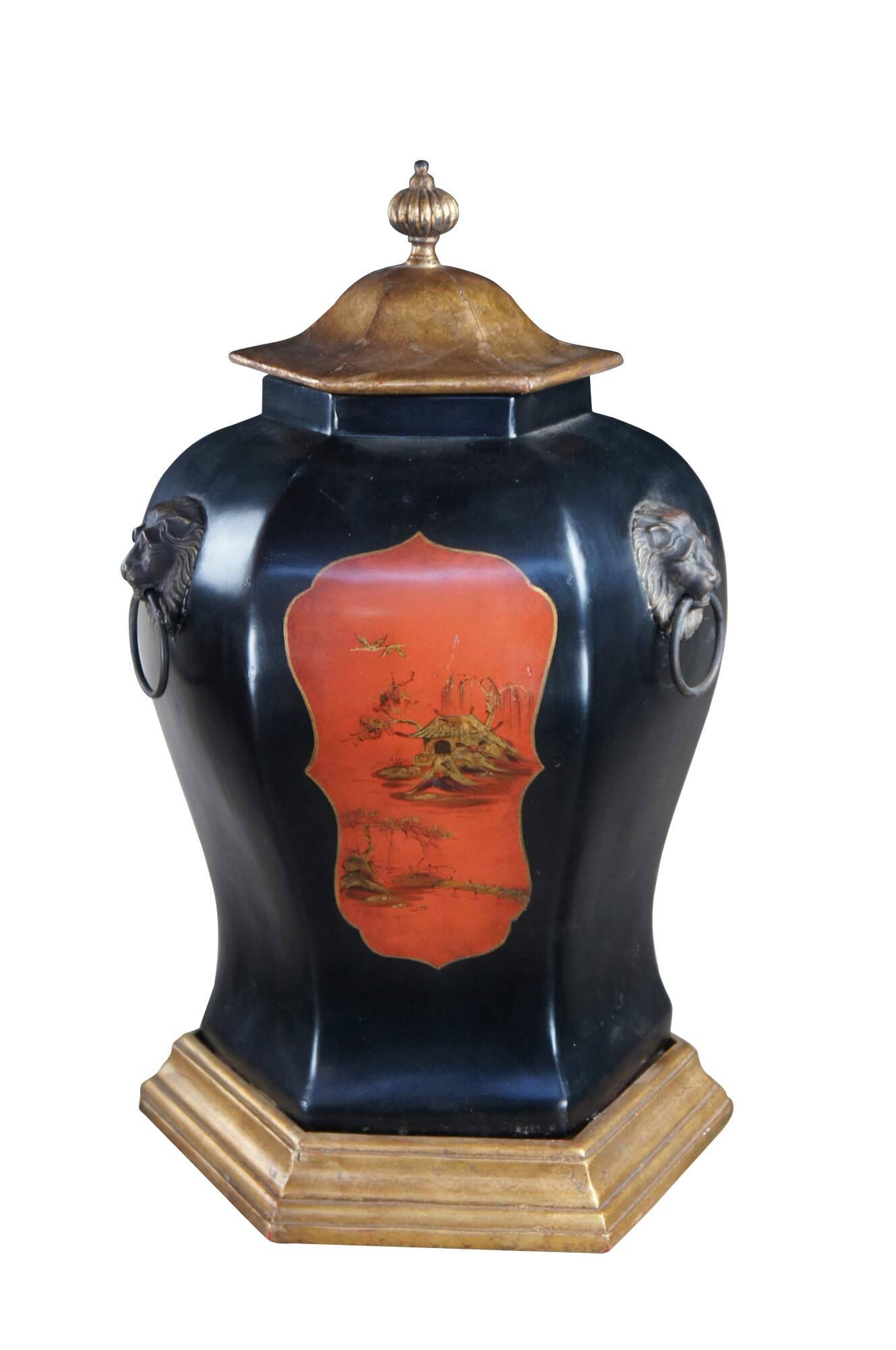 Ceramic Chinoiserie Lidded Ginger Jar Over Plinth Base. Features a ceramic body finished in black with red oriental geisha scene set between brass lion head knockers. The vase rests on a plinth base. Lid and base are wooden.