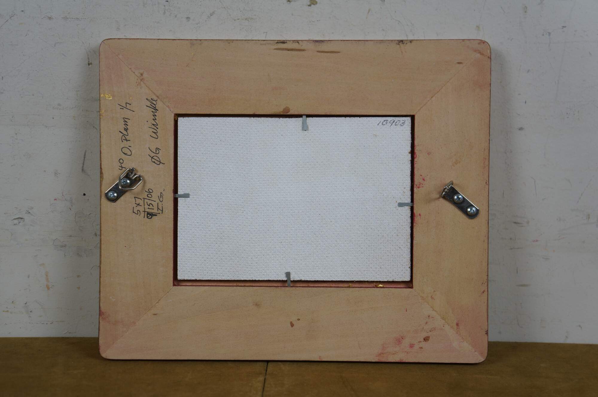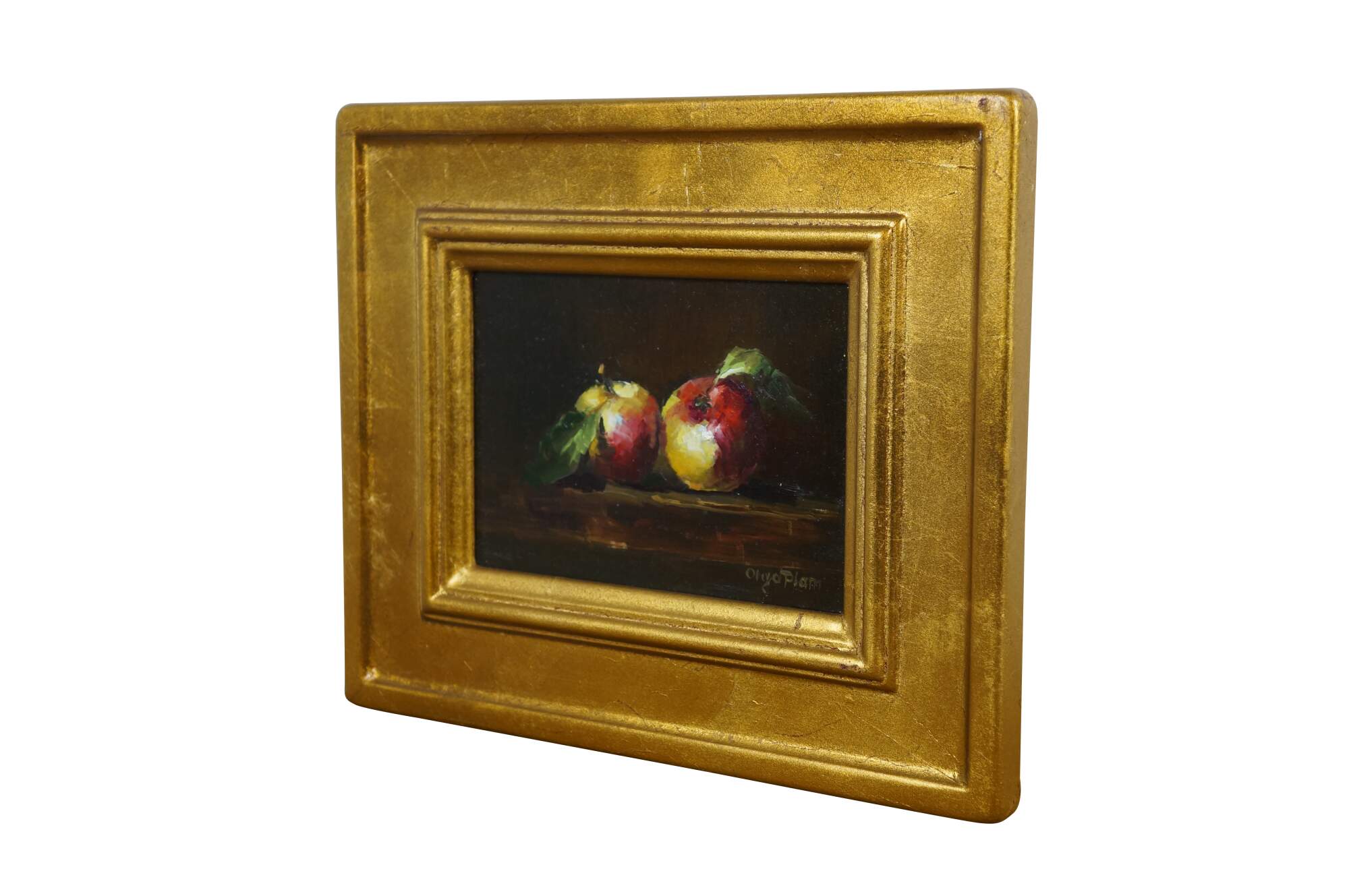 Early 21st century oil on board still life painting by Olga Plam, depicting a simple tableau of a pair of red and yellow apples on a table. Signed in lower right corner. Frame numbered 1/7. Dated 9/15/2006. Foil gilt wood frame with raised bevel.