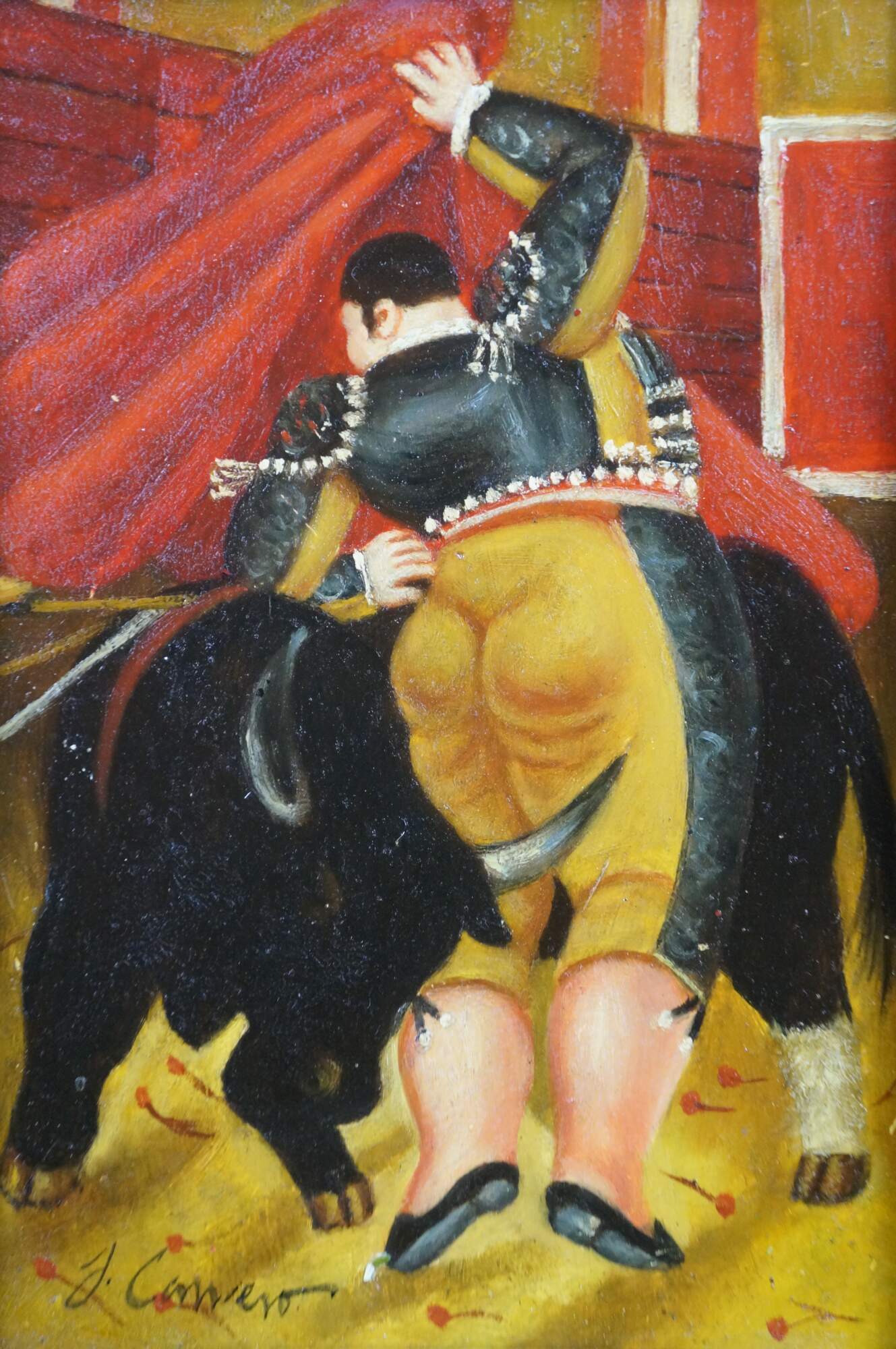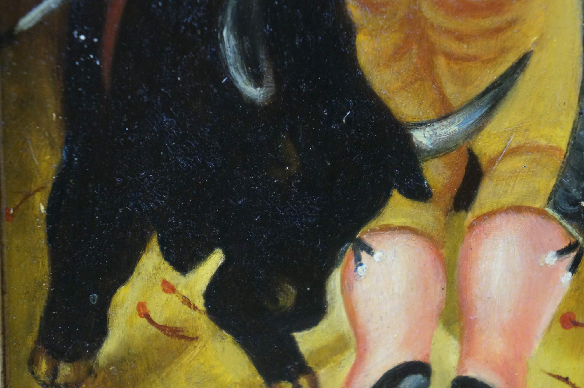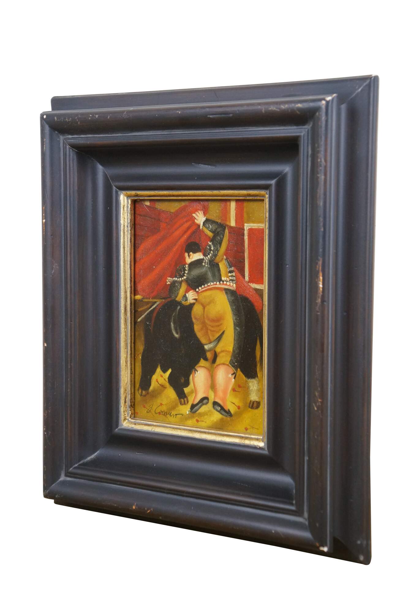 Late 20th century Timeless Treasures oil on board painting styled after Fernando Botero's "El Matador." Depicts a black bull dashing around the legs of a matador in gold and black as he swirls his red cape in the air. Signed in lower left corner. Includes Certificate of Authenticity Number: AFD131526. Beveled wood tone composite frame. Frame made in China.