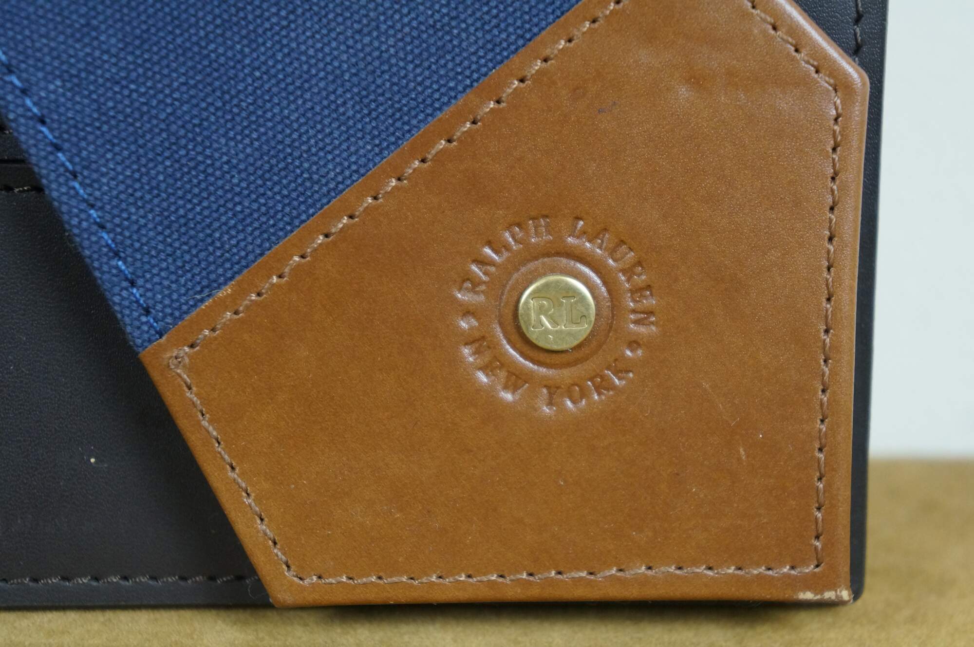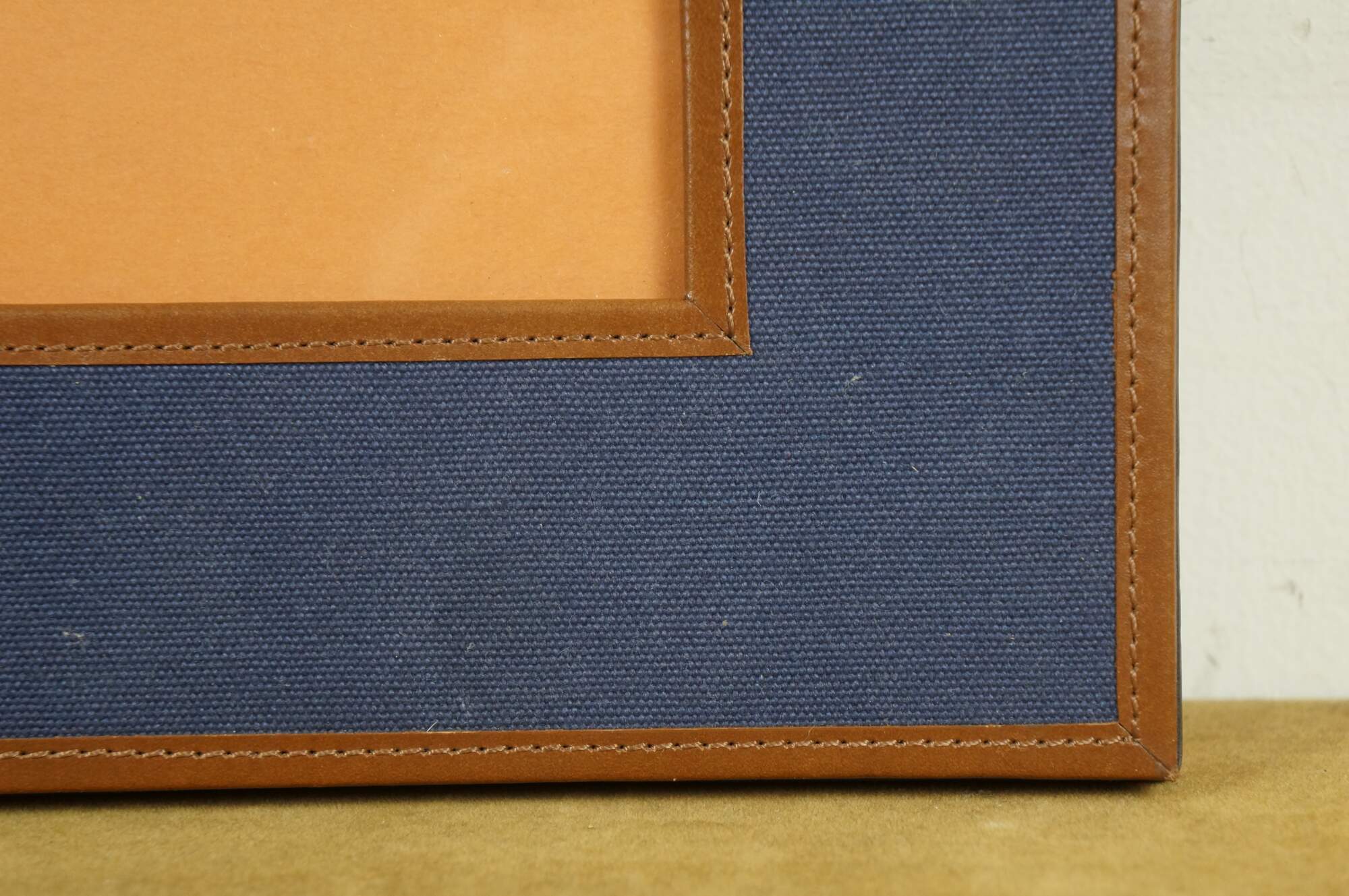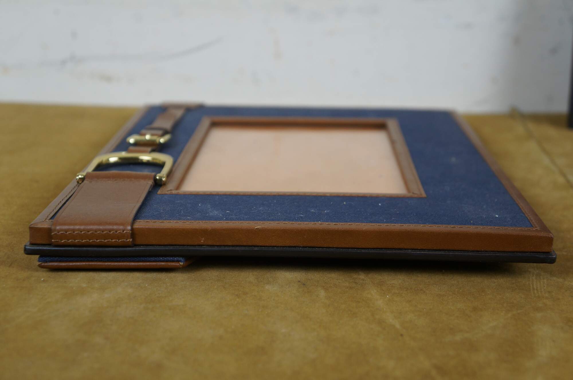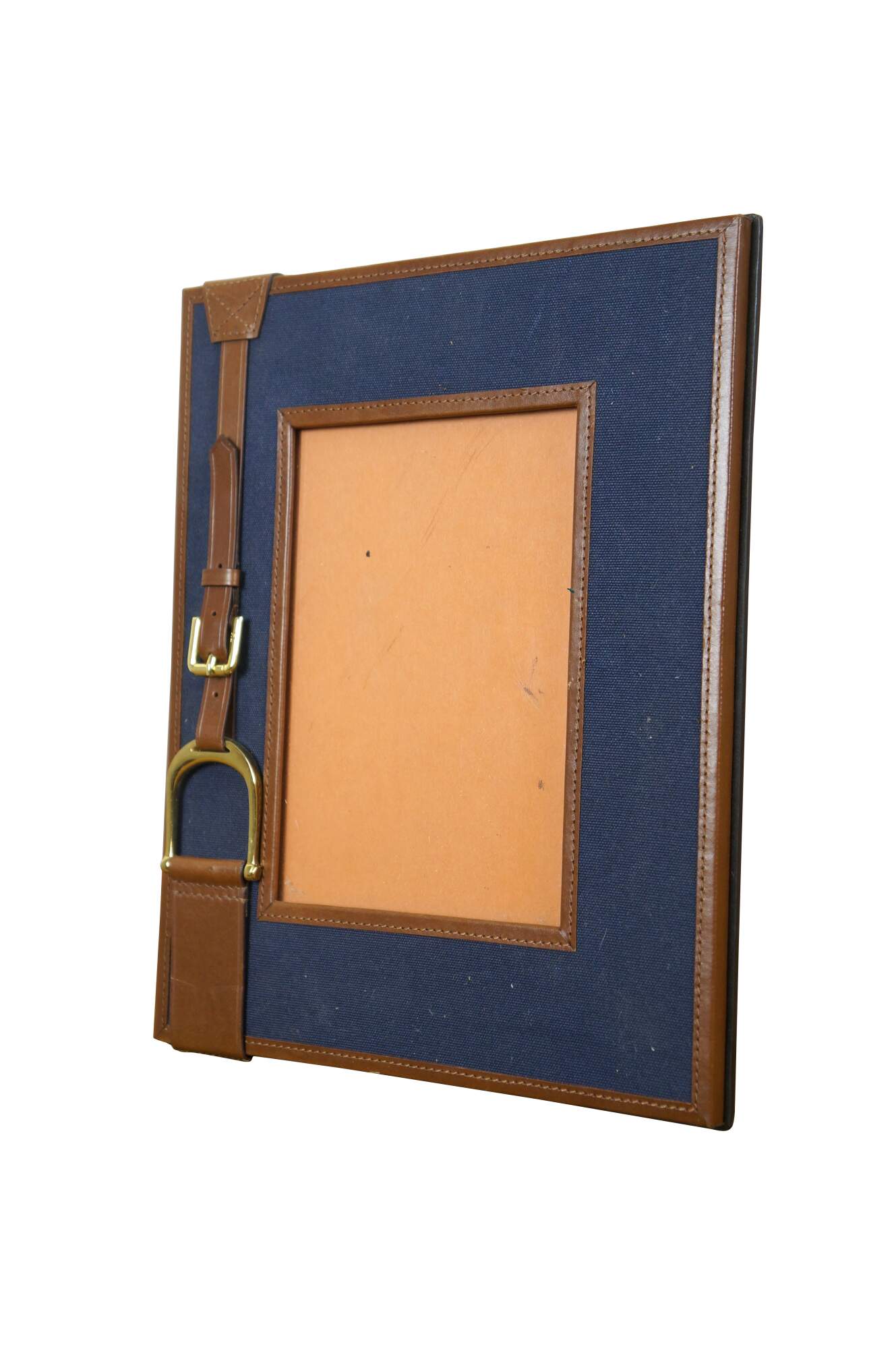Pair of two vintage Ralph Lauren Insley photo / picture frames. Navy blue canvas with brown leather trim and saddle strap with brass hardware. Rectangular frame, horizontal or vertical orientation; easel back. Made in India. MSRP $295 each.