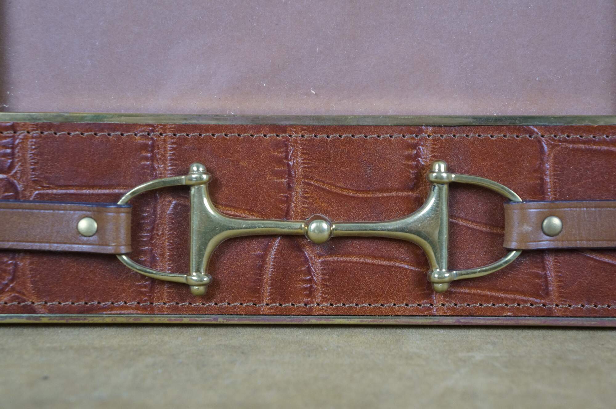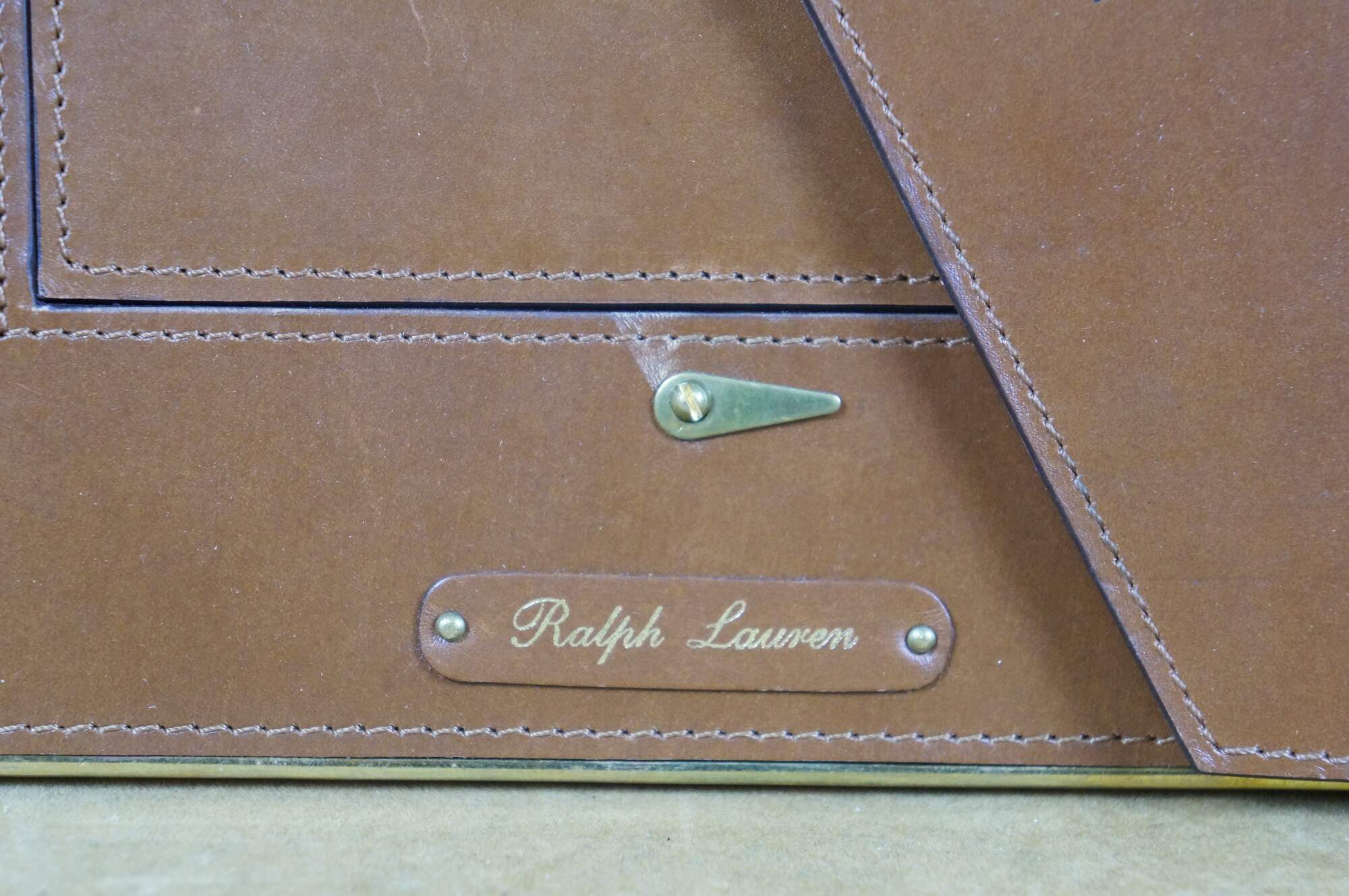 Pair of two vintage Ralph Lauren Webb photo / picture frames. Brown alligator / embossed leather with brass trim and horsebit accent. Rectangular frame, horizontal or vertical orientation; easel back.