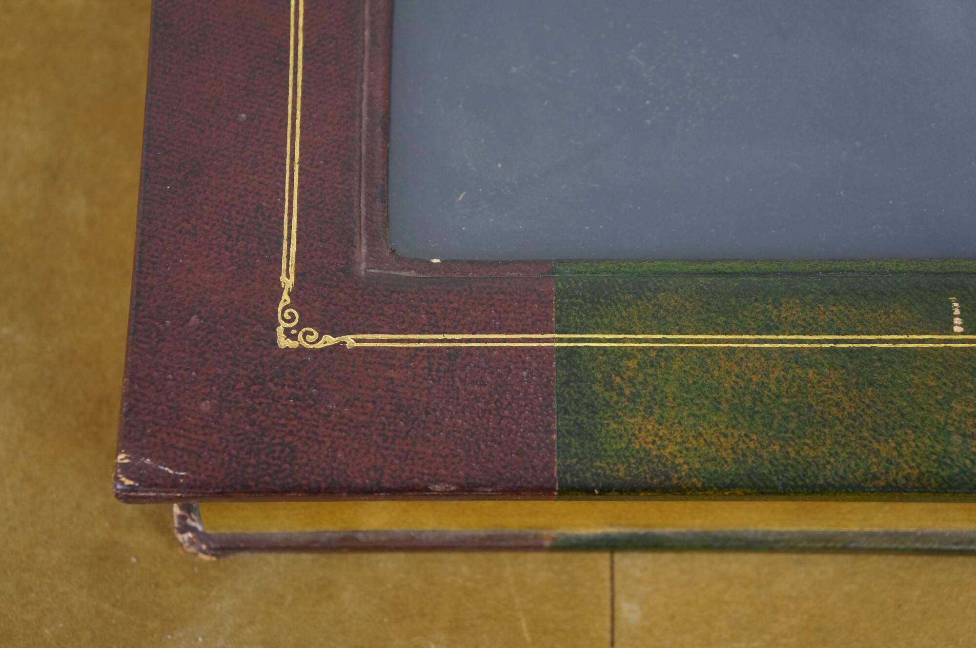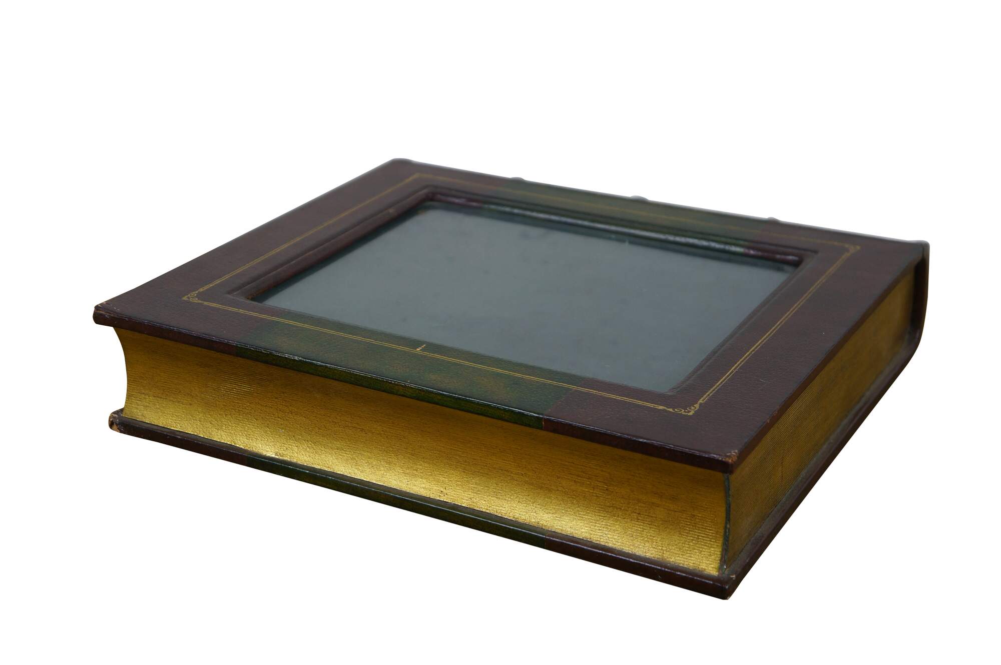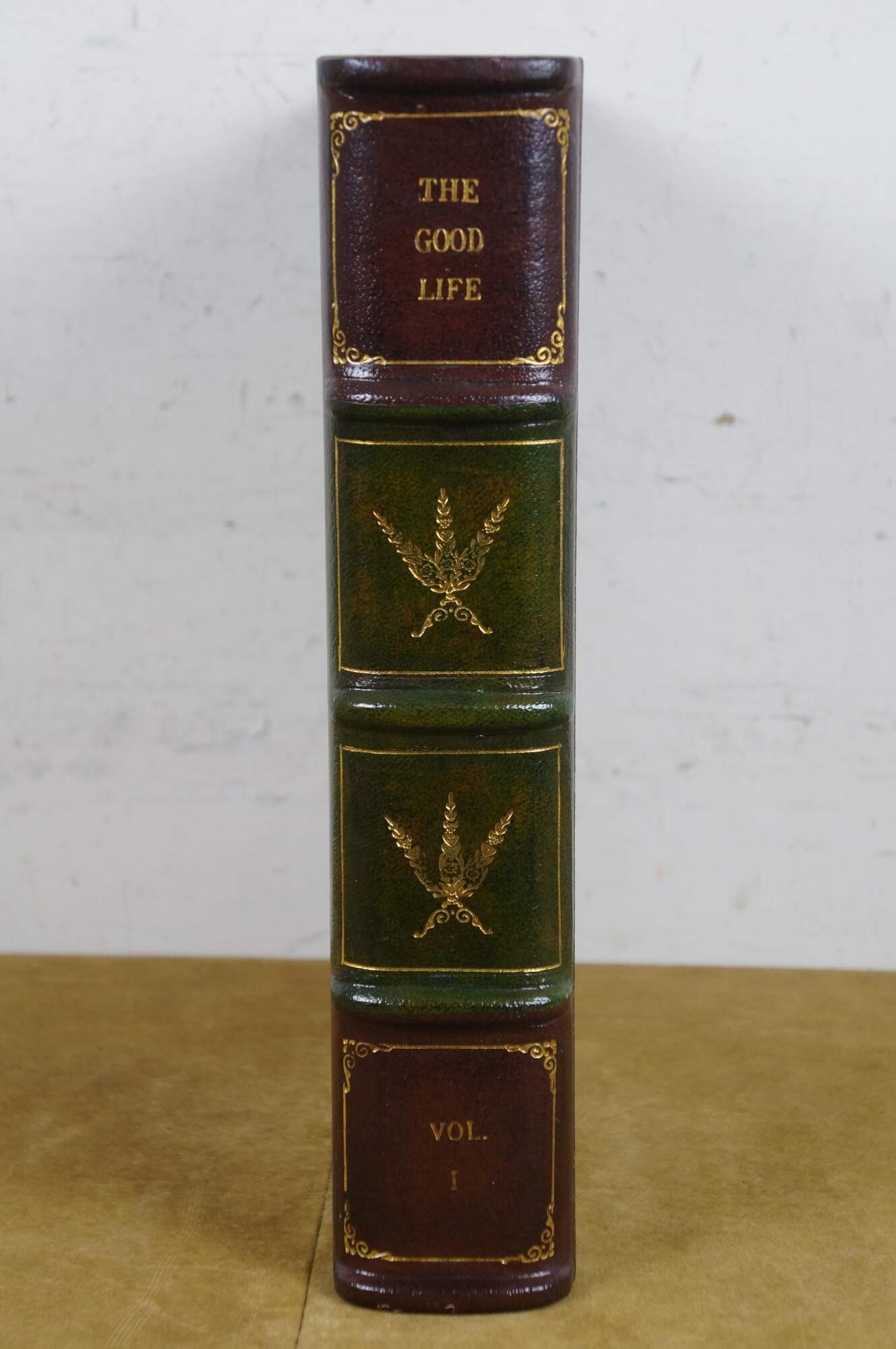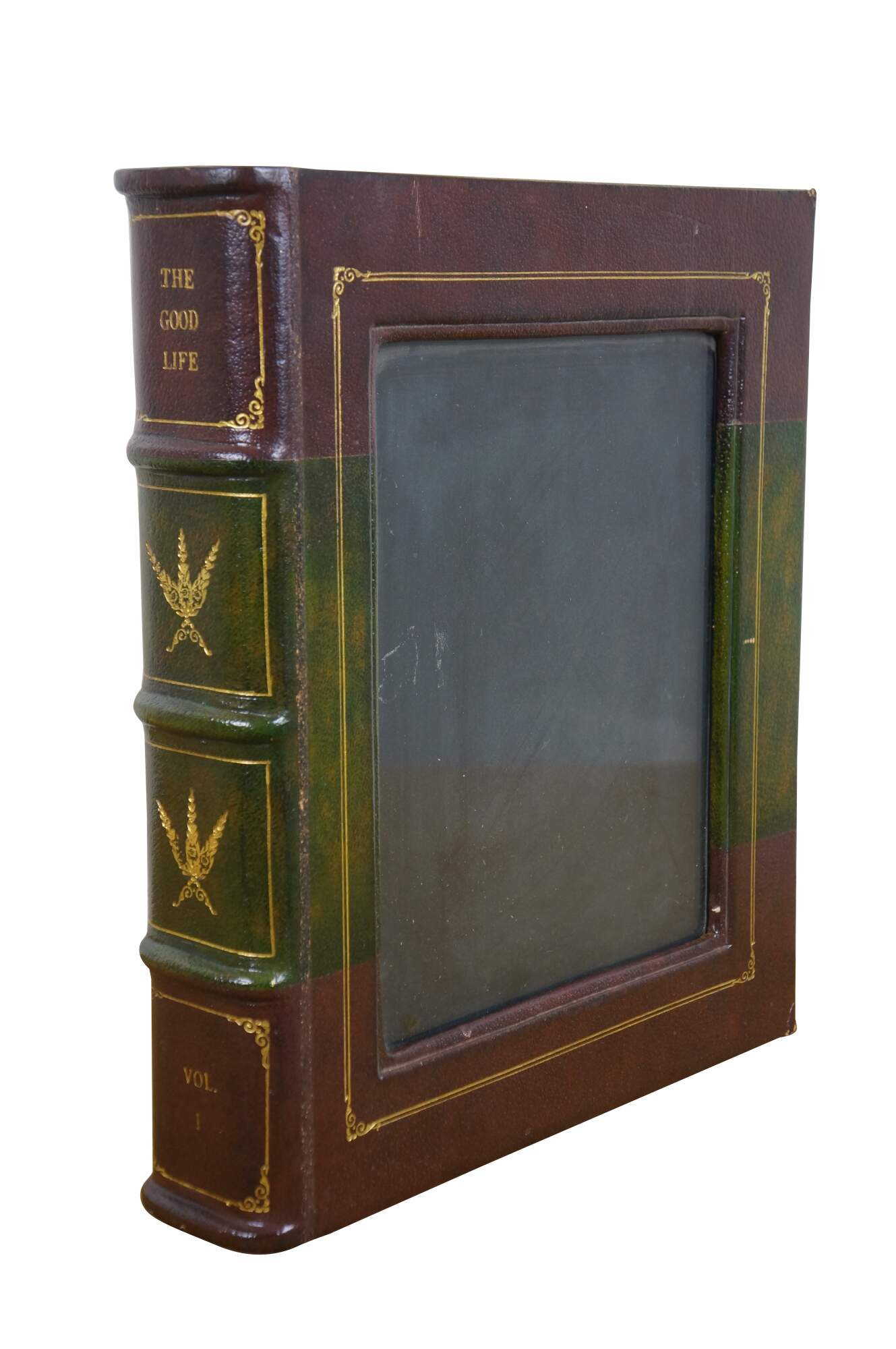 Late 20th century Maitland Smith faux book trinket / keepsake box, emulating "The Good Life Vol. I" bound in brown and green tooled and gilded leather and featuring a photo / picture frame on the front.