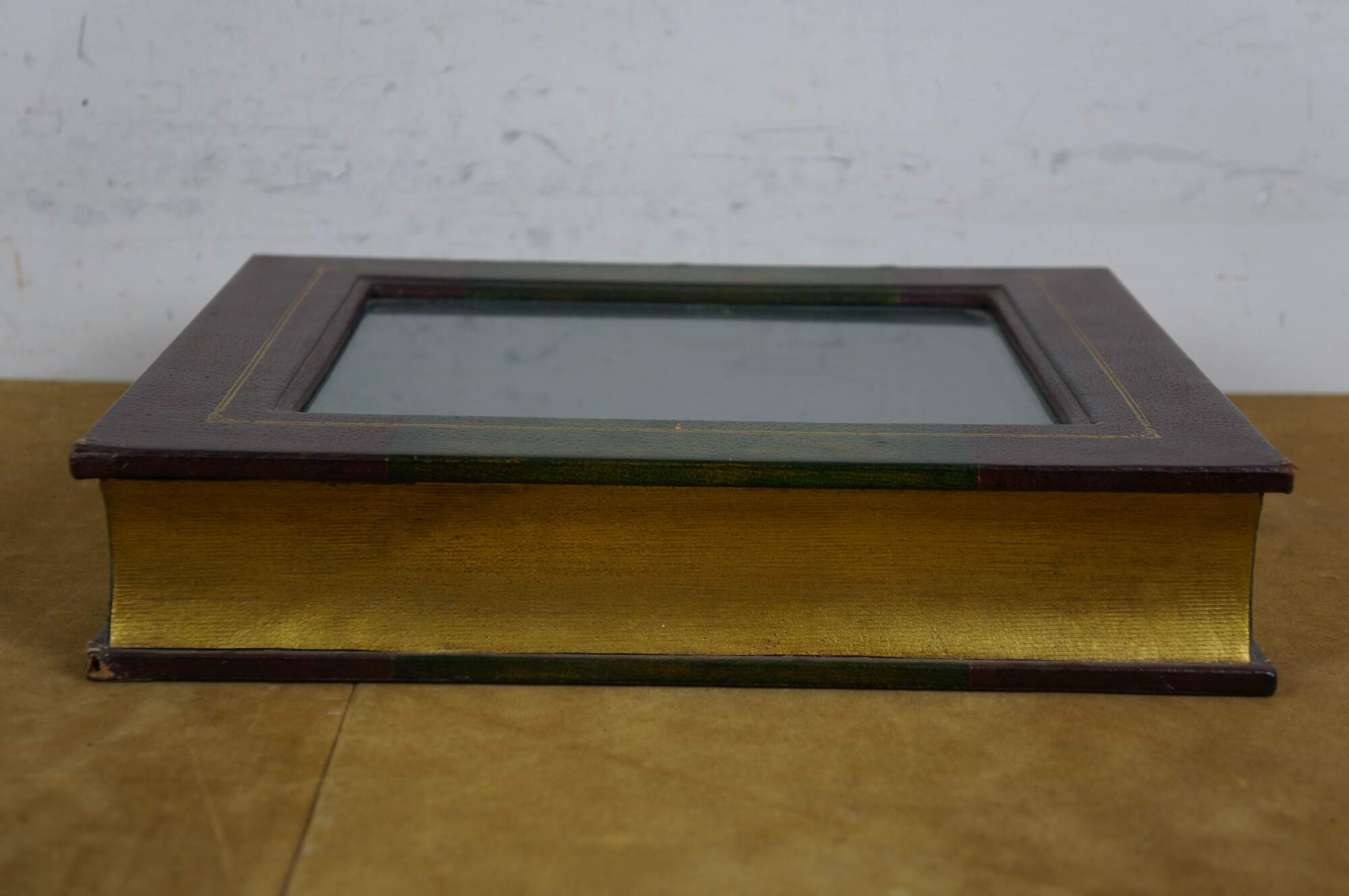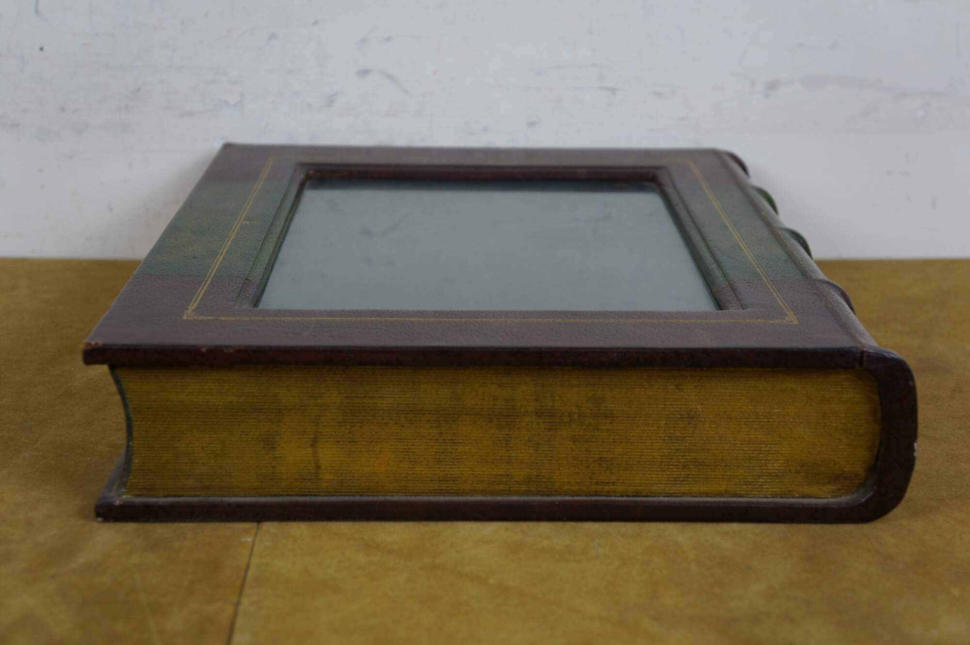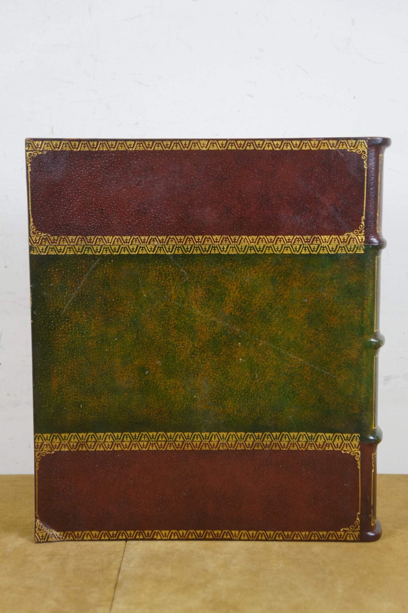 Late 20th century Maitland Smith faux book trinket / keepsake box, emulating "The Good Life Vol. I" bound in brown and green tooled and gilded leather and featuring a photo / picture frame on the front.