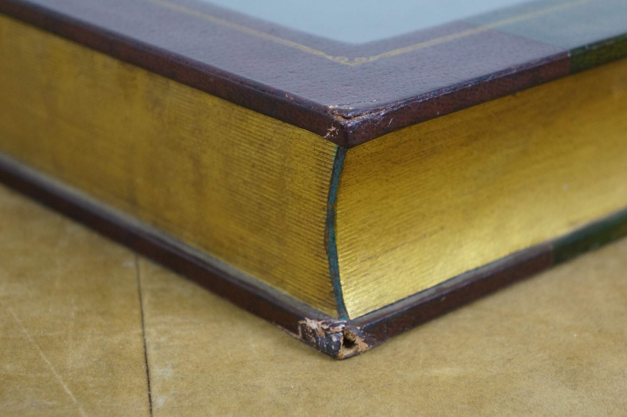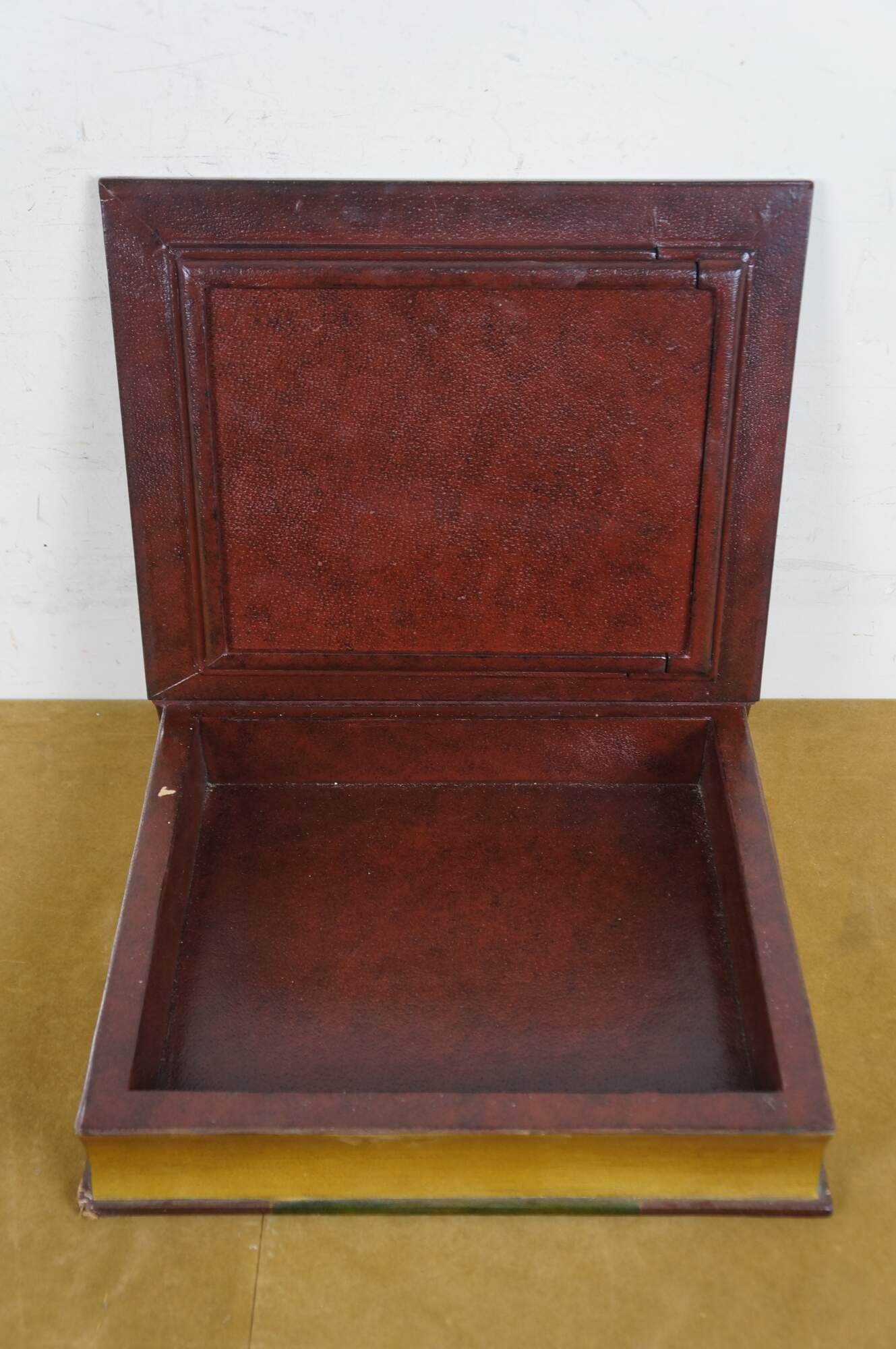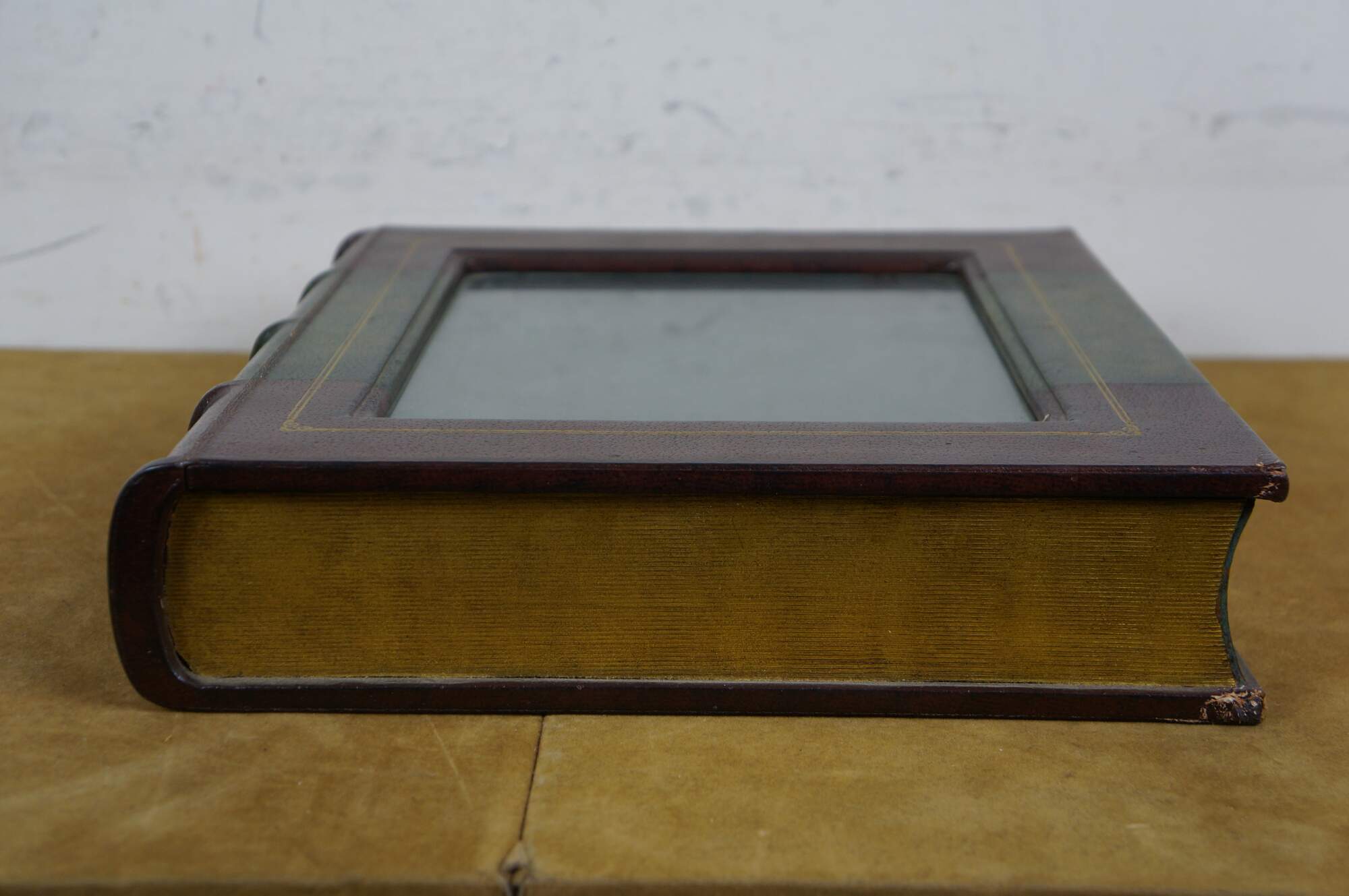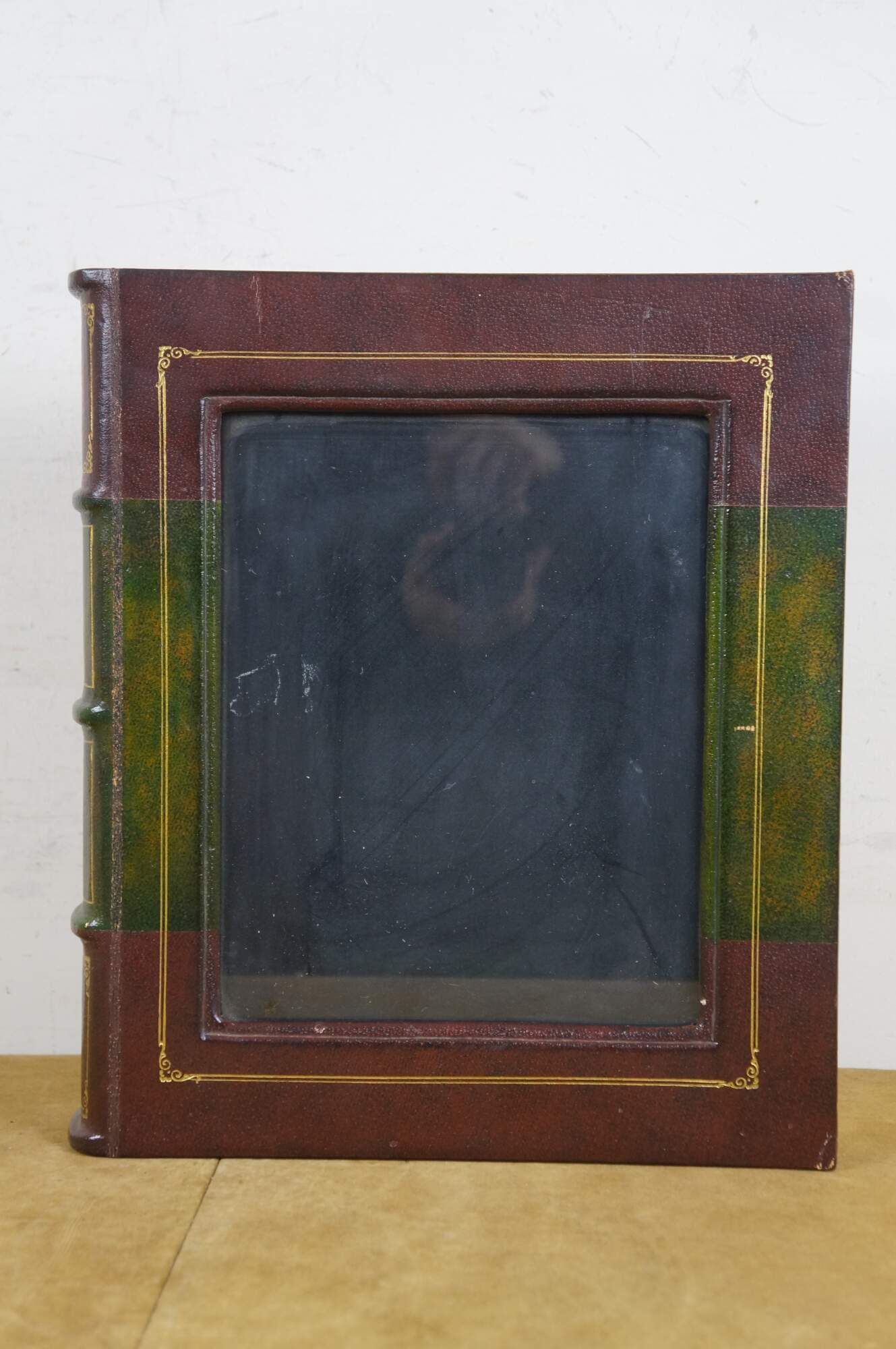 Late 20th century Maitland Smith faux book trinket / keepsake box, emulating "The Good Life Vol. I" bound in brown and green tooled and gilded leather and featuring a photo / picture frame on the front.