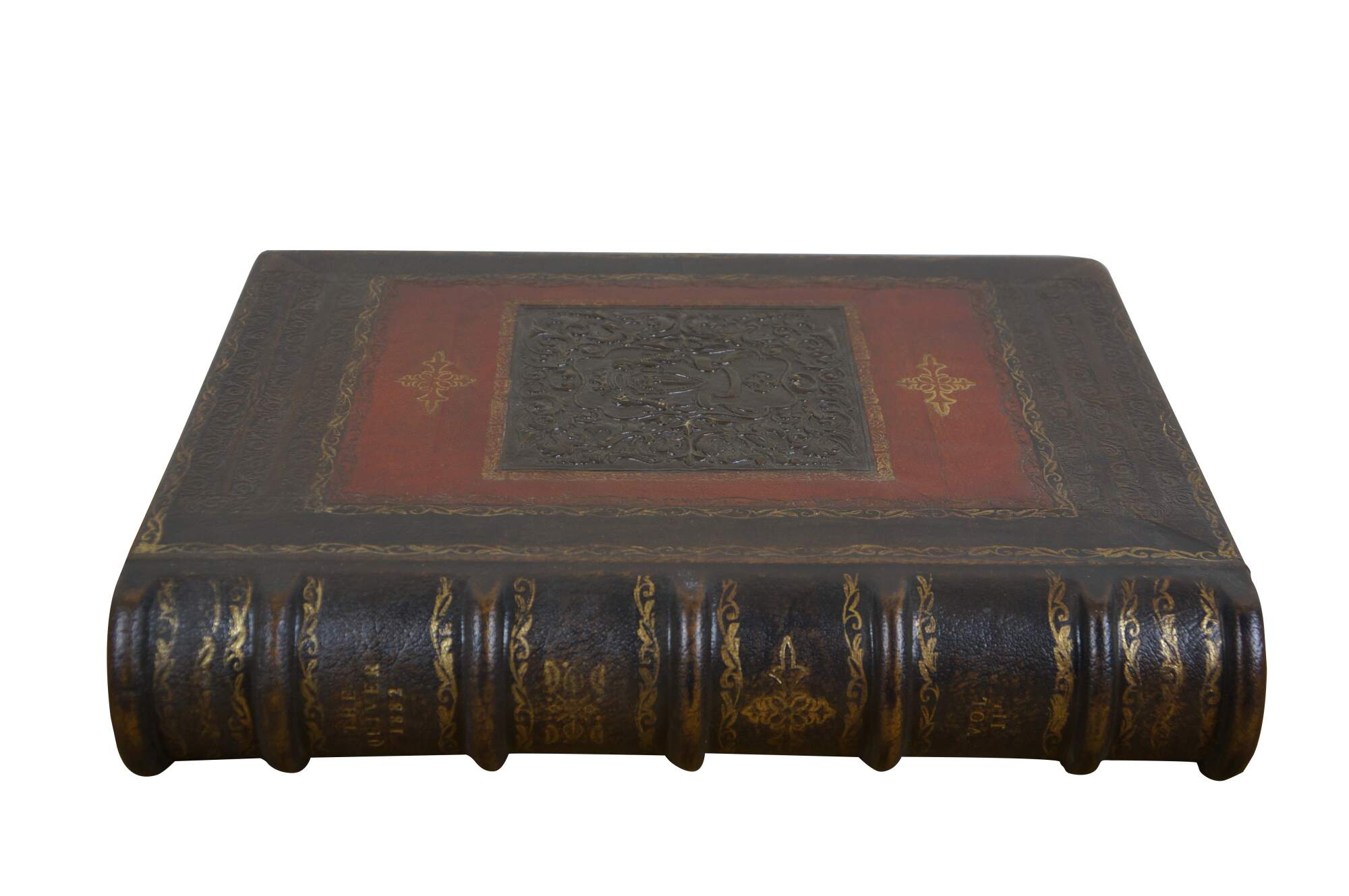 Vintage Theodore Alexander faux book trinket / keepsake box emulating a copy of The Quiver 1882 bound in red and dark brown tooled and gilded leather, with a embossed brass plate on the front, featuring a coat of arms surrounded by swirling foliate vines. Item Number: 1133.053. Hand Made in Vietnam.