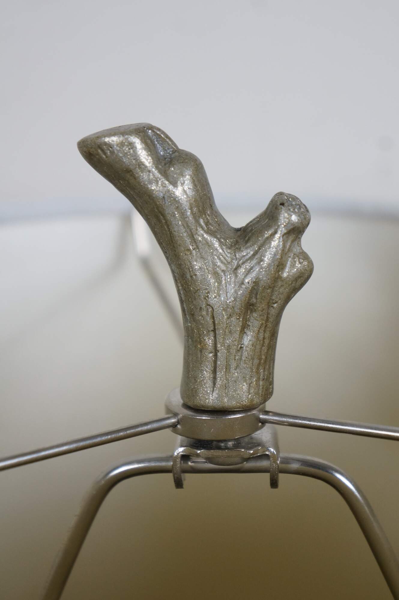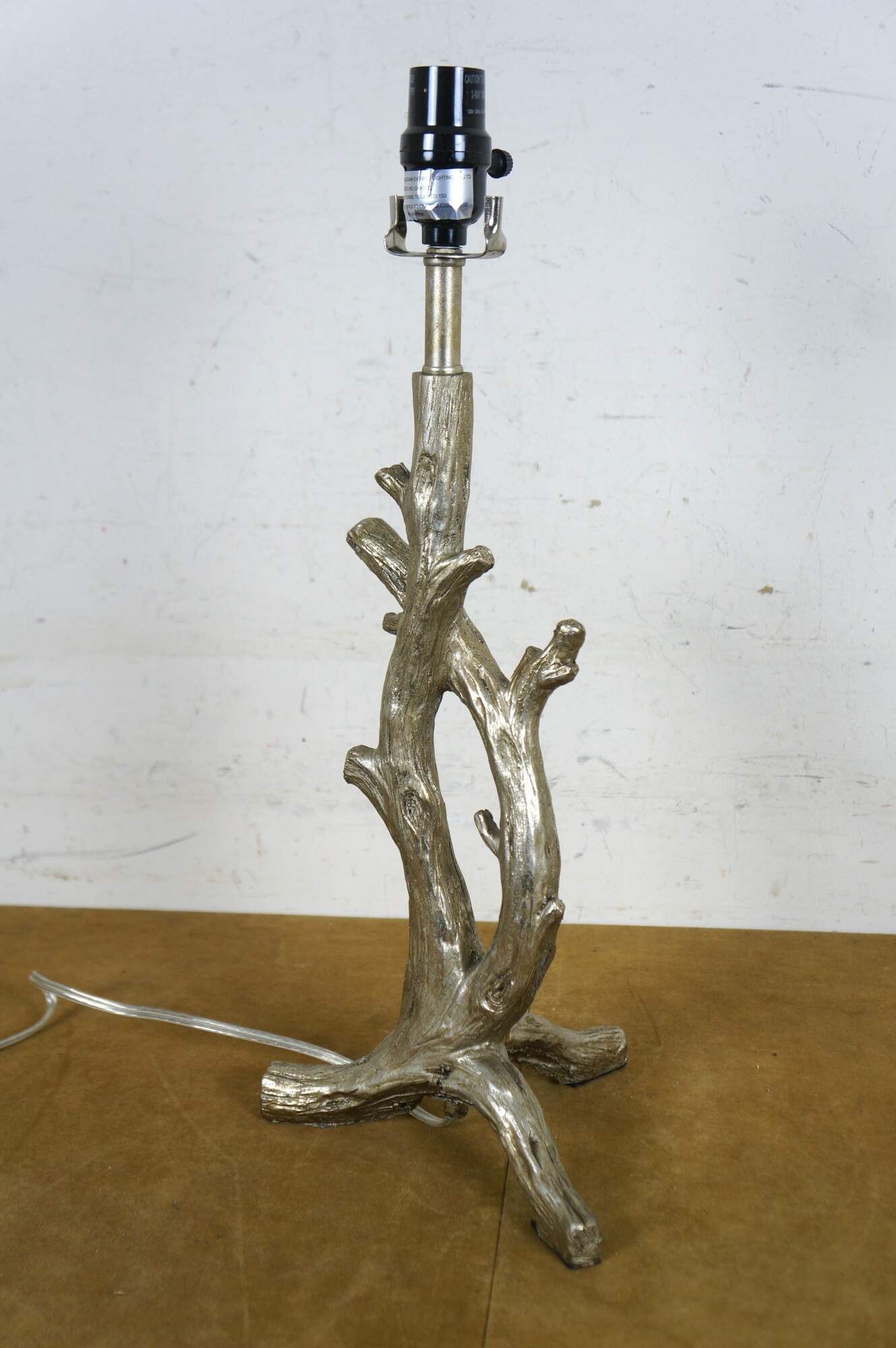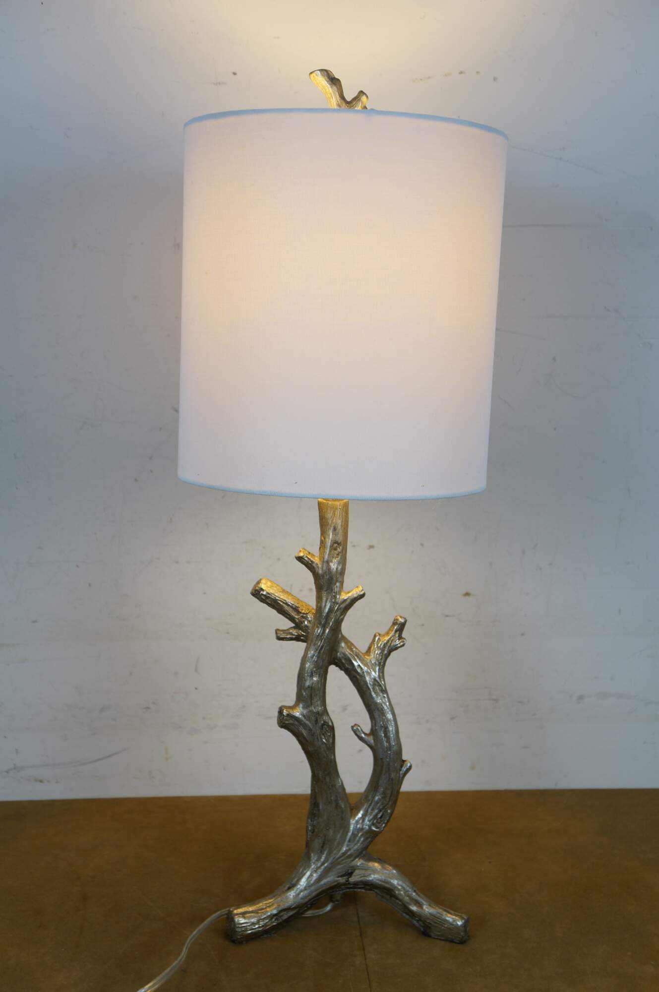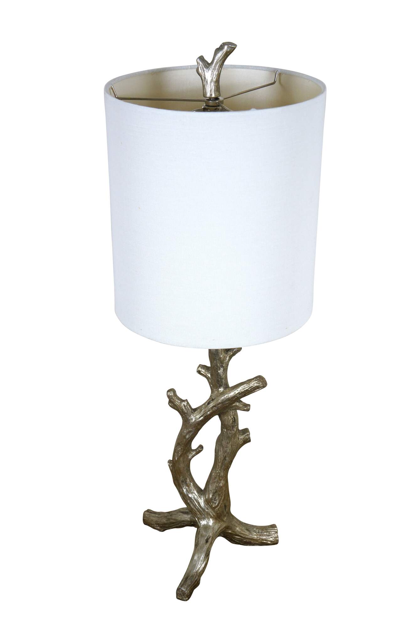 Early 21st century twisted tree branch shaped table lamp. Made of resin with painted silver finish. Includes harp, branch shaped finial, and white fabric shade. Dongguan Everred Lighting Co Ltd. Model No: CHX1652. Made in China. Produced circa 2014. Linen shade.