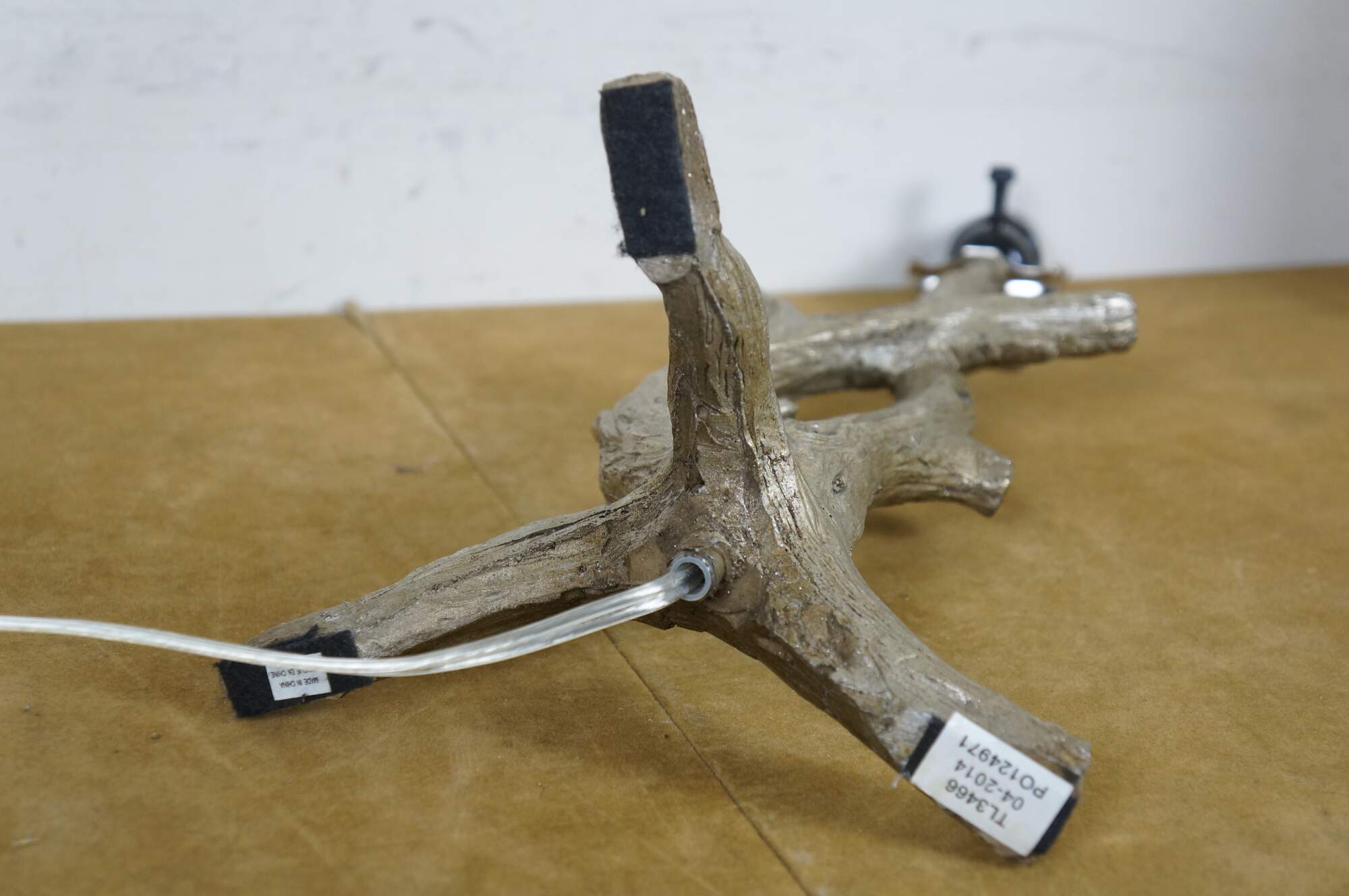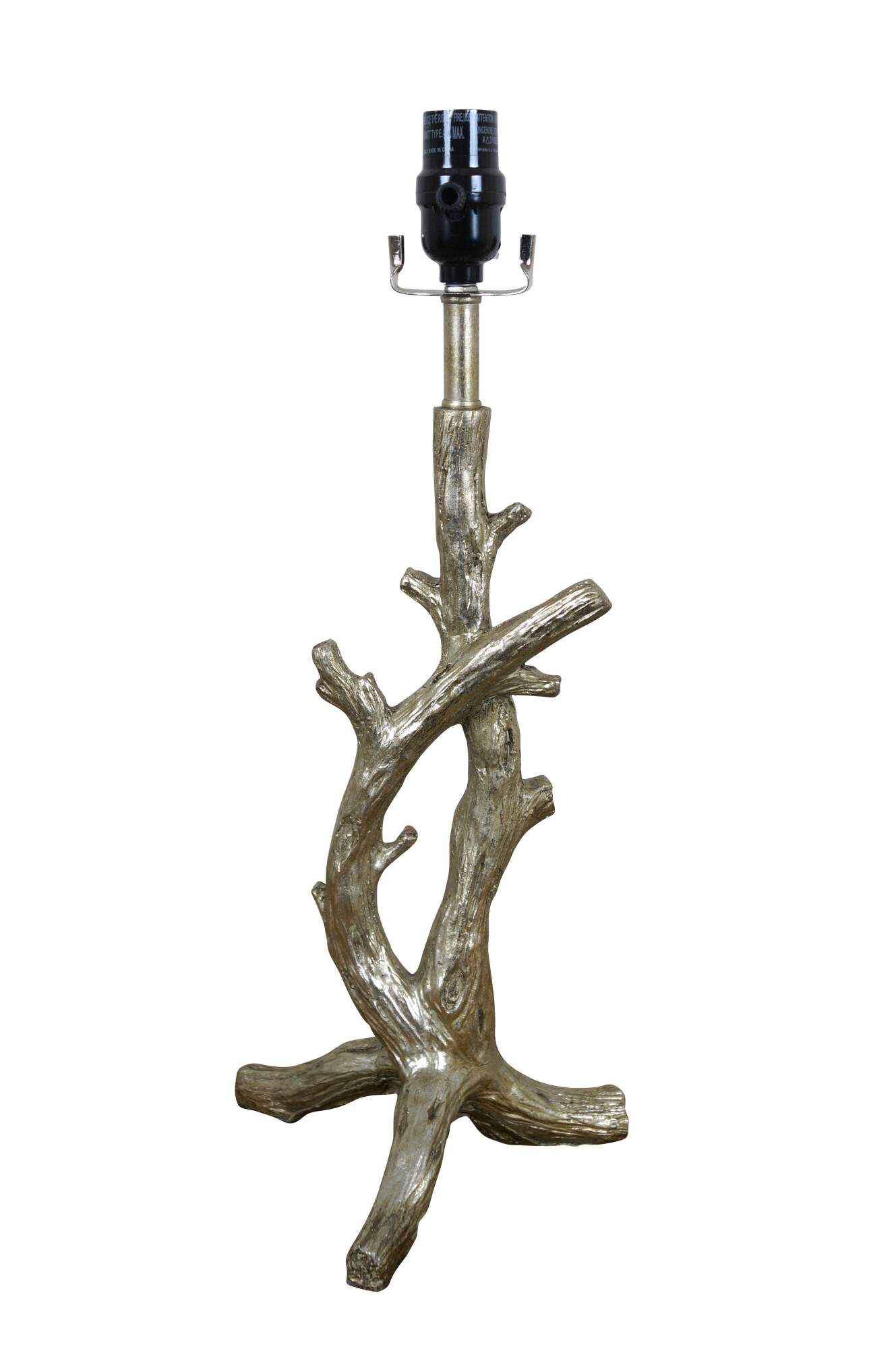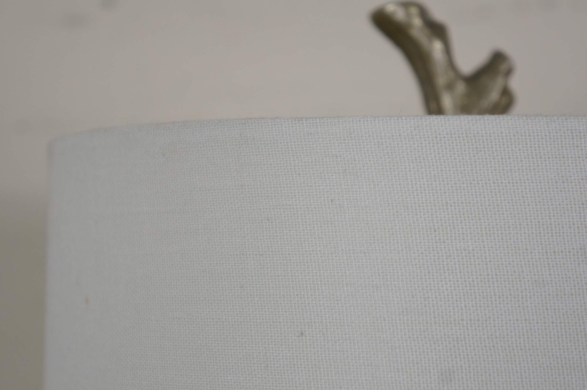 Early 21st century twisted tree branch shaped table lamp. Made of resin with painted silver finish. Includes harp, branch shaped finial, and white fabric shade. Dongguan Everred Lighting Co Ltd. Model No: CHX1652. Made in China. Produced circa 2014. Linen shade.