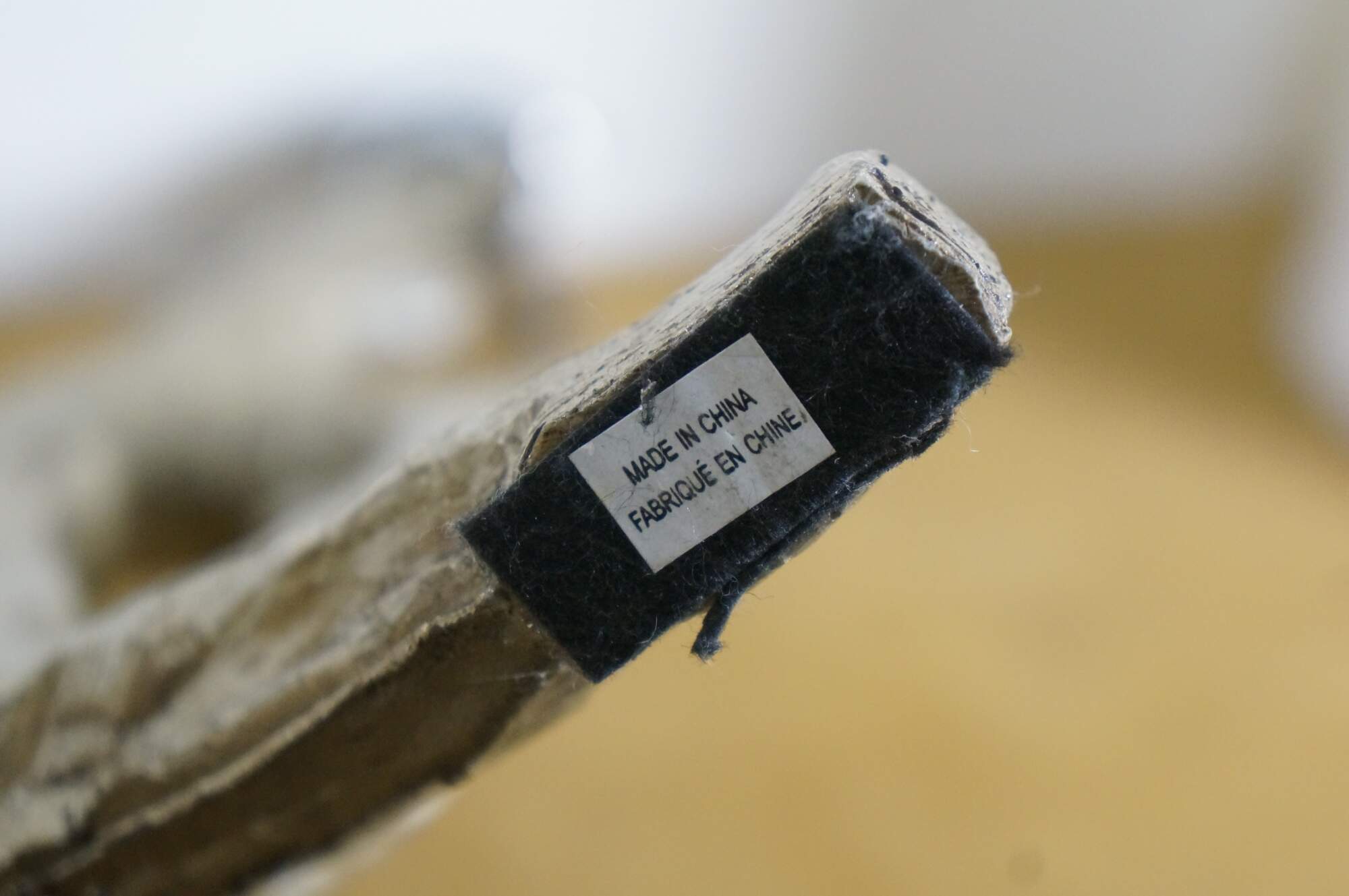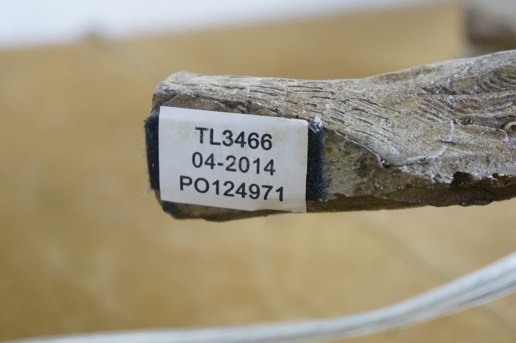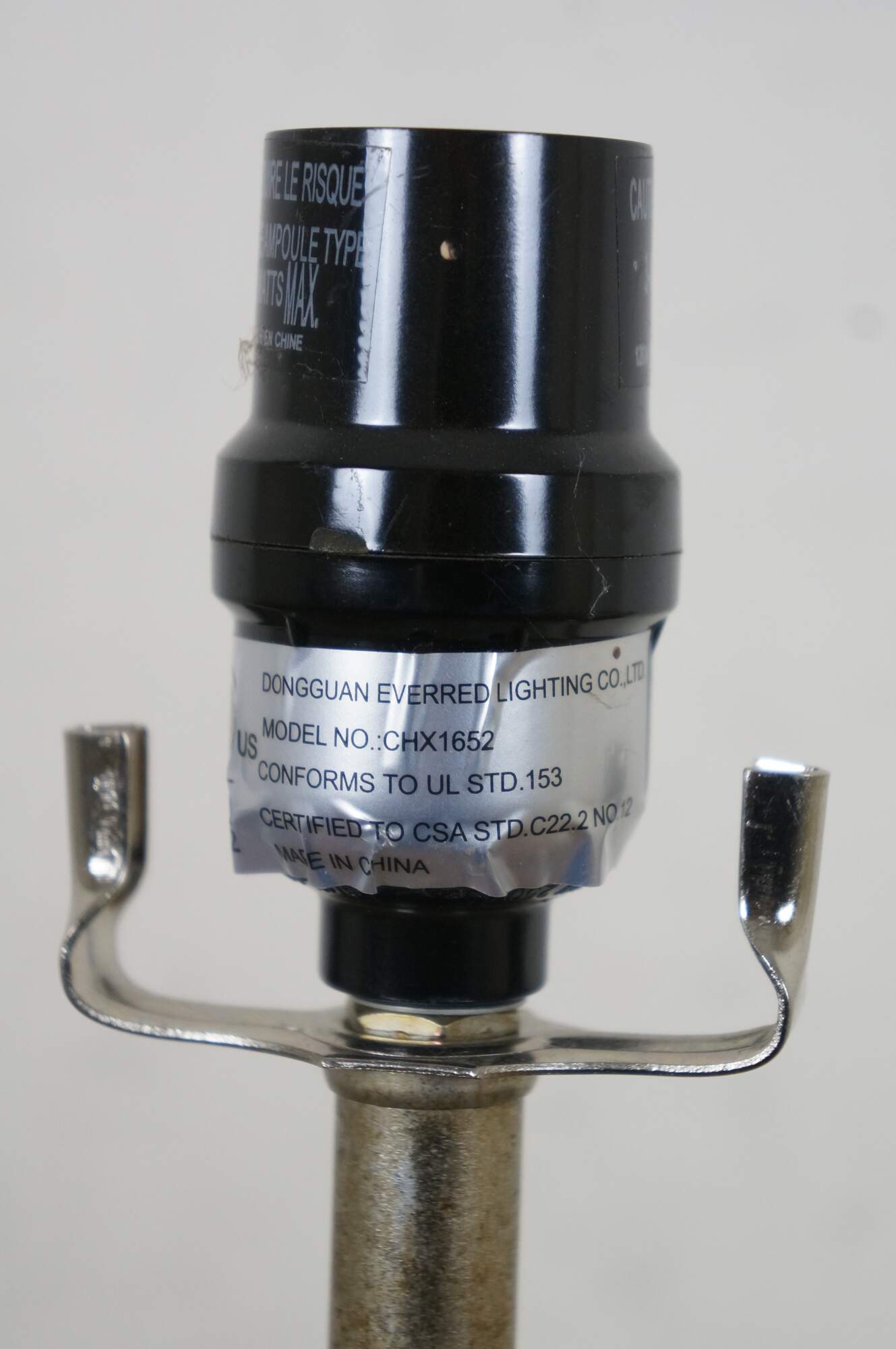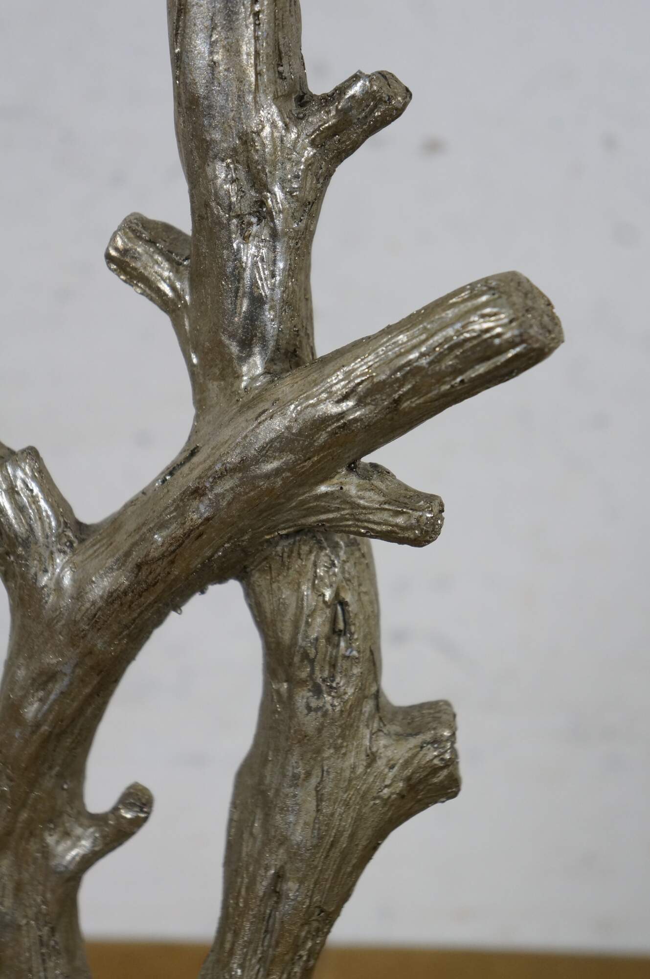 Early 21st century twisted tree branch shaped table lamp. Made of resin with painted silver finish. Includes harp, branch shaped finial, and white fabric shade. Dongguan Everred Lighting Co Ltd. Model No: CHX1652. Made in China. Produced circa 2014. Linen shade.