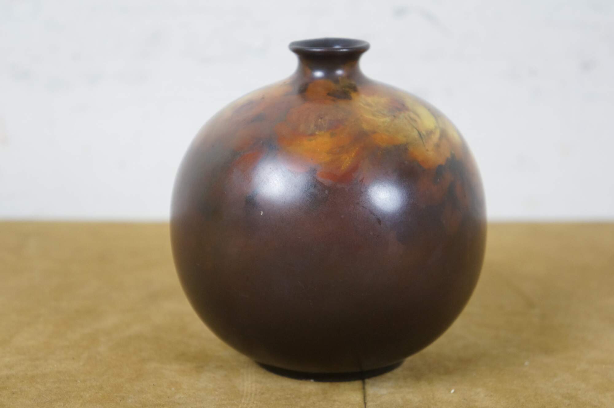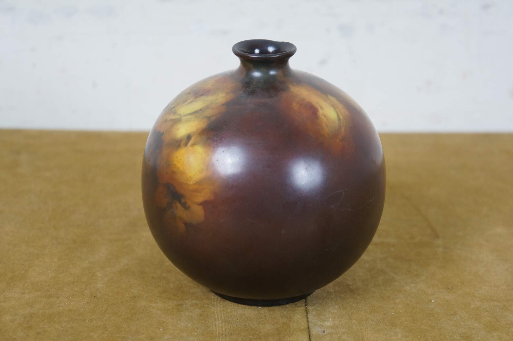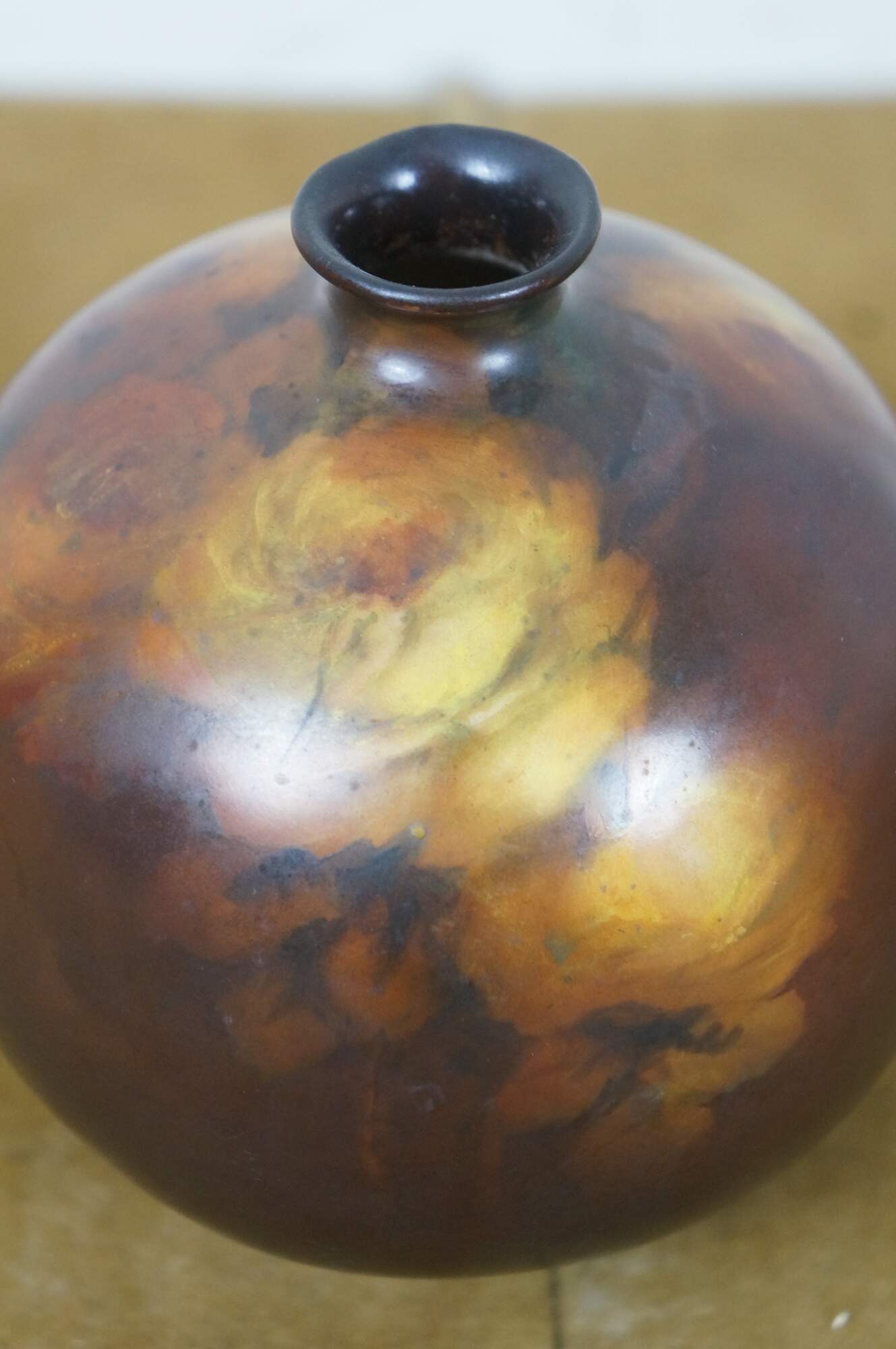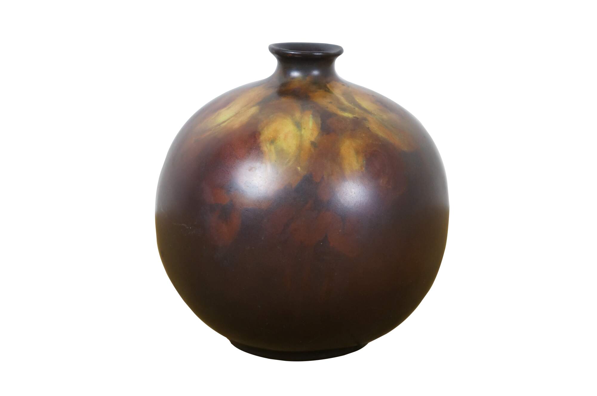 Antique late 19th century ceramic bud vase. Orb-shaped body with a short, narrow neck, decorated in brown with hand-painted yellow roses. No maker’s marks on the base. Attributed to Rookwood Pottery. This piece came in with a collection of Rookwood, and although not marked, appears to have possibly been a piece produced by them.