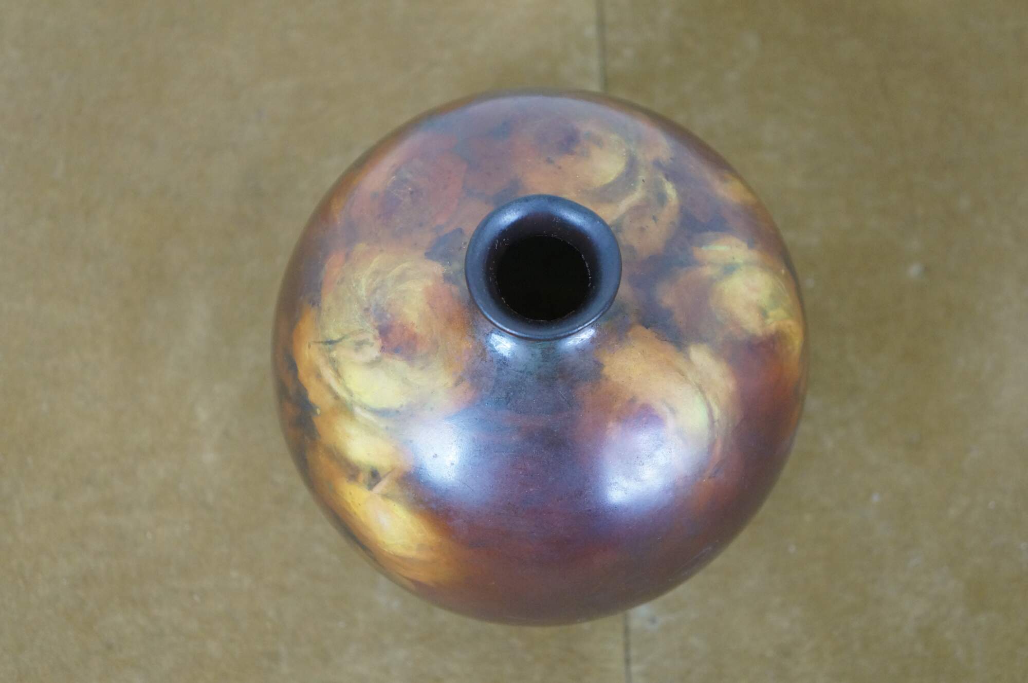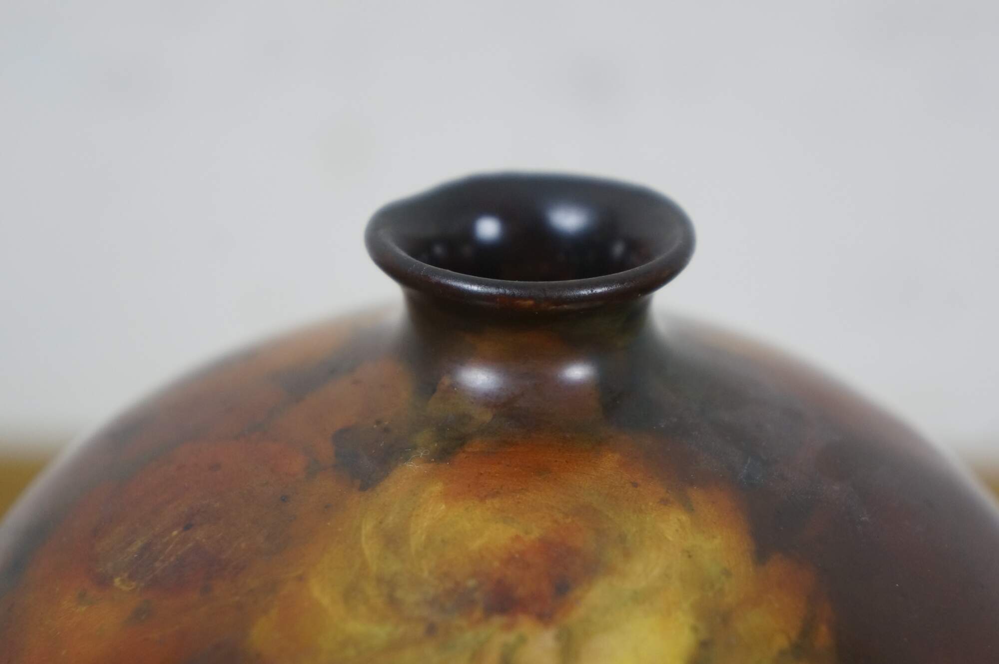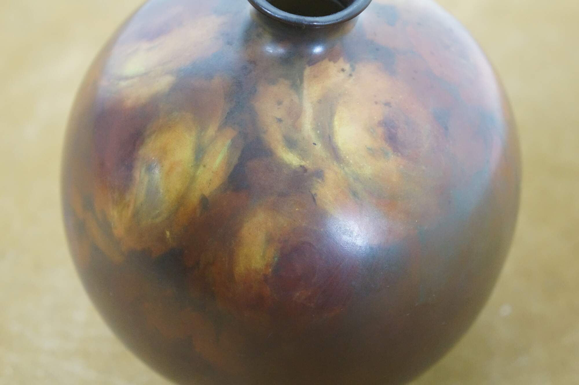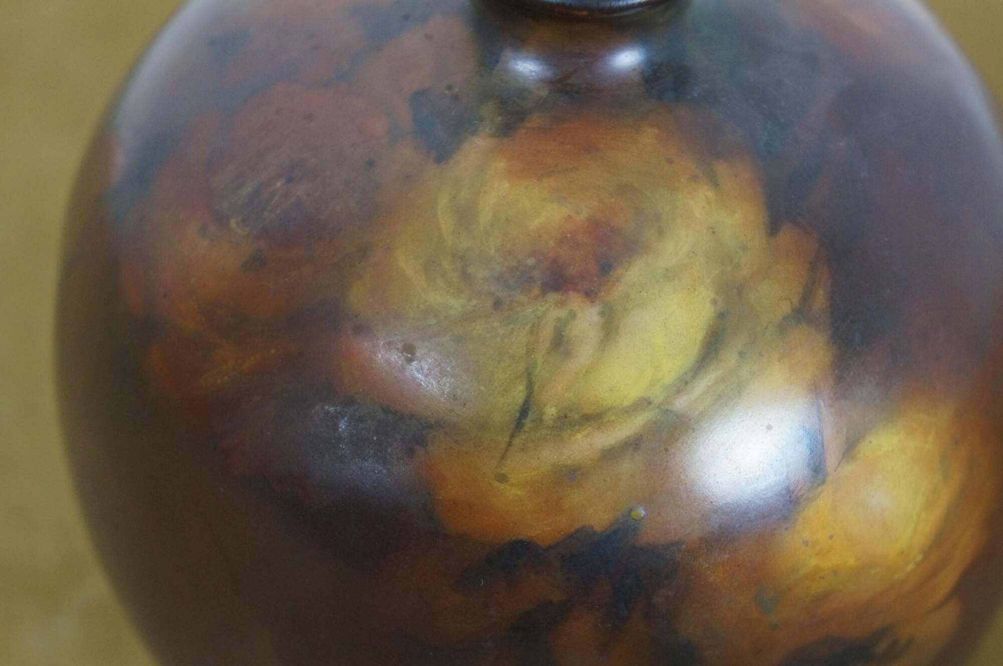 Antique late 19th century ceramic bud vase. Orb-shaped body with a short, narrow neck, decorated in brown with hand-painted yellow roses. No maker’s marks on the base. Attributed to Rookwood Pottery. This piece came in with a collection of Rookwood, and although not marked, appears to have possibly been a piece produced by them.