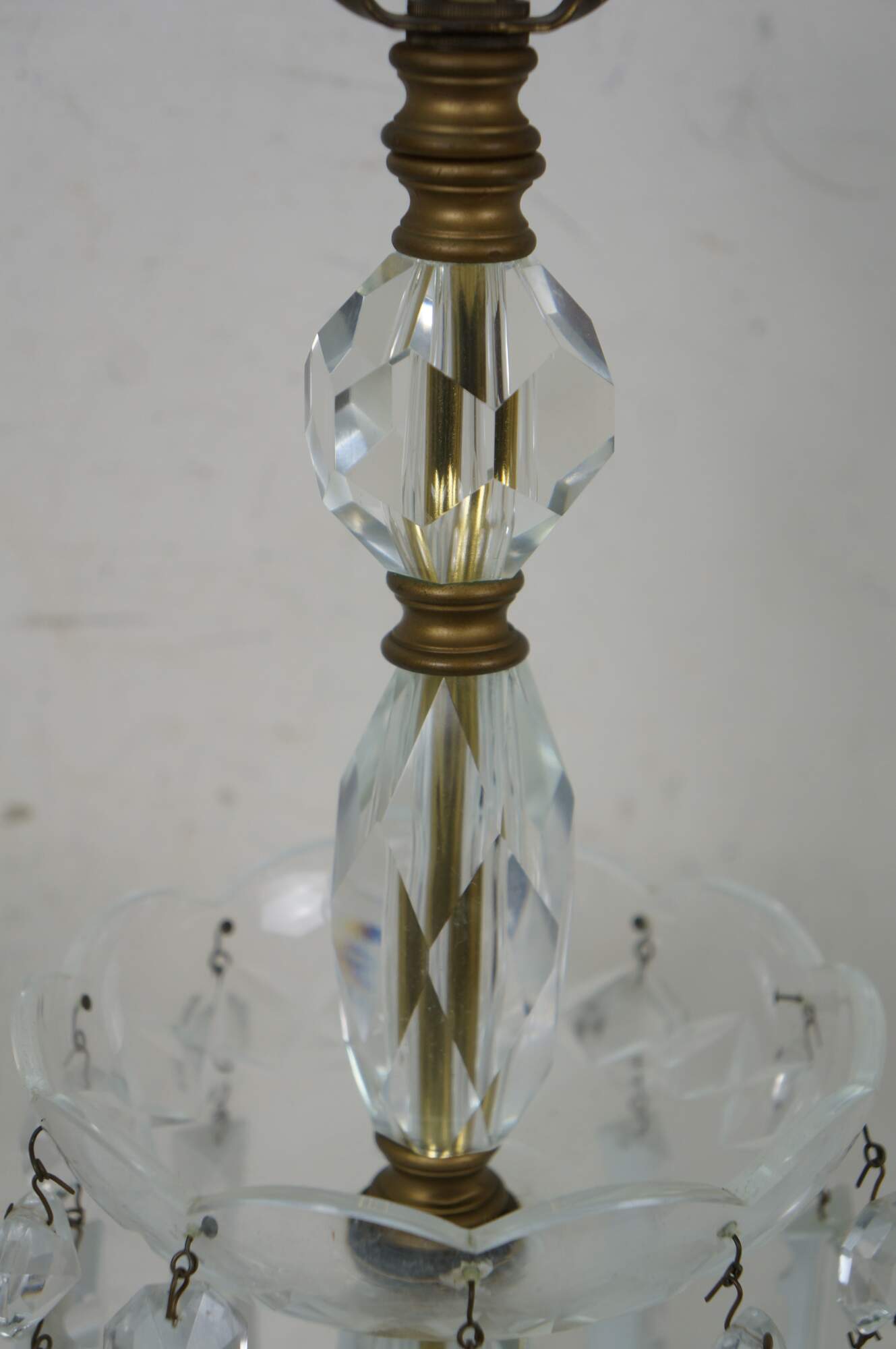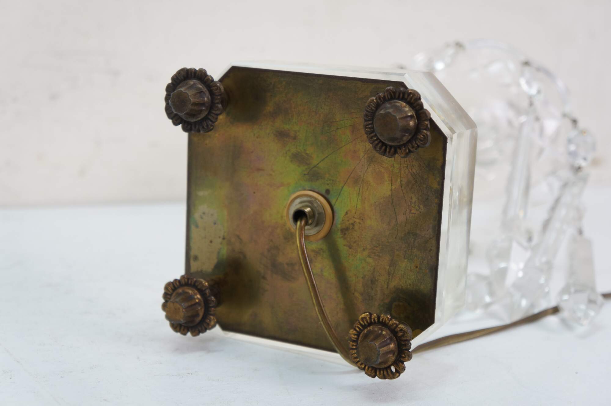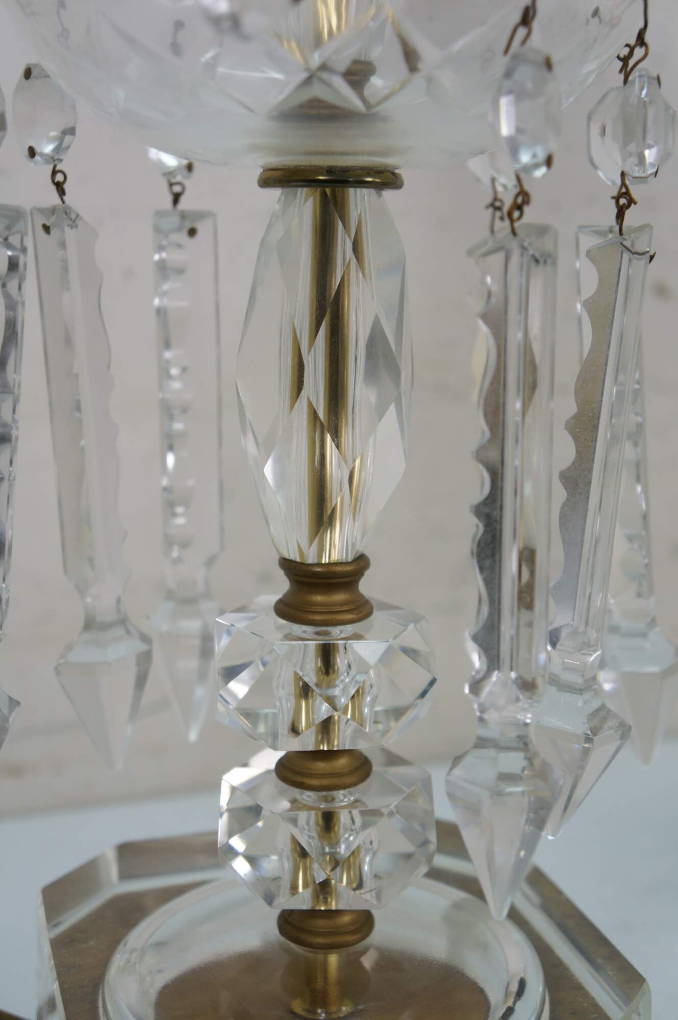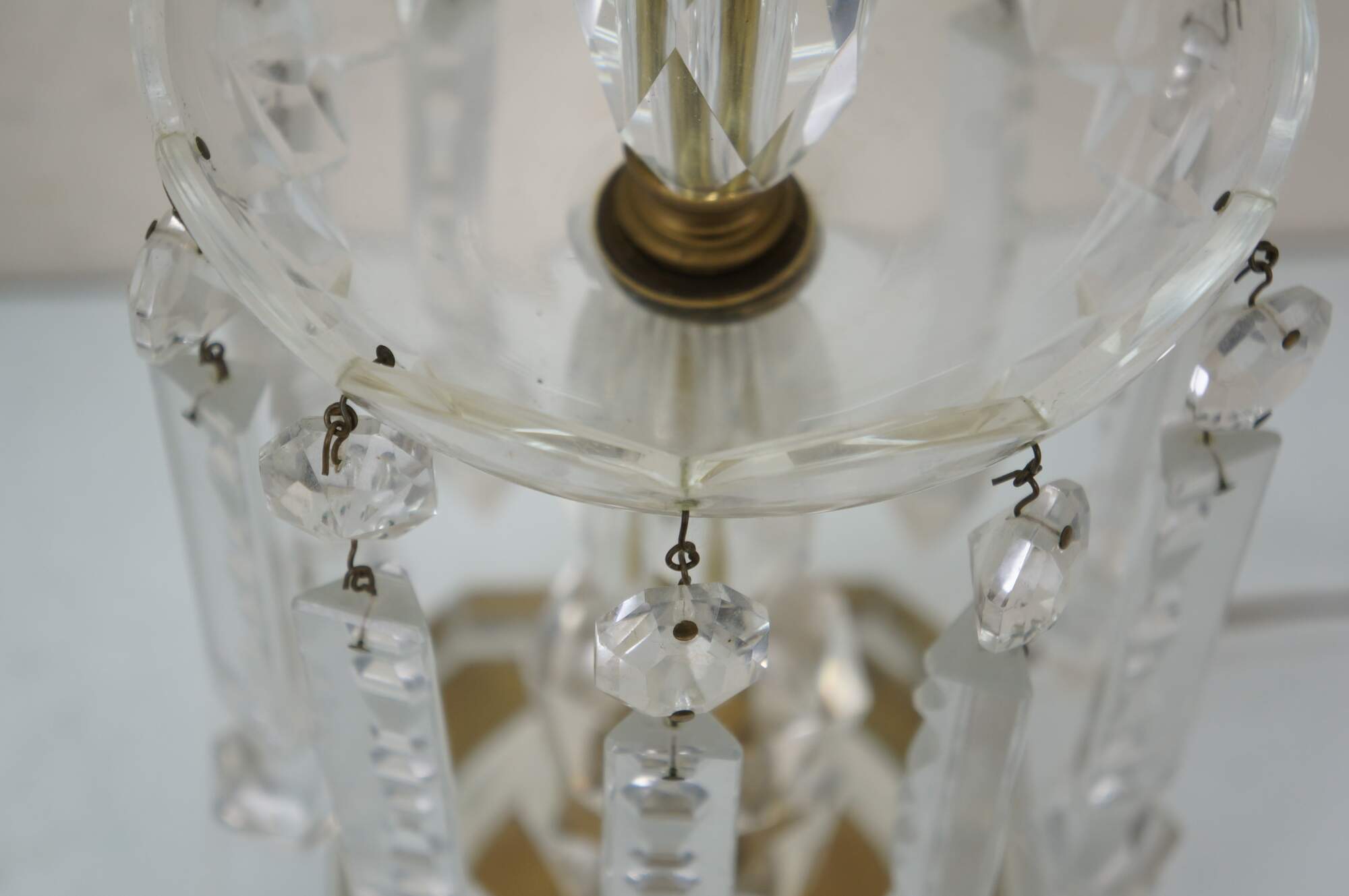 Pair of mid 20th century drop crystal luster table lamps - cut corner base standing on four brass feet, faceted stacked crystal body with scalloped candle cup style top hung with 10 cut drop crystals. Includes harps.