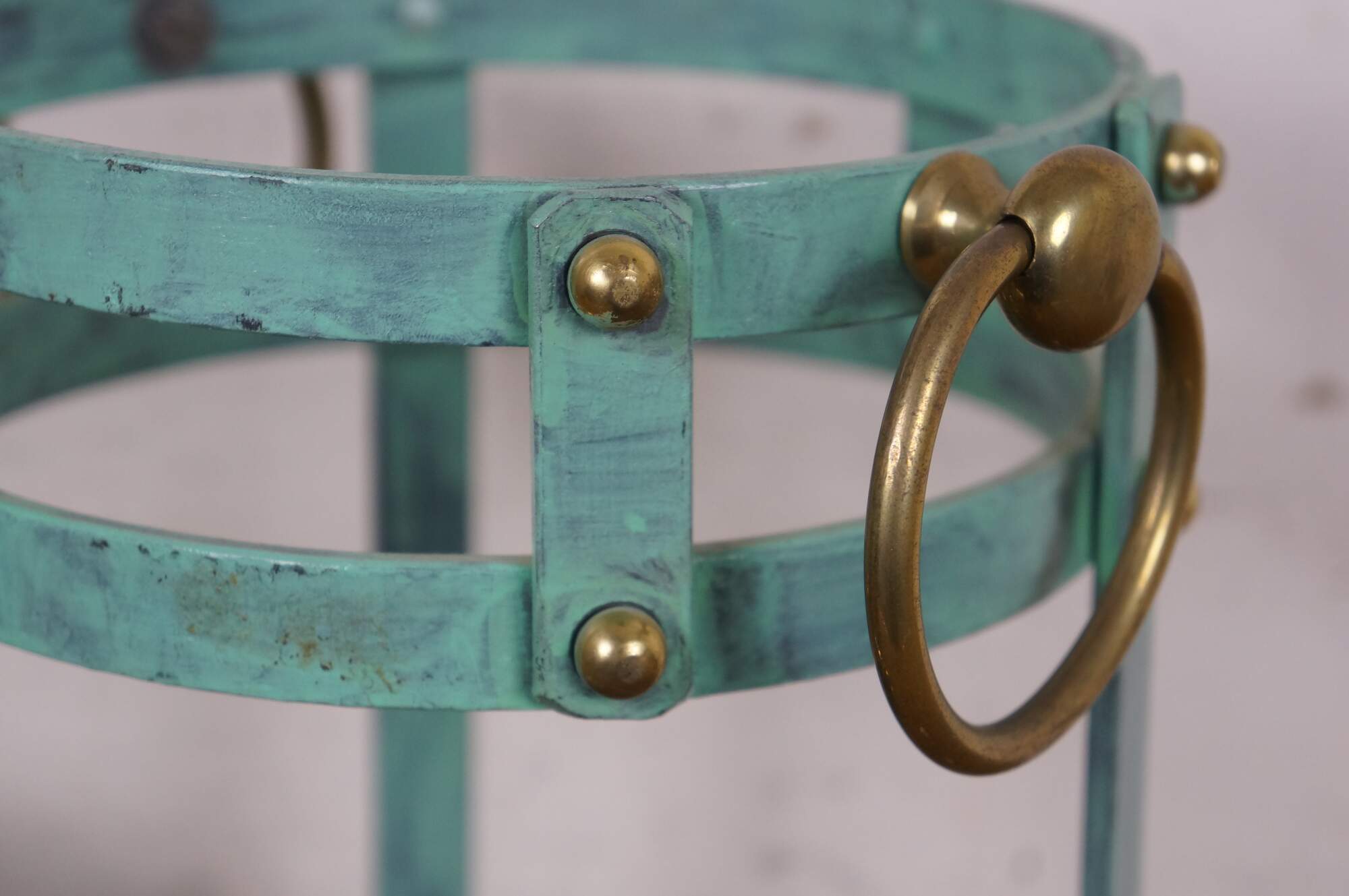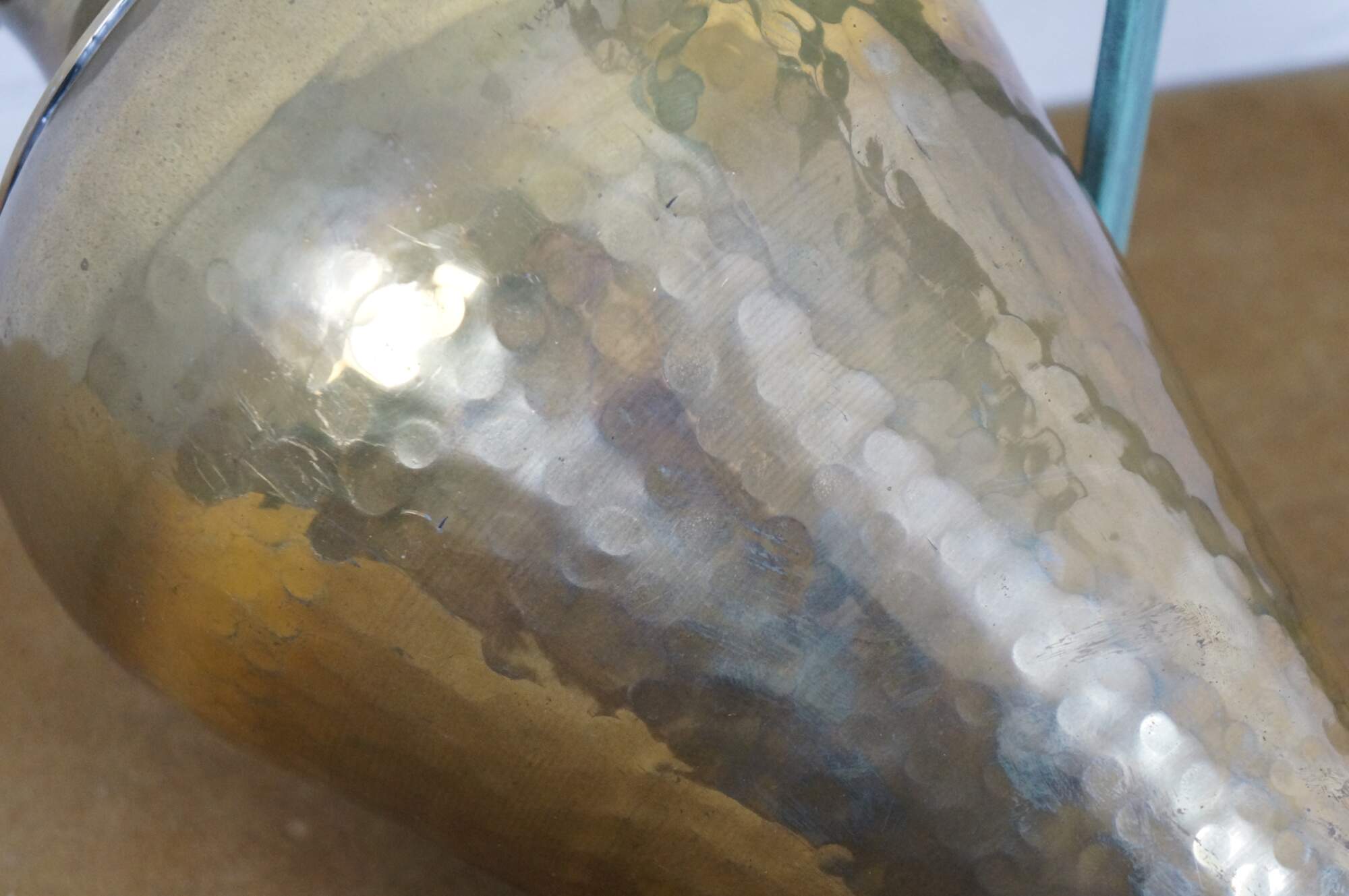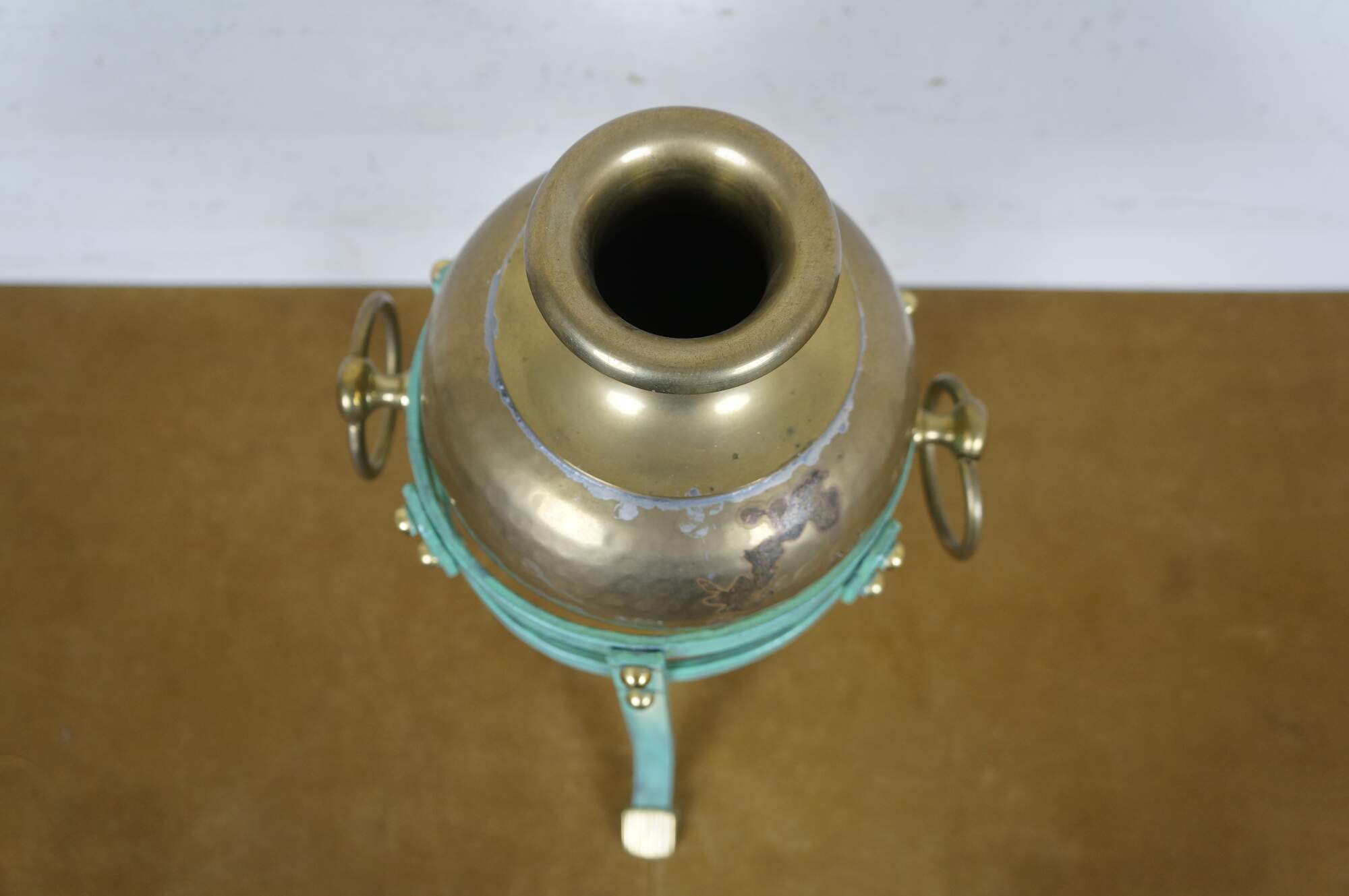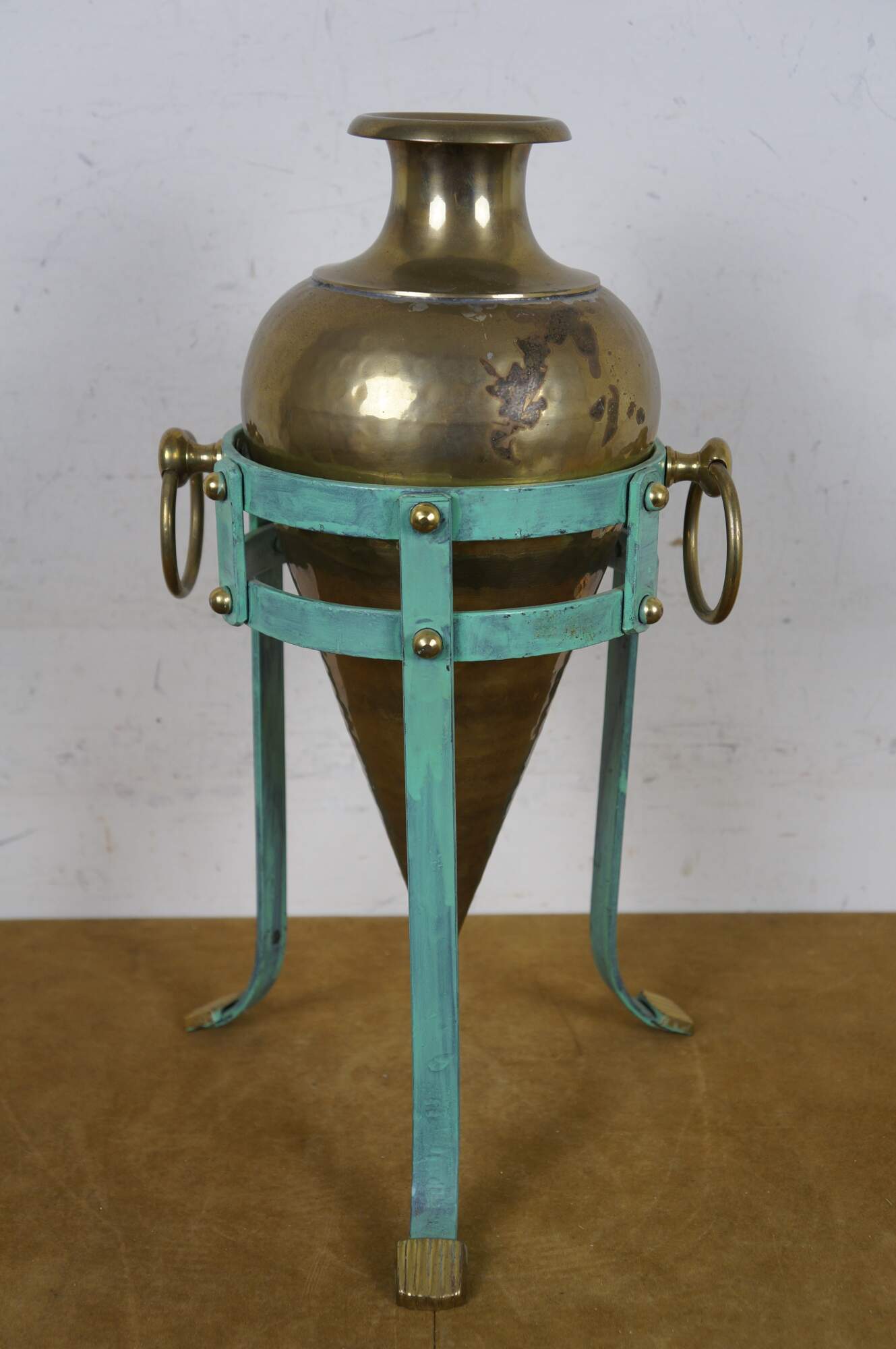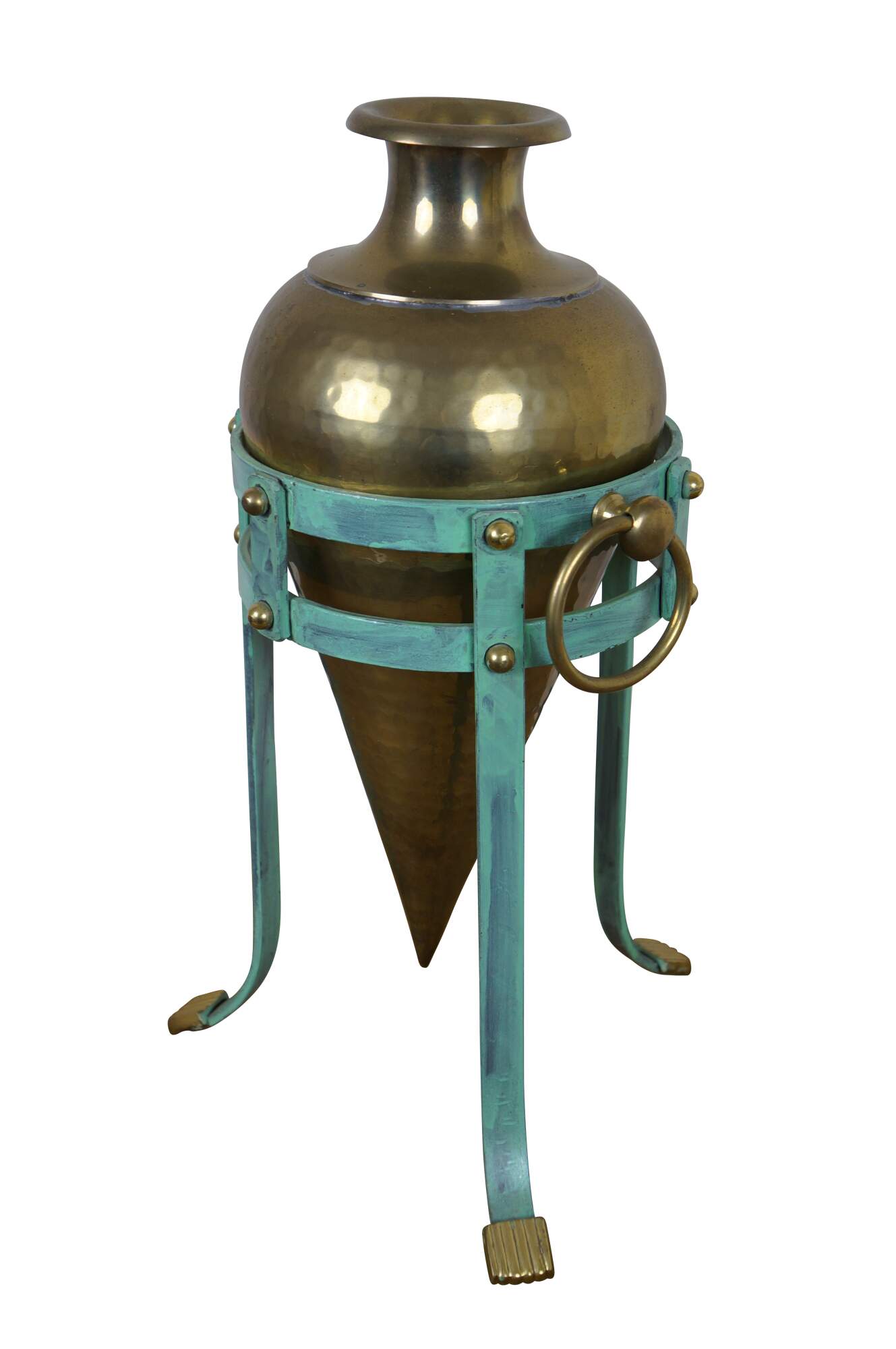 Late 20th century amphora mantel vase and stand. Hammered brass vessel with pointed base and tapered neck, held in a three legged tripod metal stand, painted verdigris green accented with grooved brass feet, studs, and two ring handles.