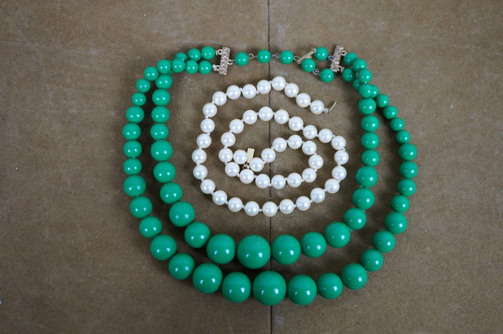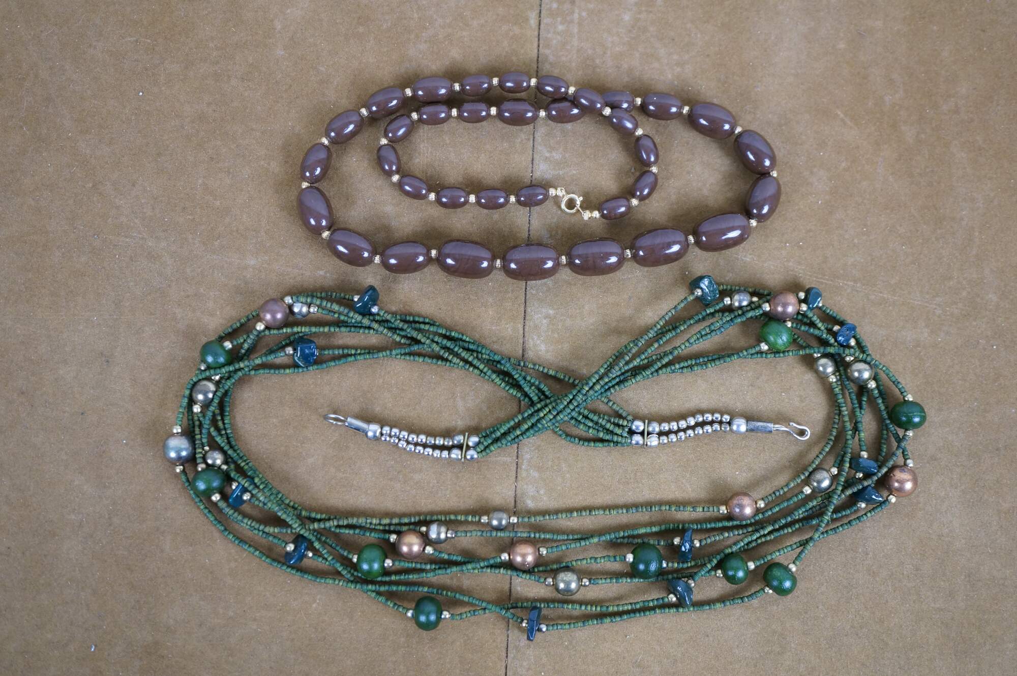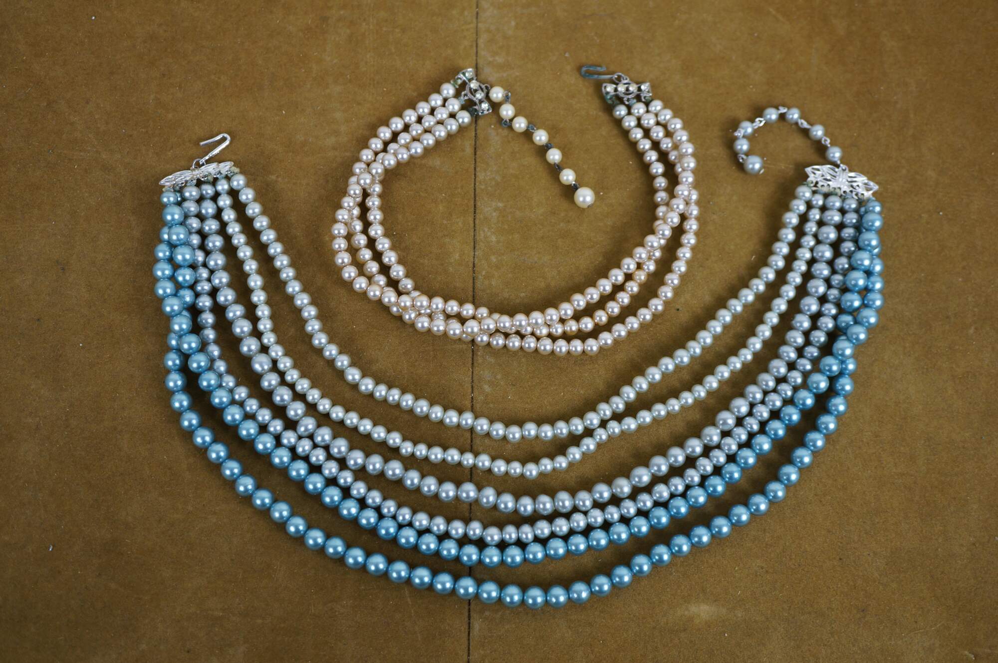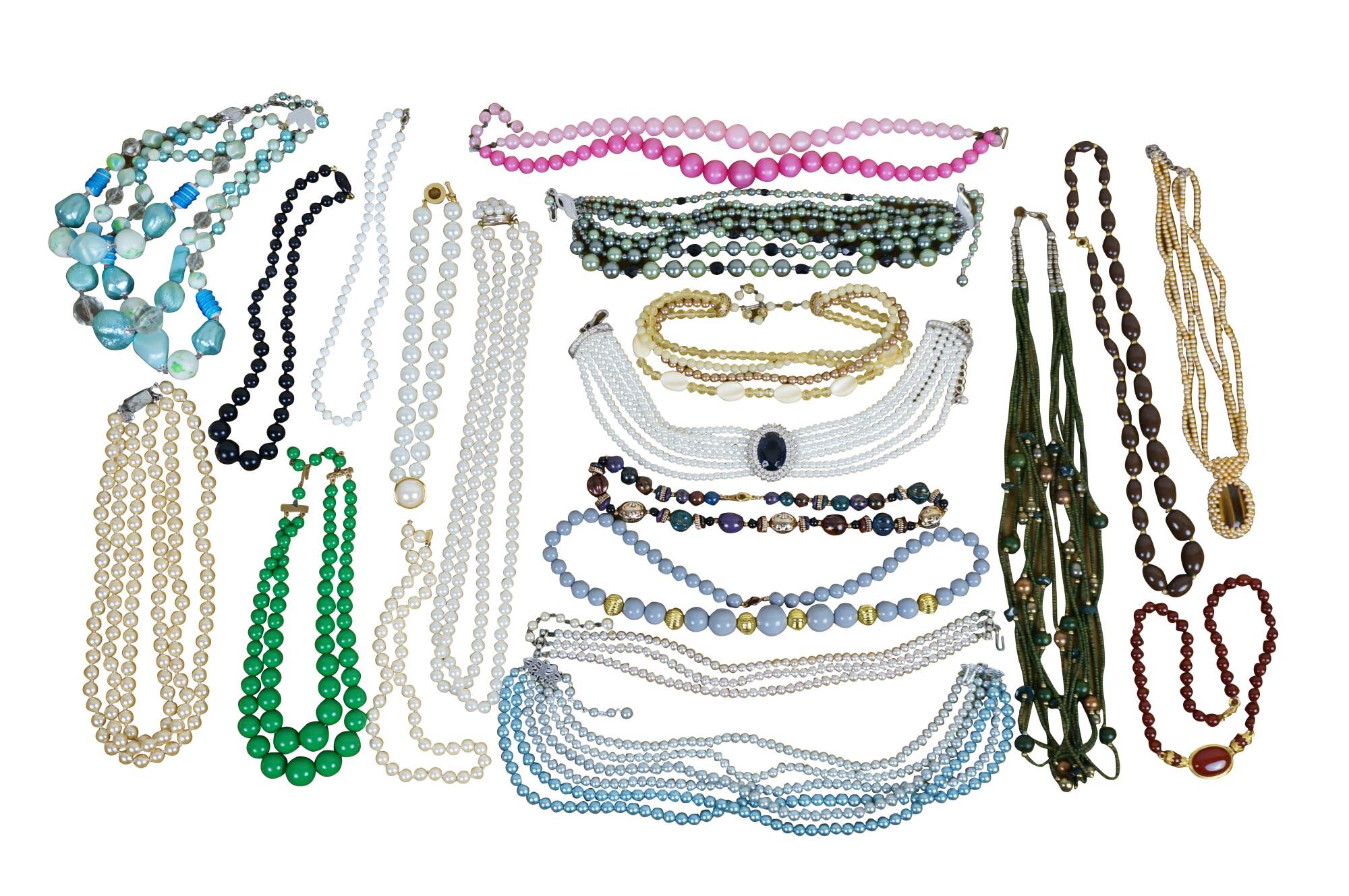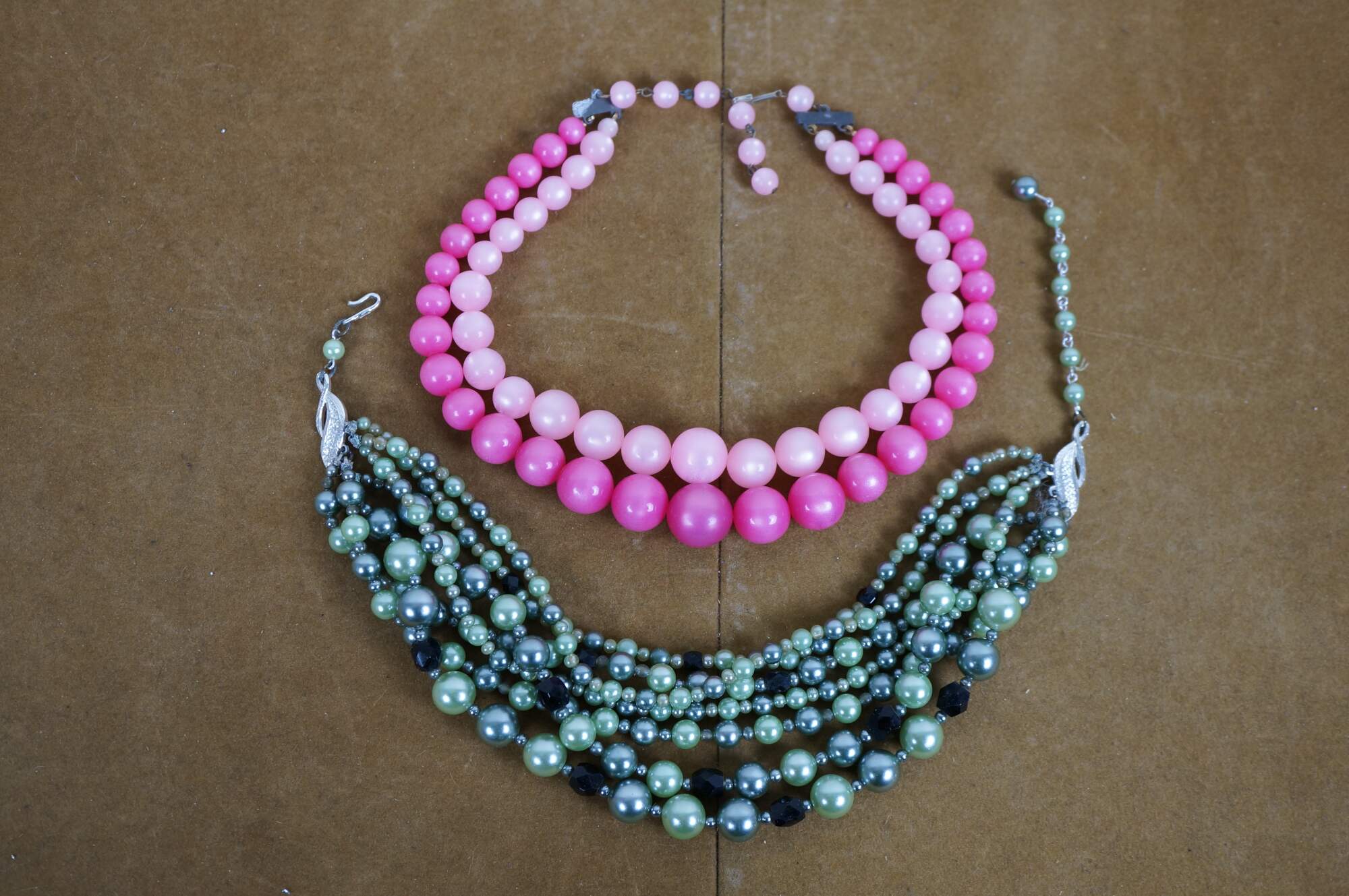 Lot of 20 mid to late 20th century beaded layered and choker style necklaces in a variety of colors. Brands include Marvella, FM, Carolee, MMA, RDC. Several Made in Japan.
