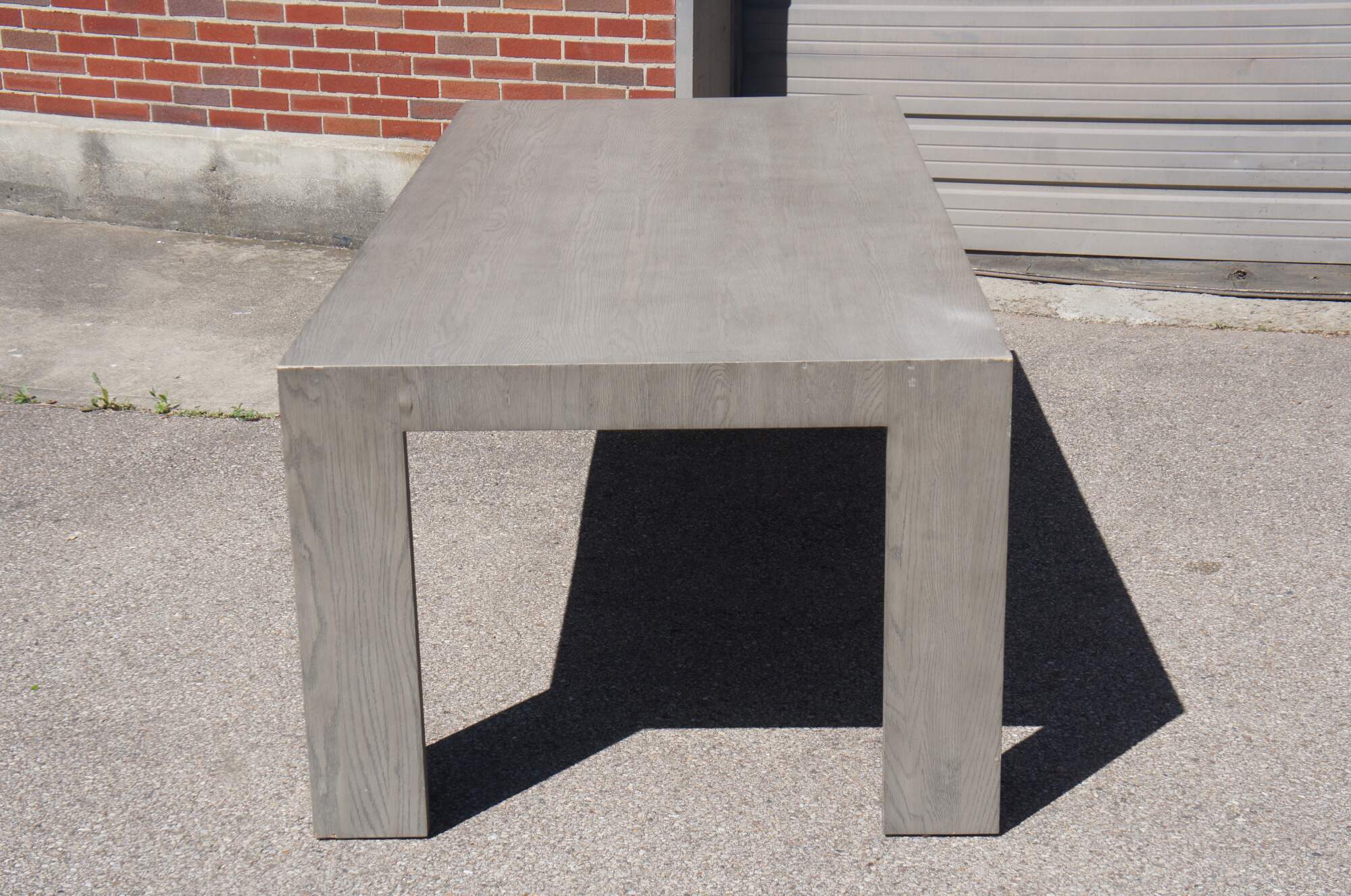 Restoration Hardware Machinto Dining Table. Features a rectangular Parsons-style form made of oak veneer with a grey form. Circa 2019.
