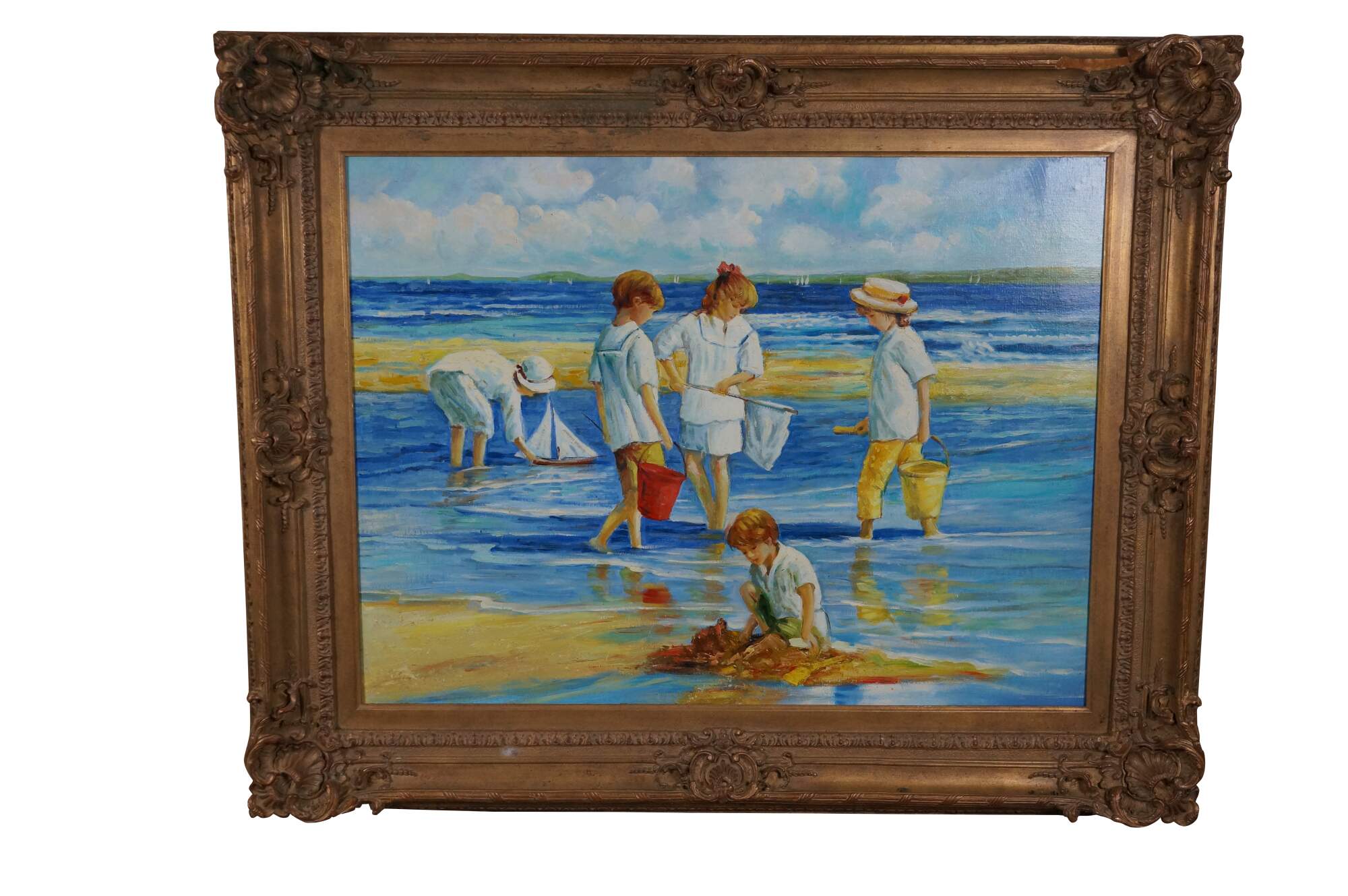 Contemporary School Impressionist Coastal Oil Painting. Features children playing near the water on the beach. A boy is shown in the foreground building a sandcastle with a group behind him holding a net and buckets, possibly searching for sand crabs. In the back, another boy is playing with a sailboat in the water. Sailboats and a landmass can be seen in the background. The canvas is framed in a Baroque manner with a gold finish.