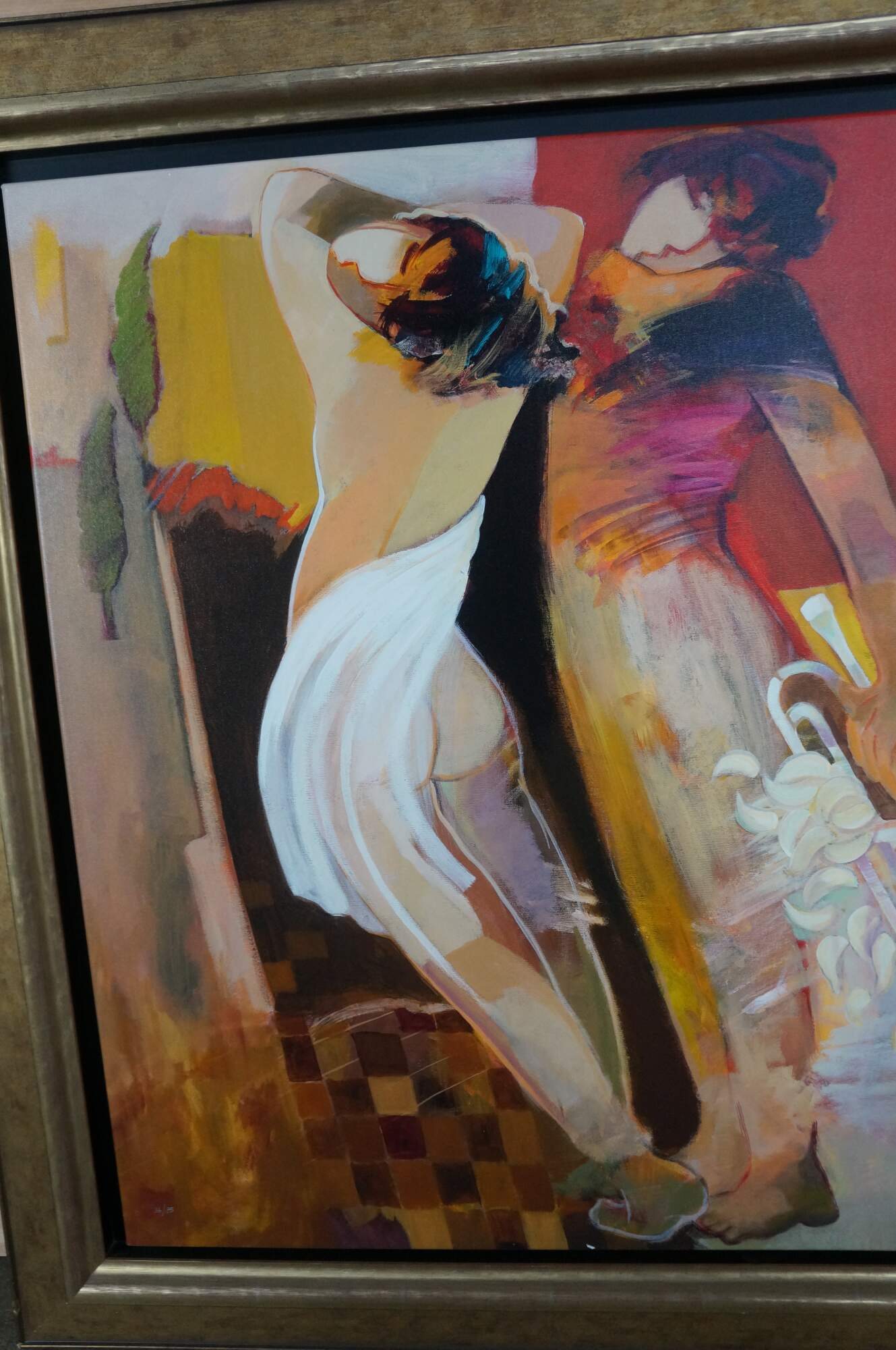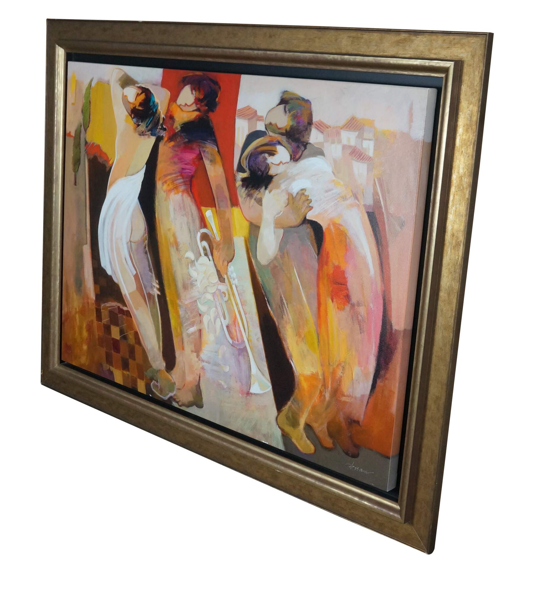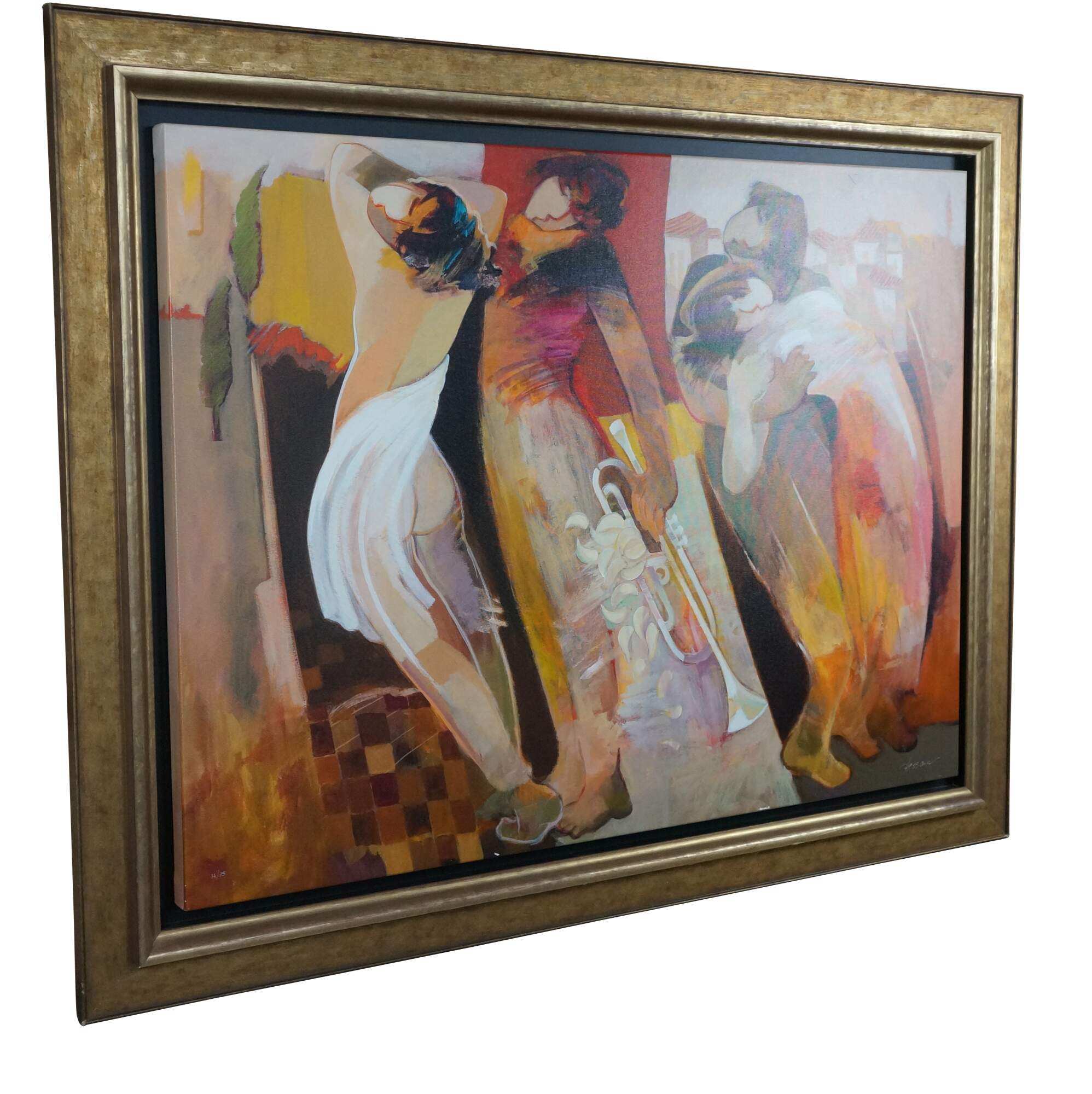 An abstract contemporary giclée featuring figures/musicians dancing in front of a Tuscan landscape. Beautifully colored and detailed. Giclée on premium canvas. Hand-signed limited edition 36/75. Professionally framed.