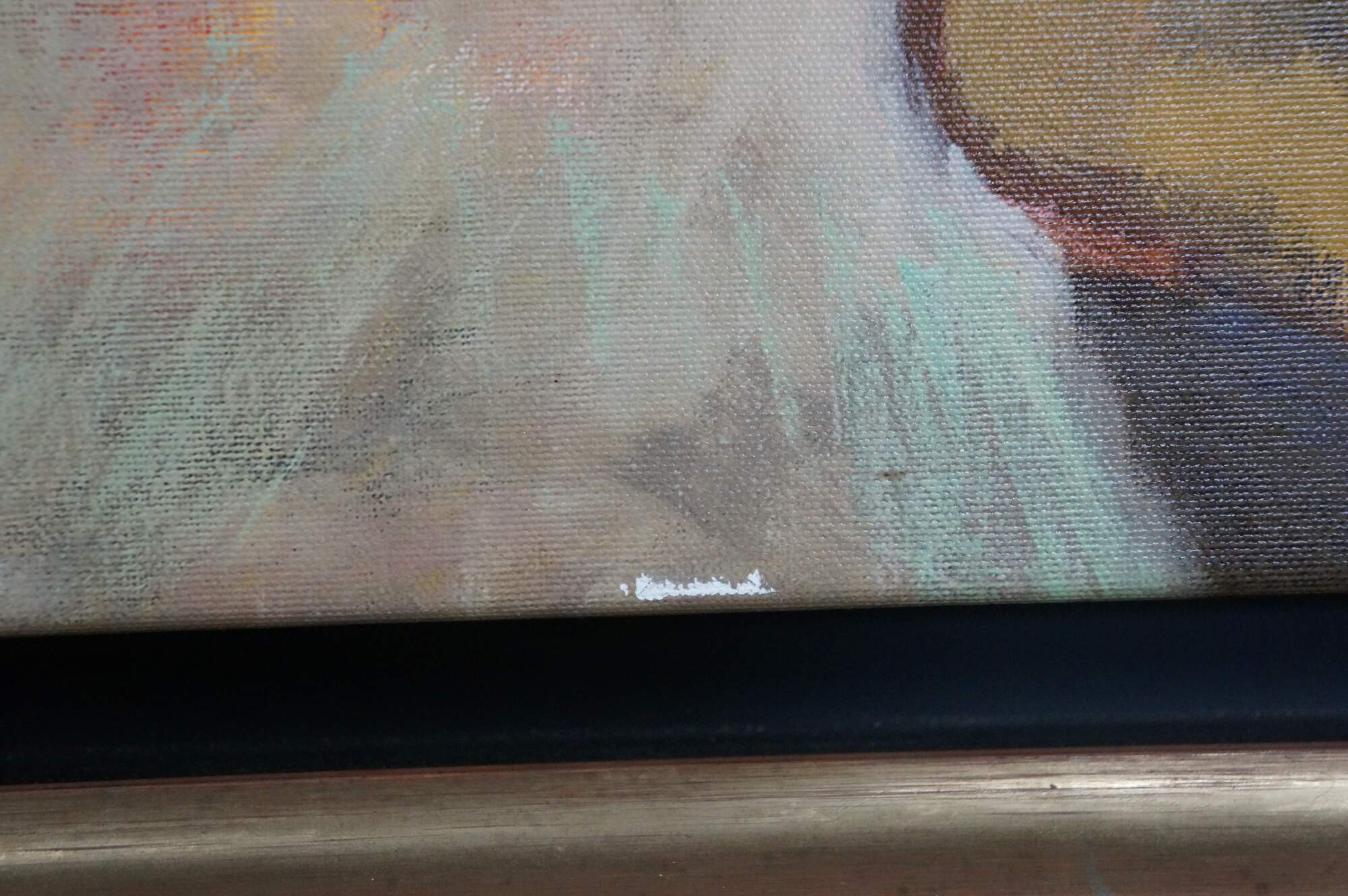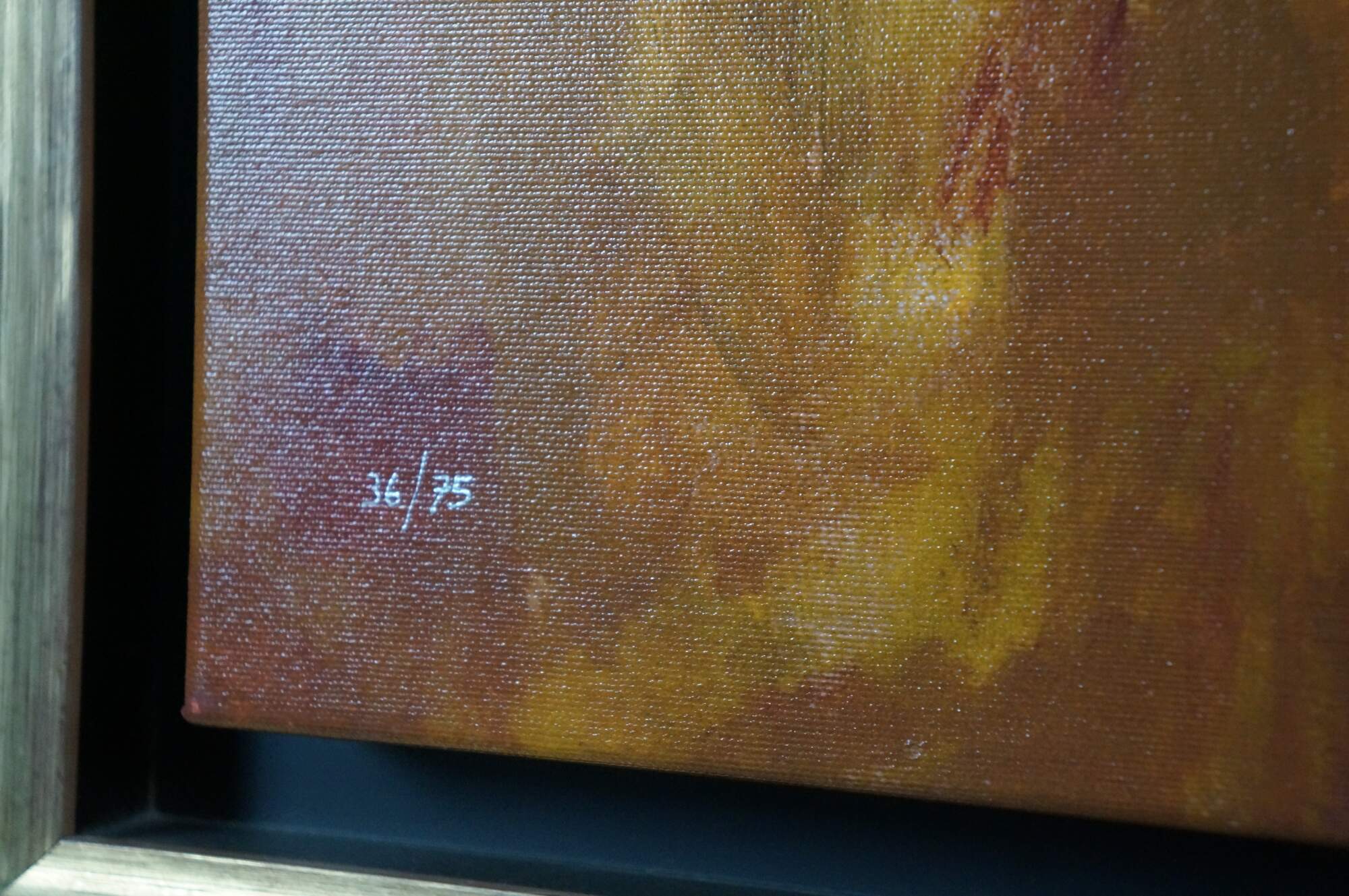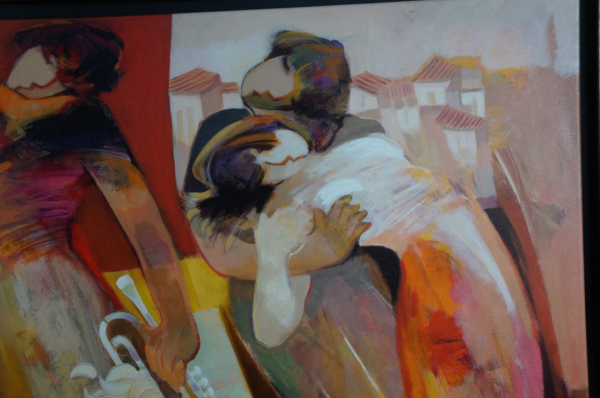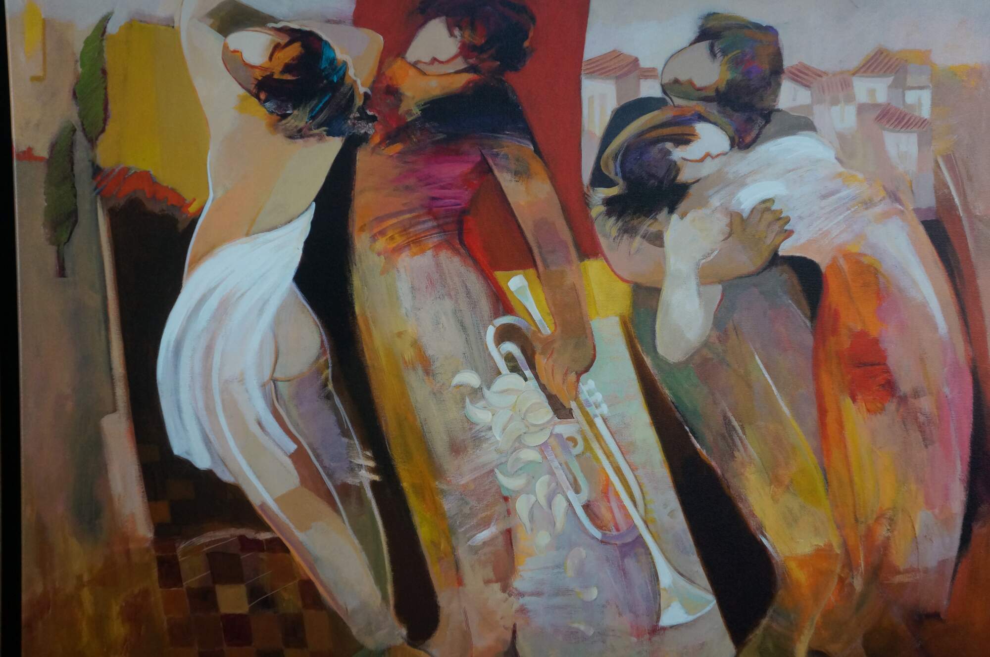 An abstract contemporary giclée featuring figures/musicians dancing in front of a Tuscan landscape. Beautifully colored and detailed. Giclée on premium canvas. Hand-signed limited edition 36/75. Professionally framed.