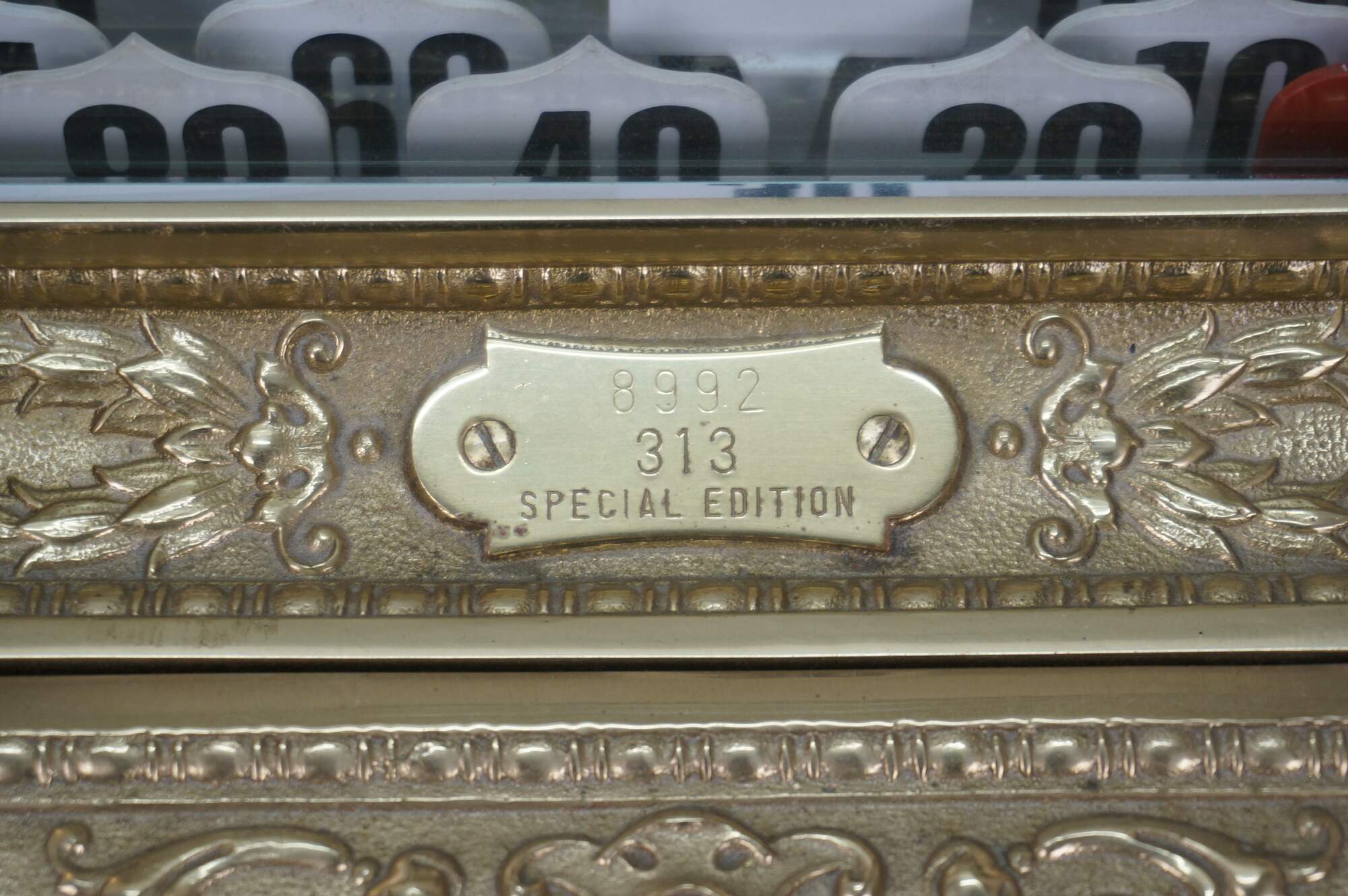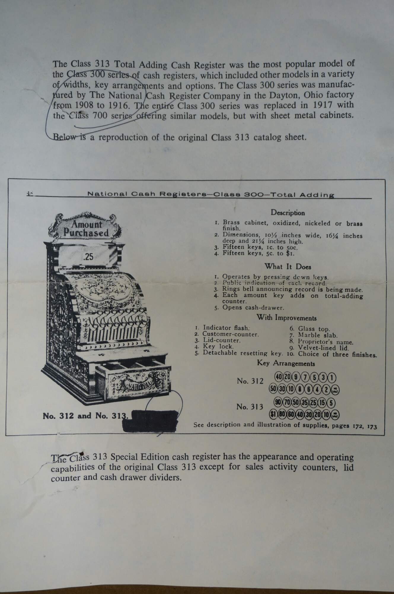 The Class 313 - Special Edition - cash register has the appearance and operating capabilities of the original Class 313 except for sales activity counters, lid counter, and cash drawer dividers. It was made for the 100th anniversary in São Paulo, Brazil.