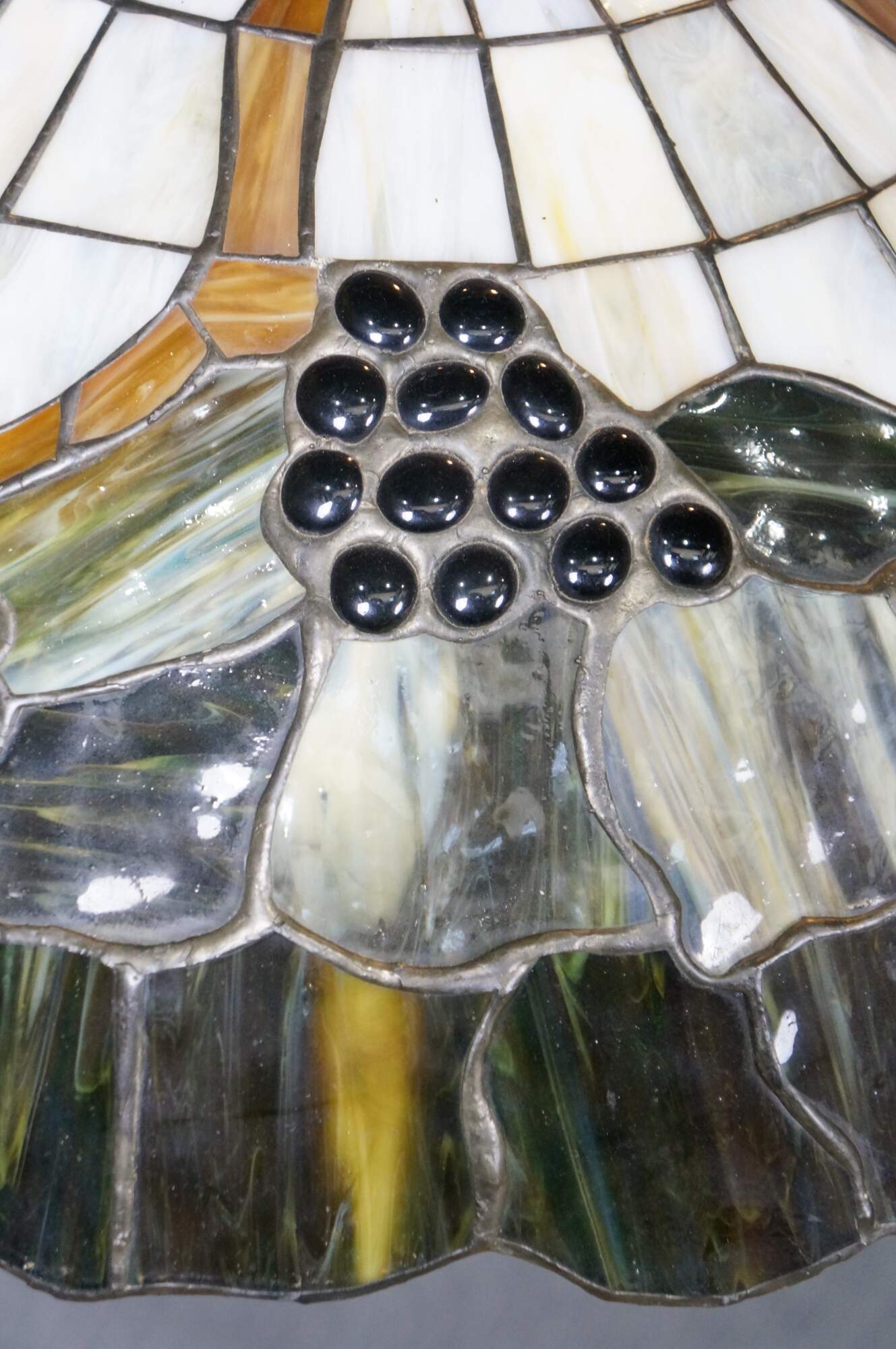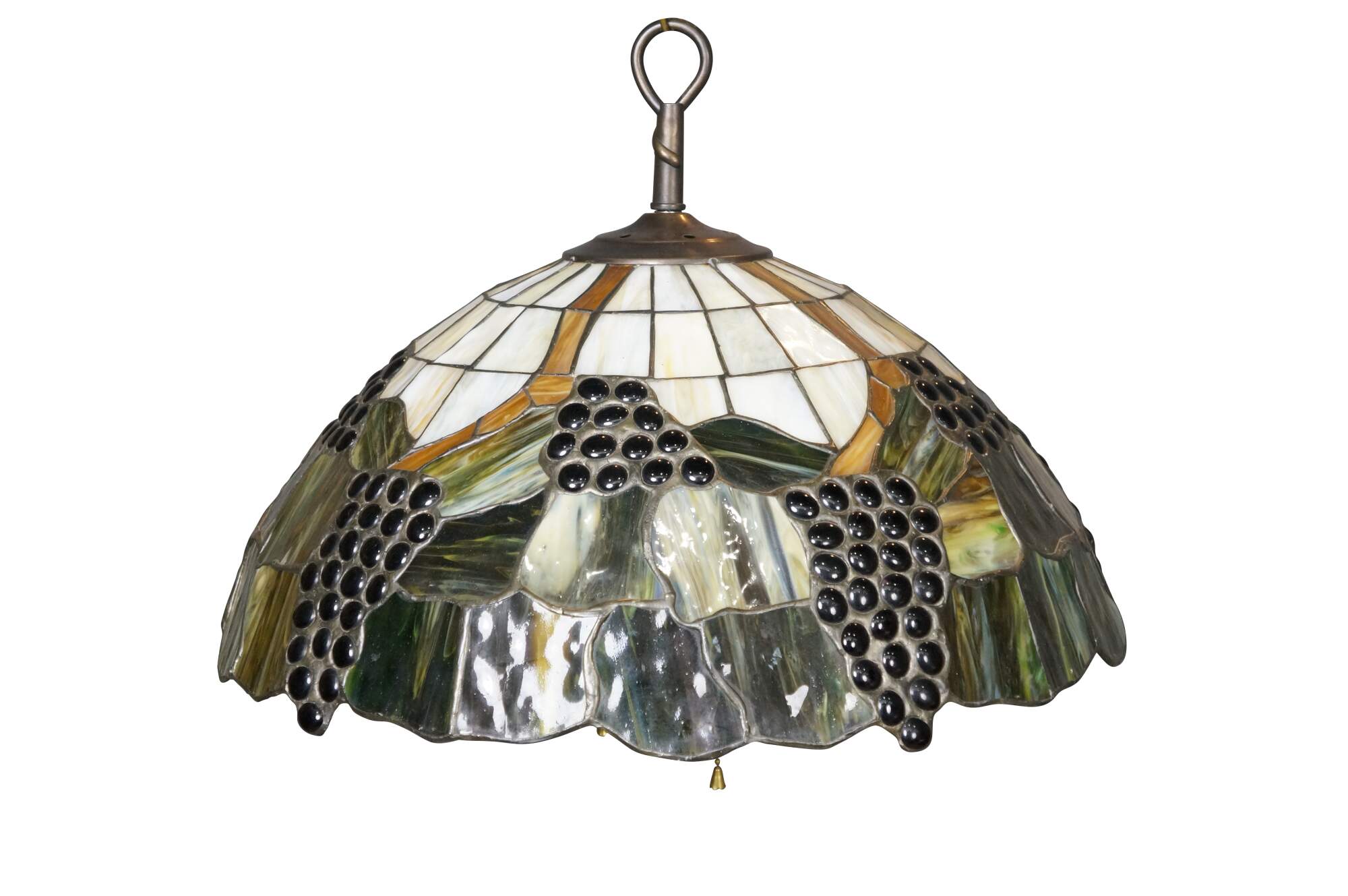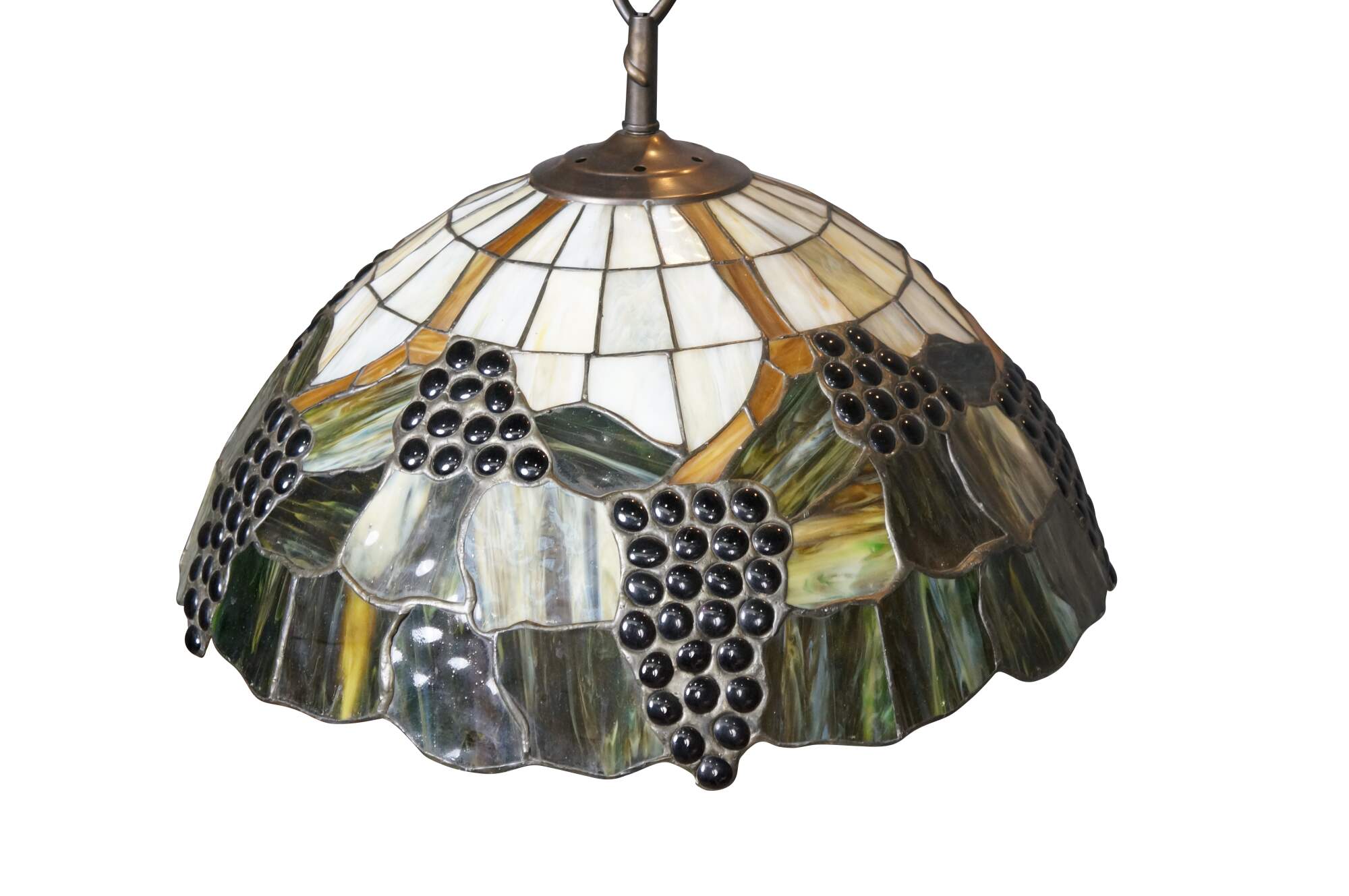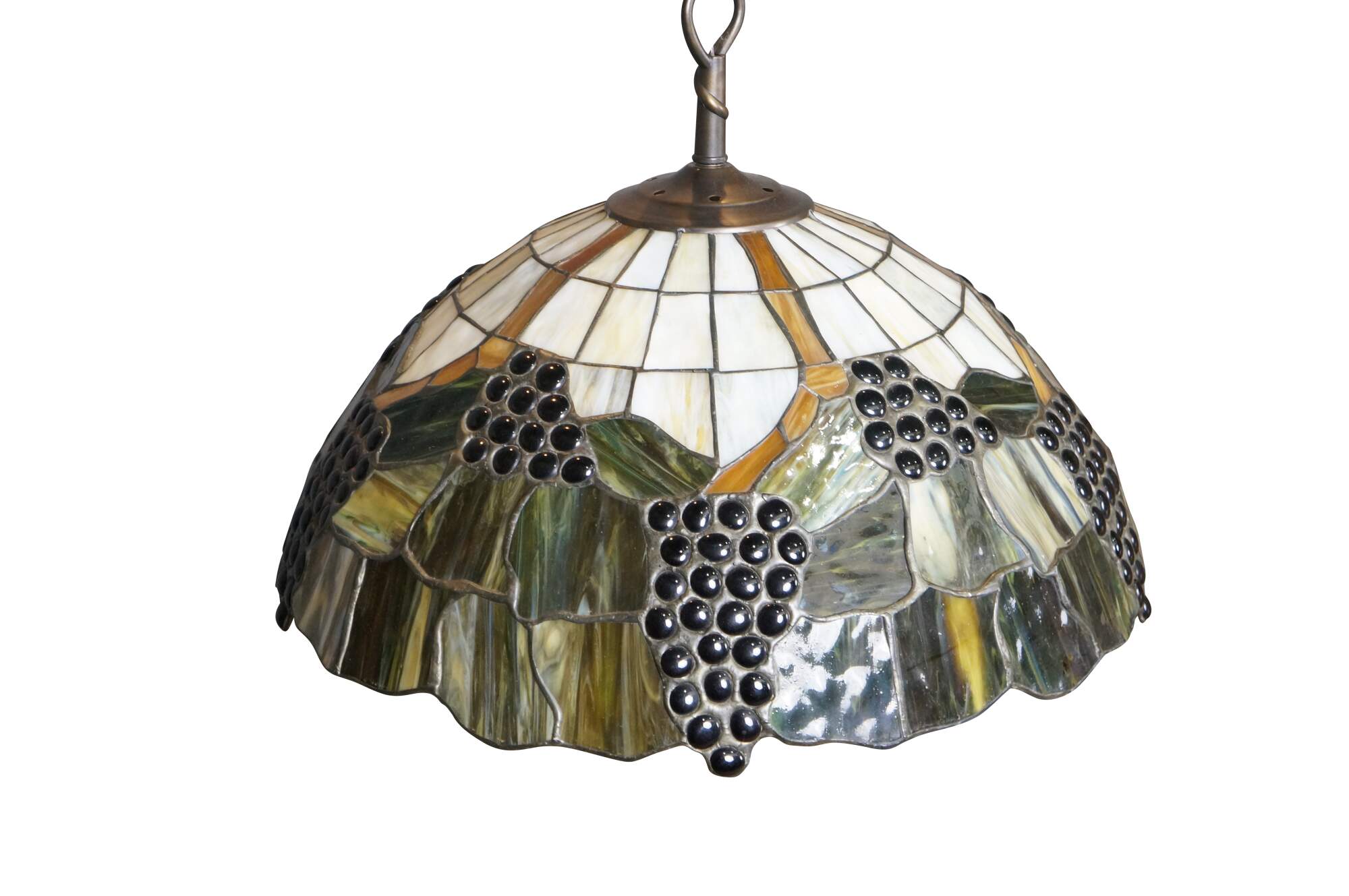 Mid to late 20th century L&L WMC / Loevsky & Loevsky, White Metal Castings Company slag glass Tiffany-style pendant light shade / swag chandelier. Round form with off white and green stained glass panels accented with a fruiting grapevine. Hardwired. Includes chain and ceiling medallion.