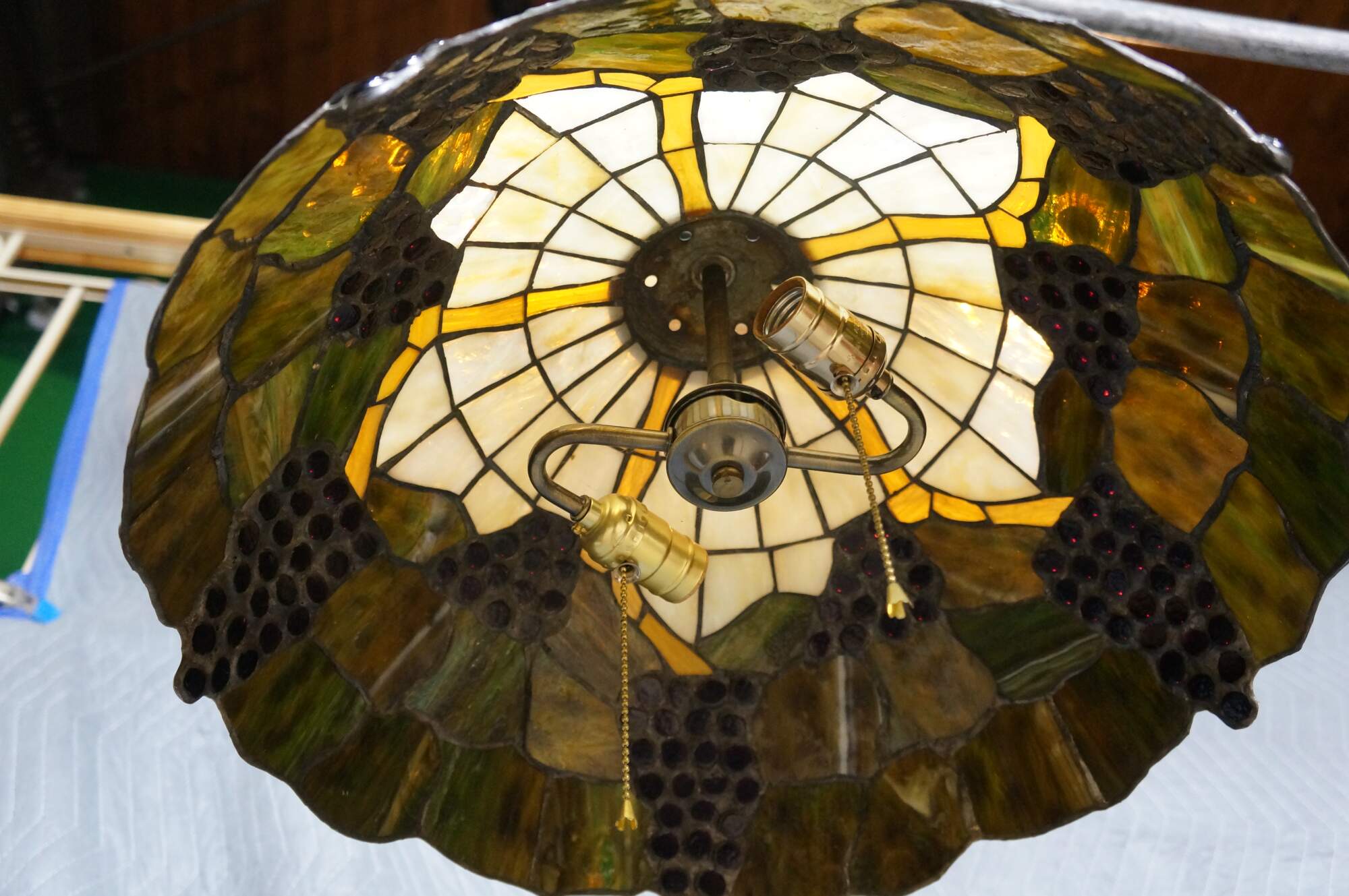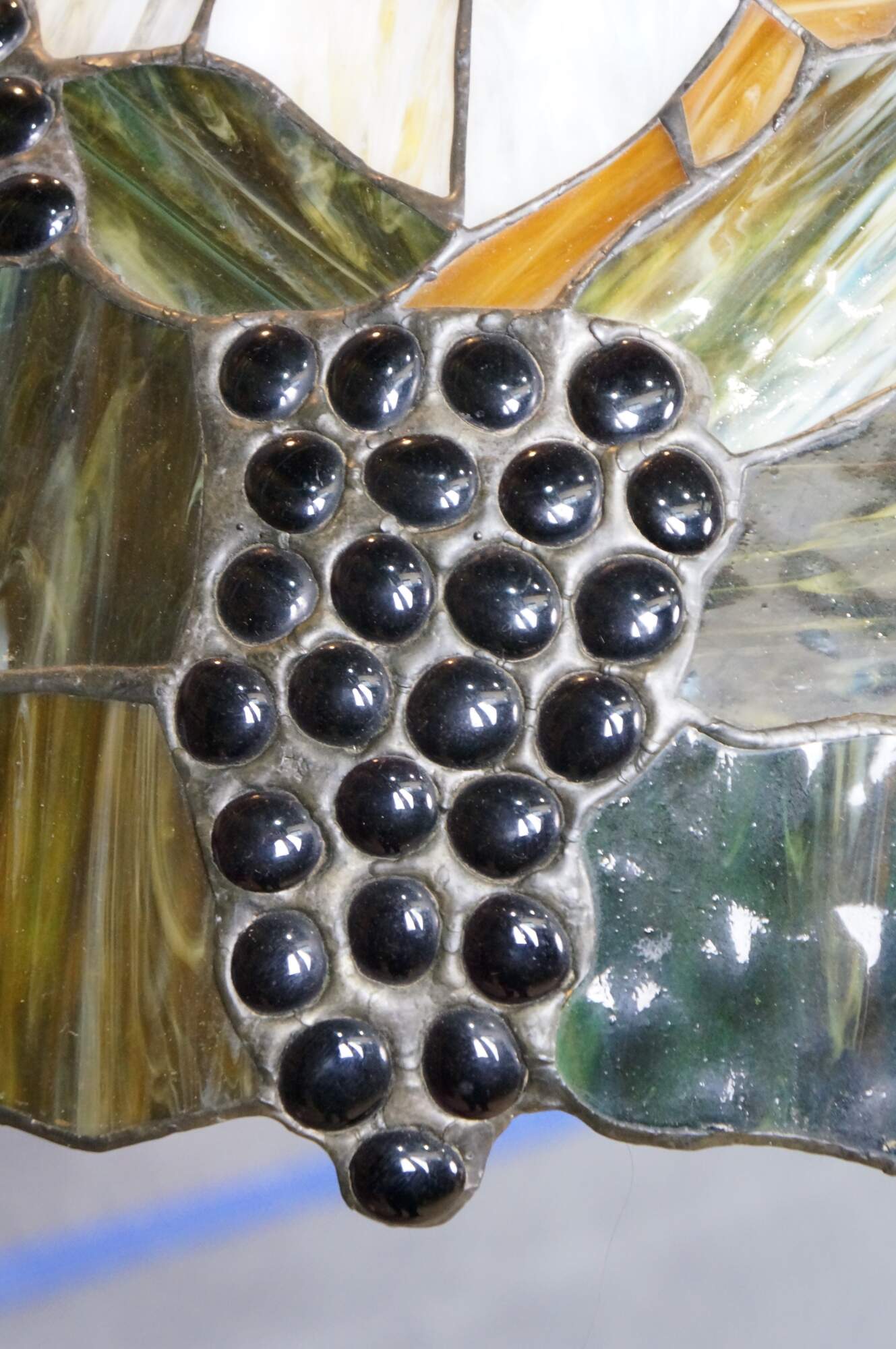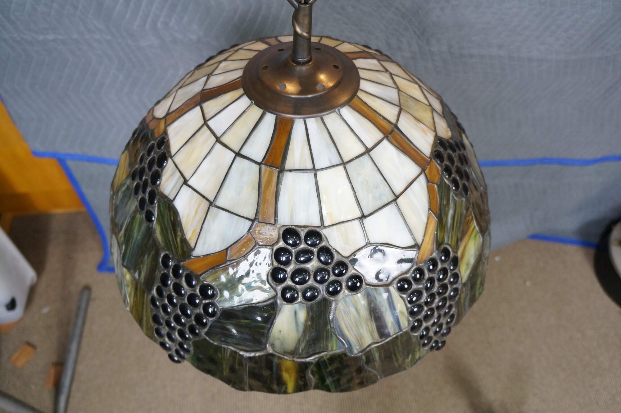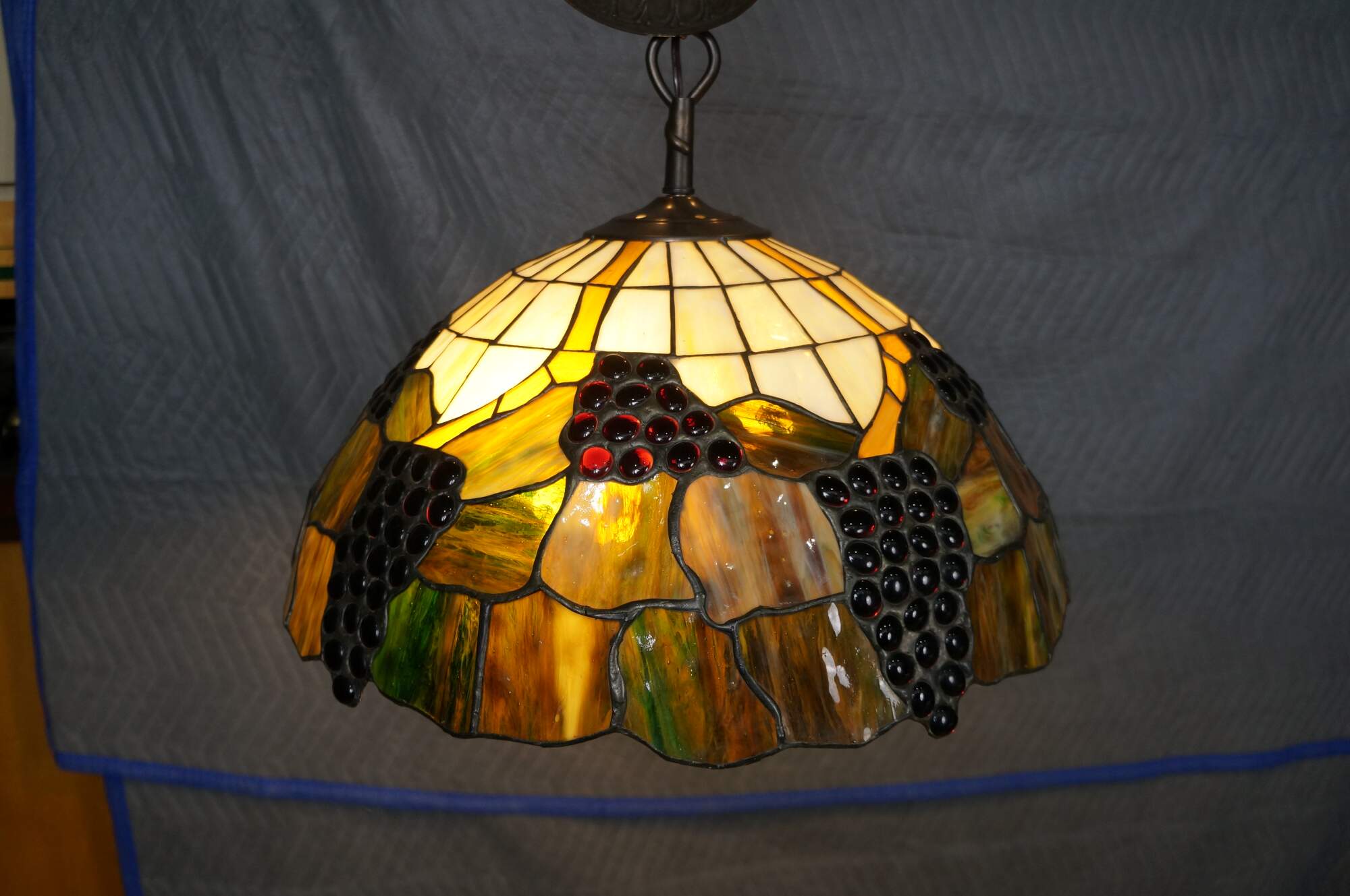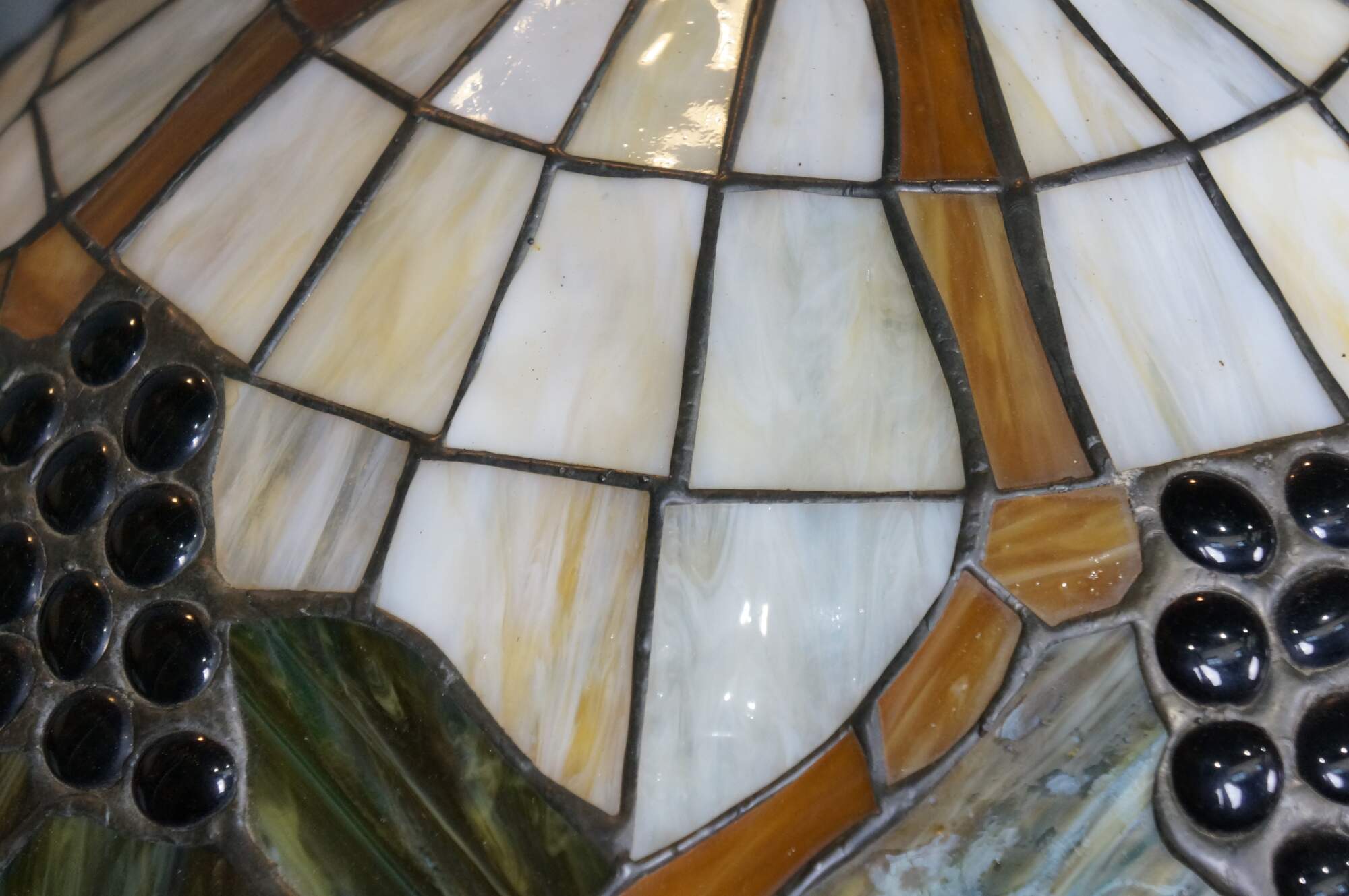 Mid to late 20th century L&L WMC / Loevsky & Loevsky, White Metal Castings Company slag glass Tiffany-style pendant light shade / swag chandelier. Round form with off white and green stained glass panels accented with a fruiting grapevine. Hardwired. Includes chain and ceiling medallion.
