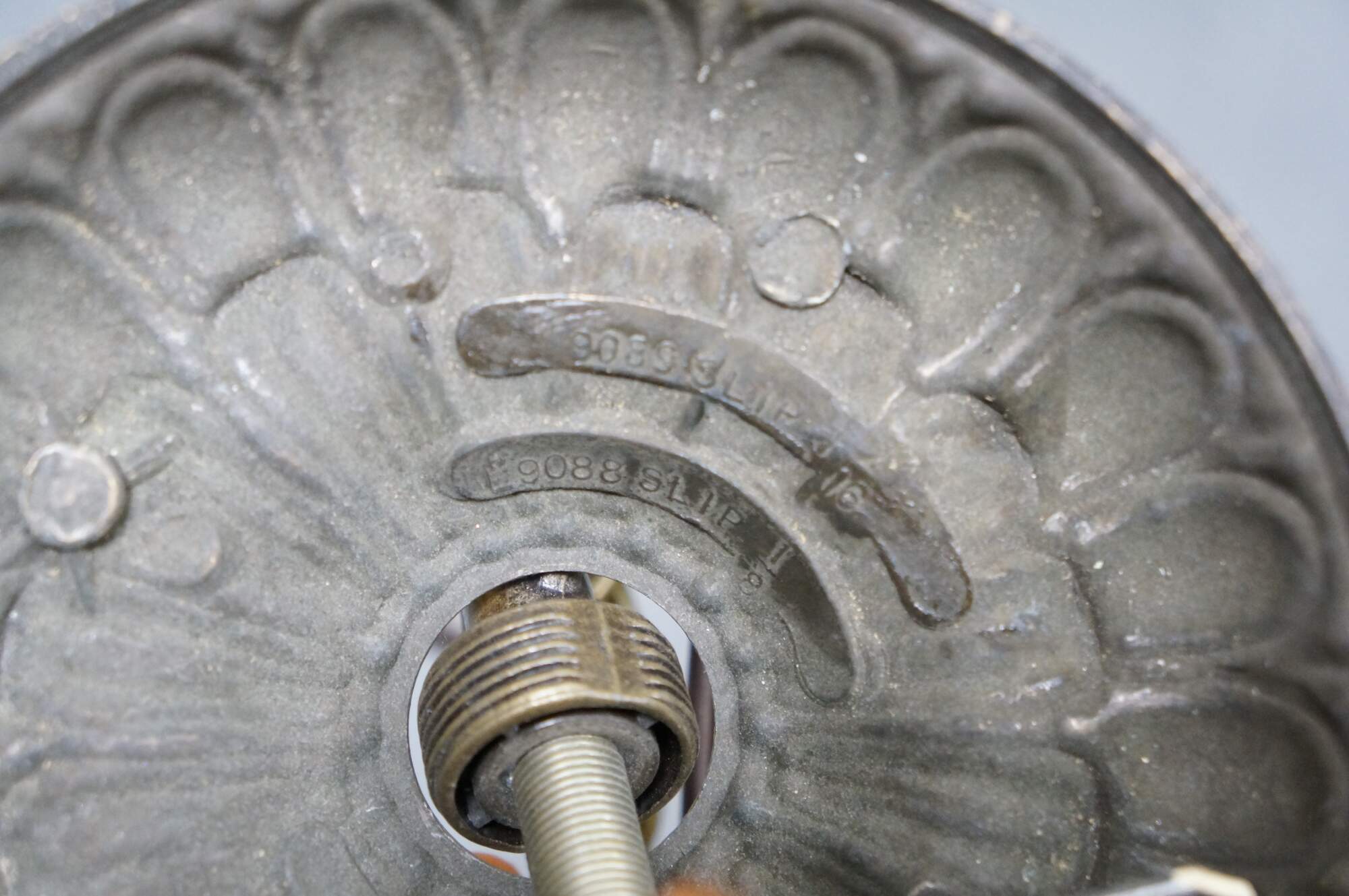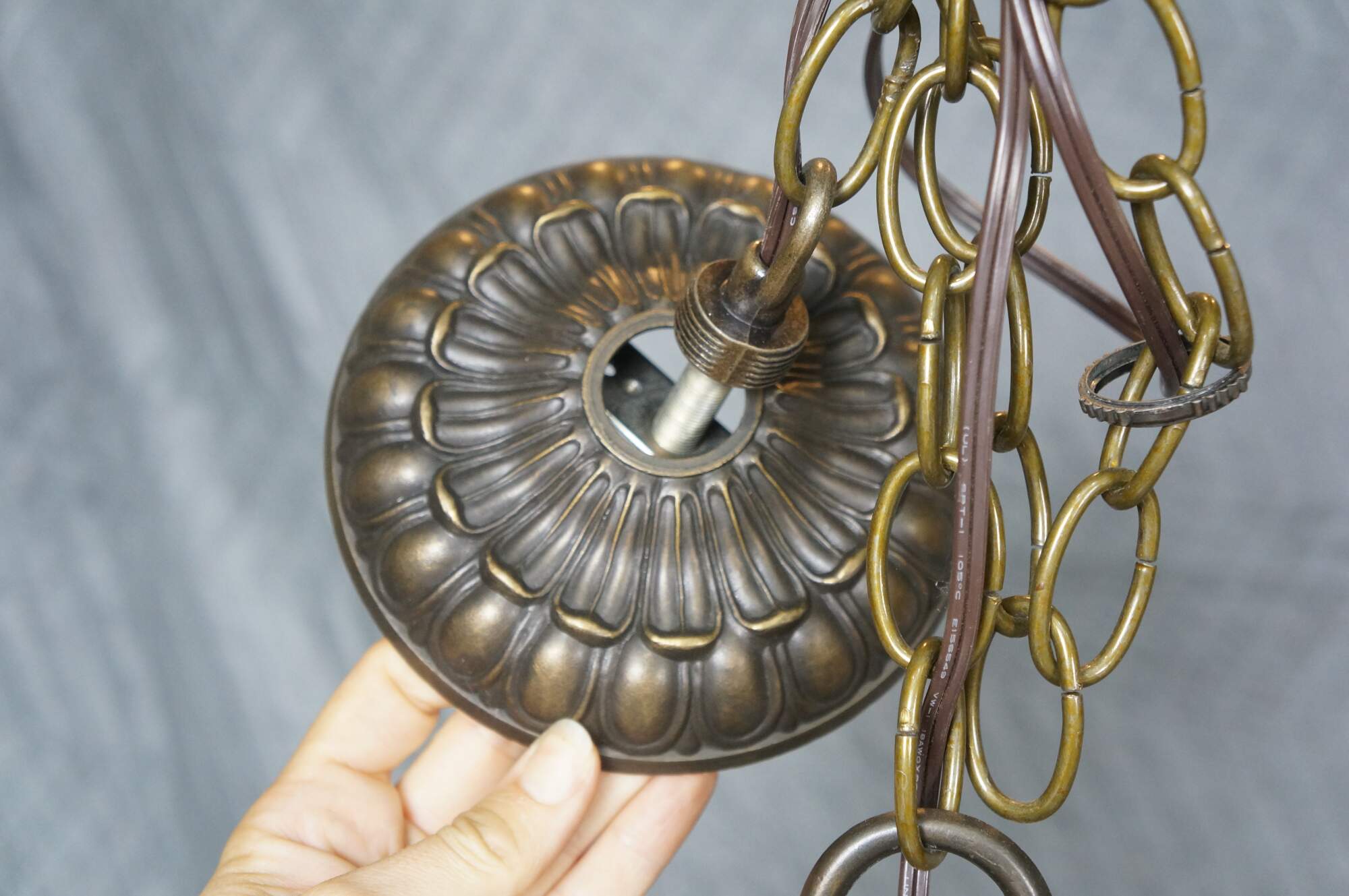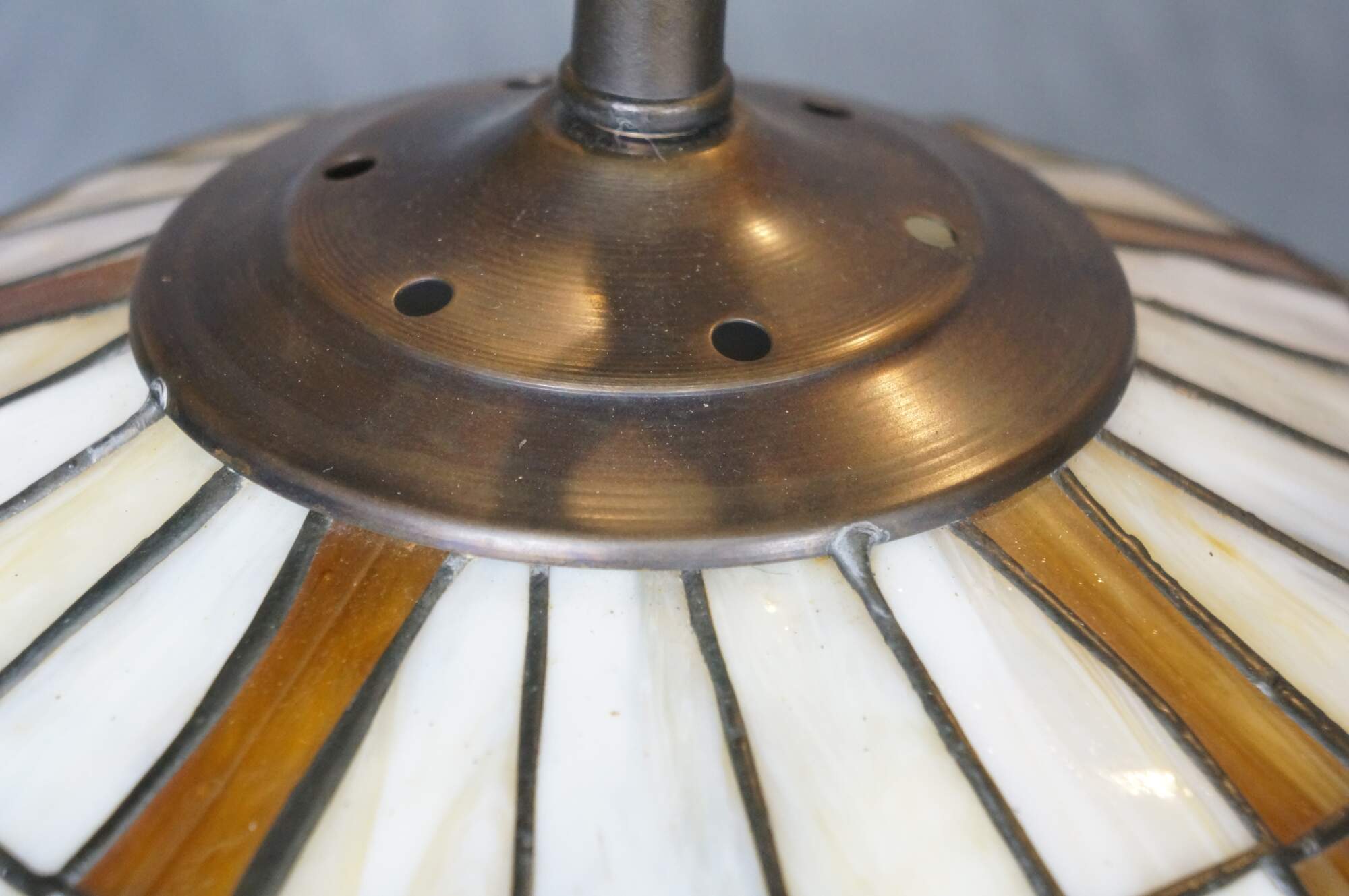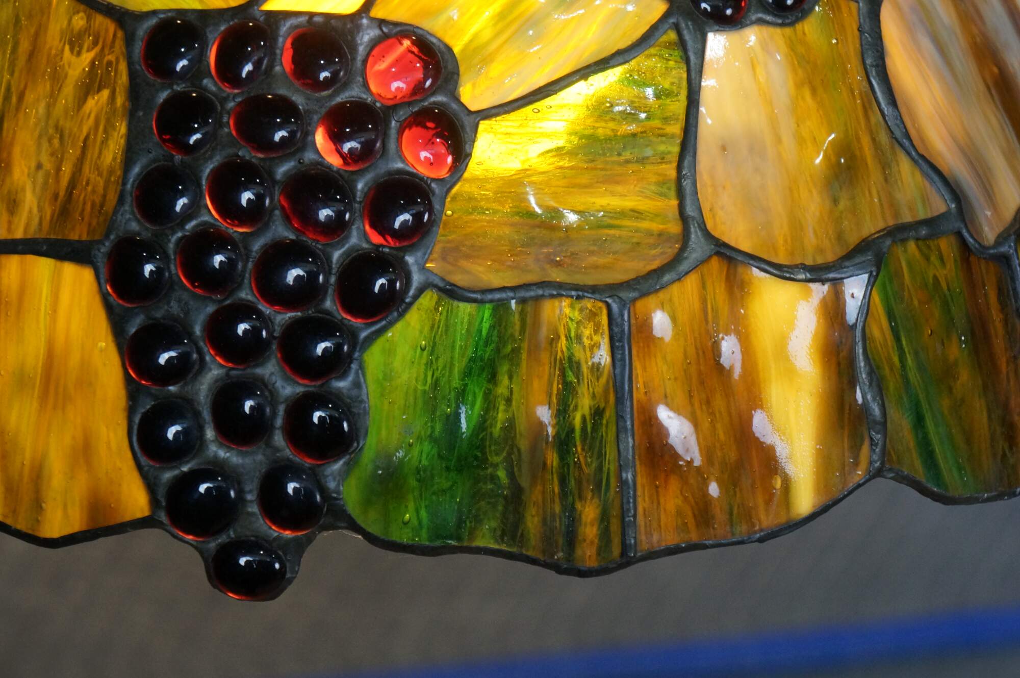 Mid to late 20th century L&L WMC / Loevsky & Loevsky, White Metal Castings Company slag glass Tiffany-style pendant light shade / swag chandelier. Round form with off white and green stained glass panels accented with a fruiting grapevine. Hardwired. Includes chain and ceiling medallion.