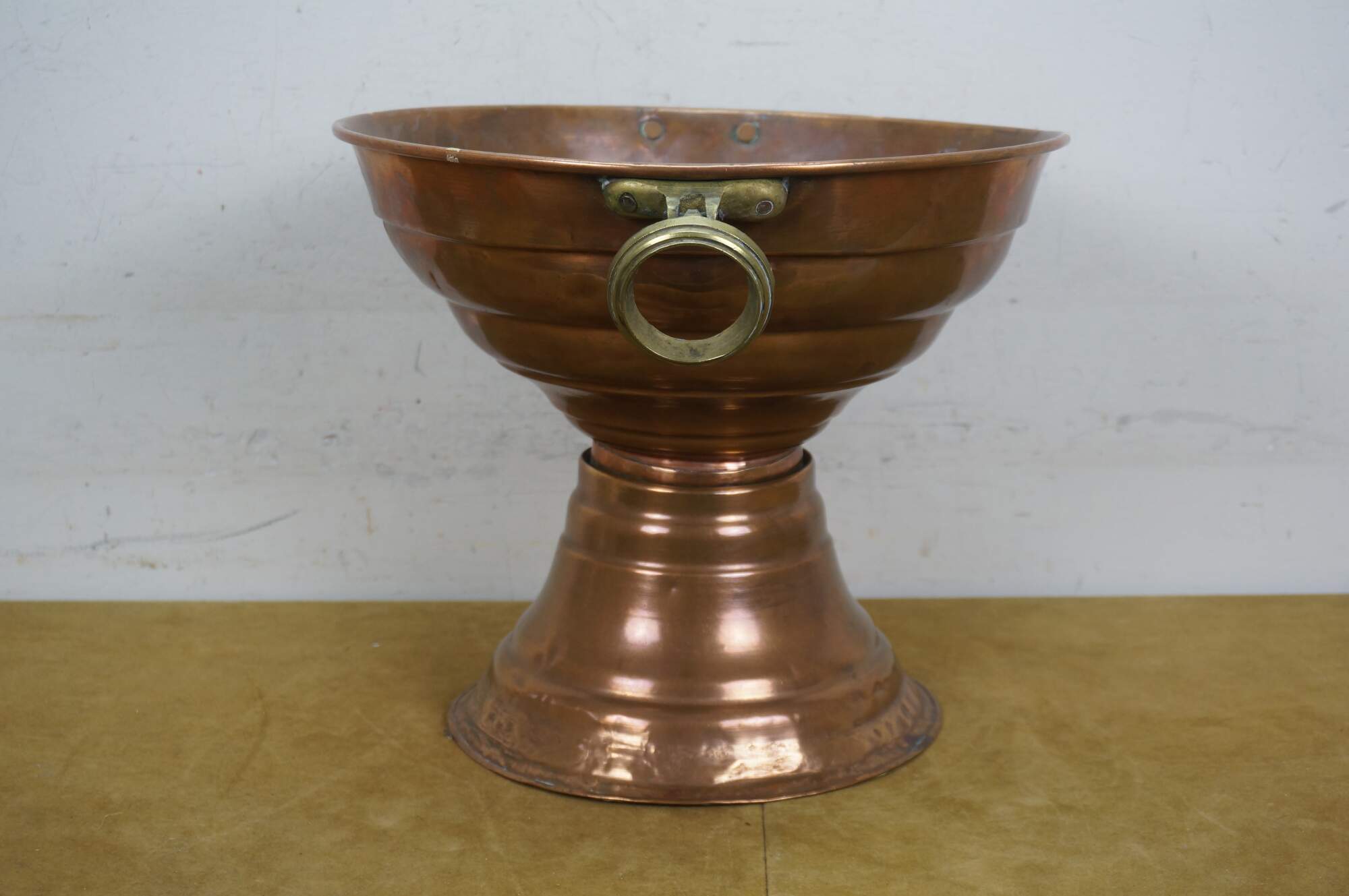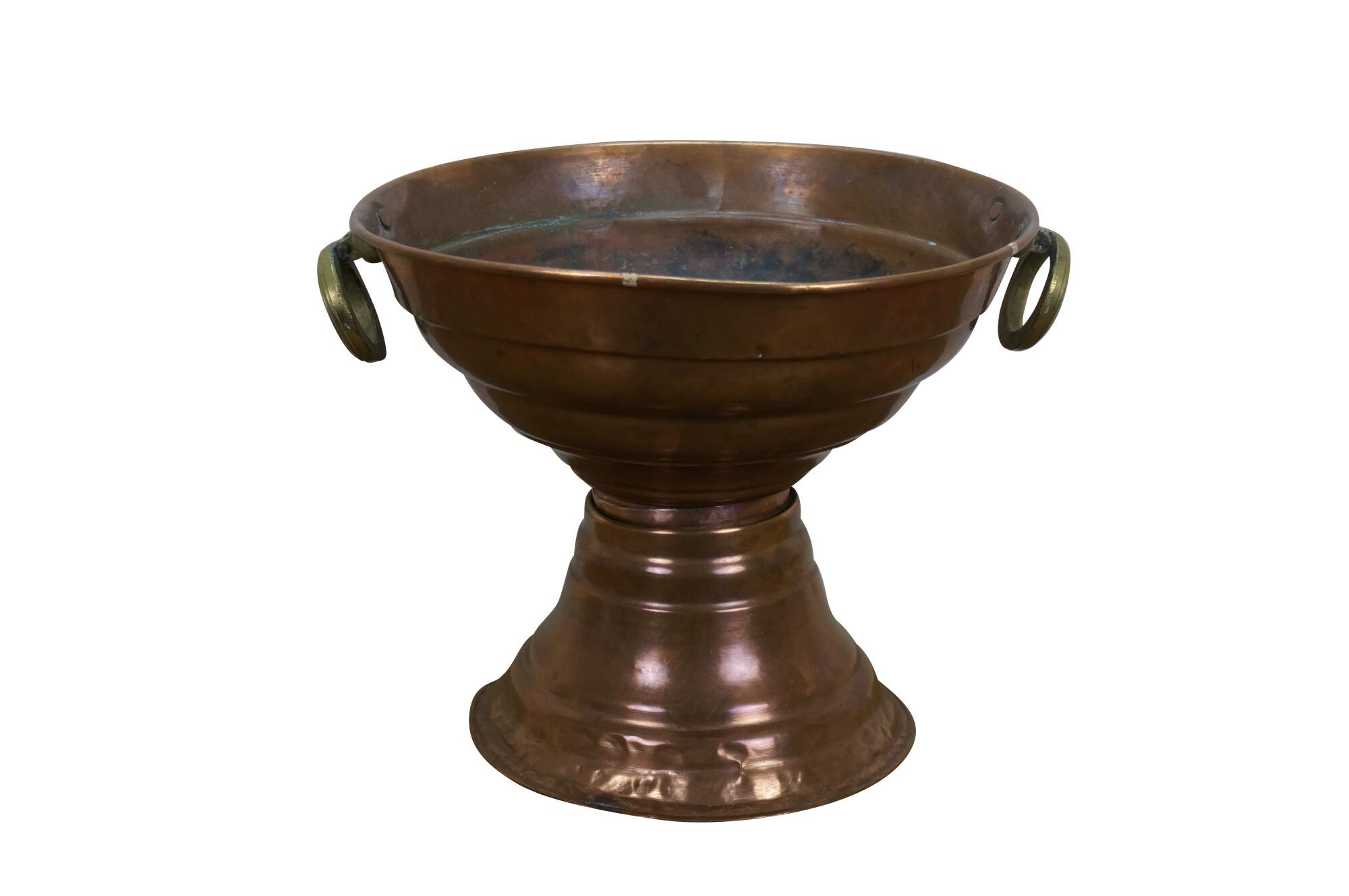 Vintage footed copper planter / urn / pot featuring large pedestal base with brass handles and tiered design.