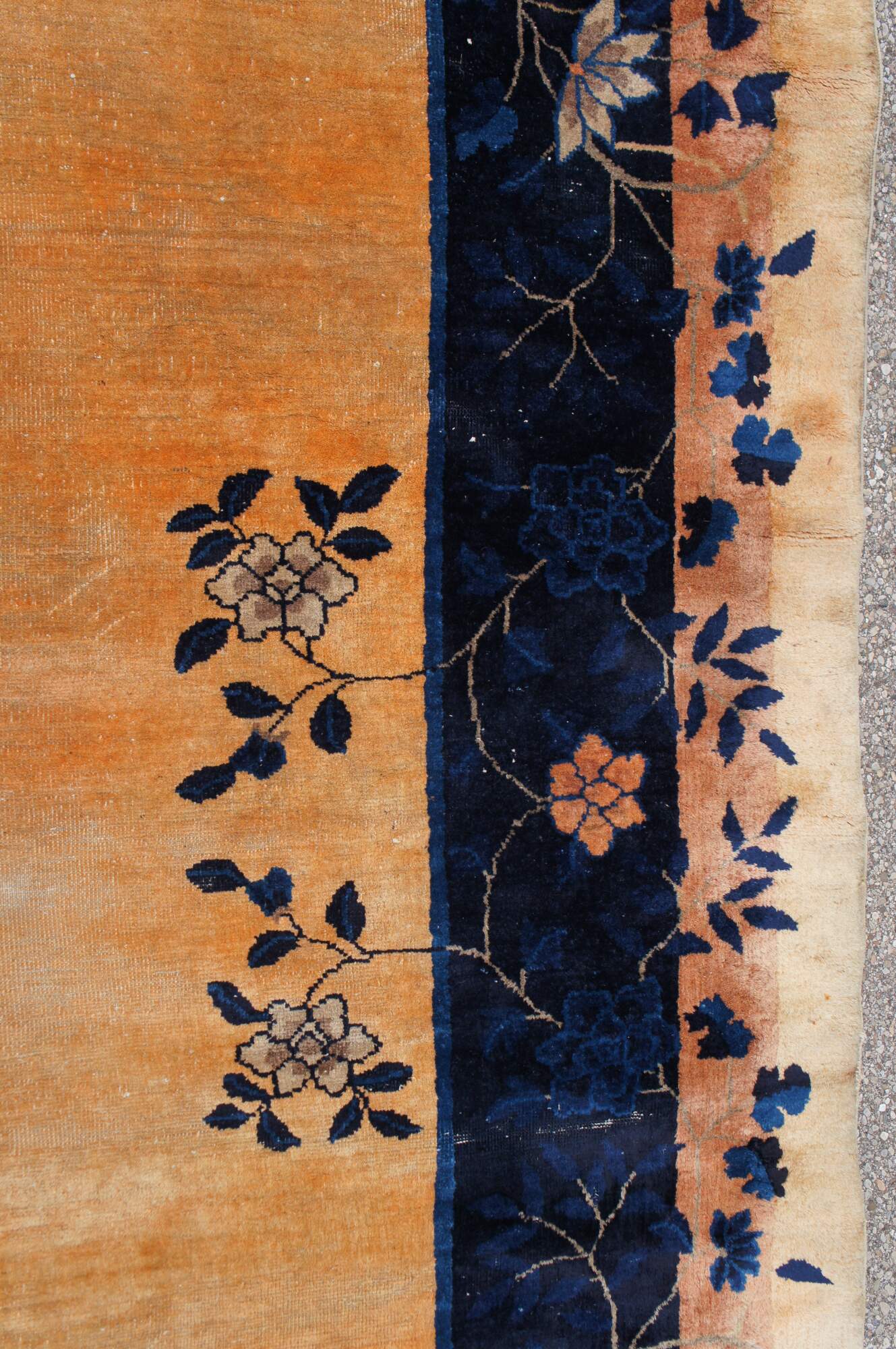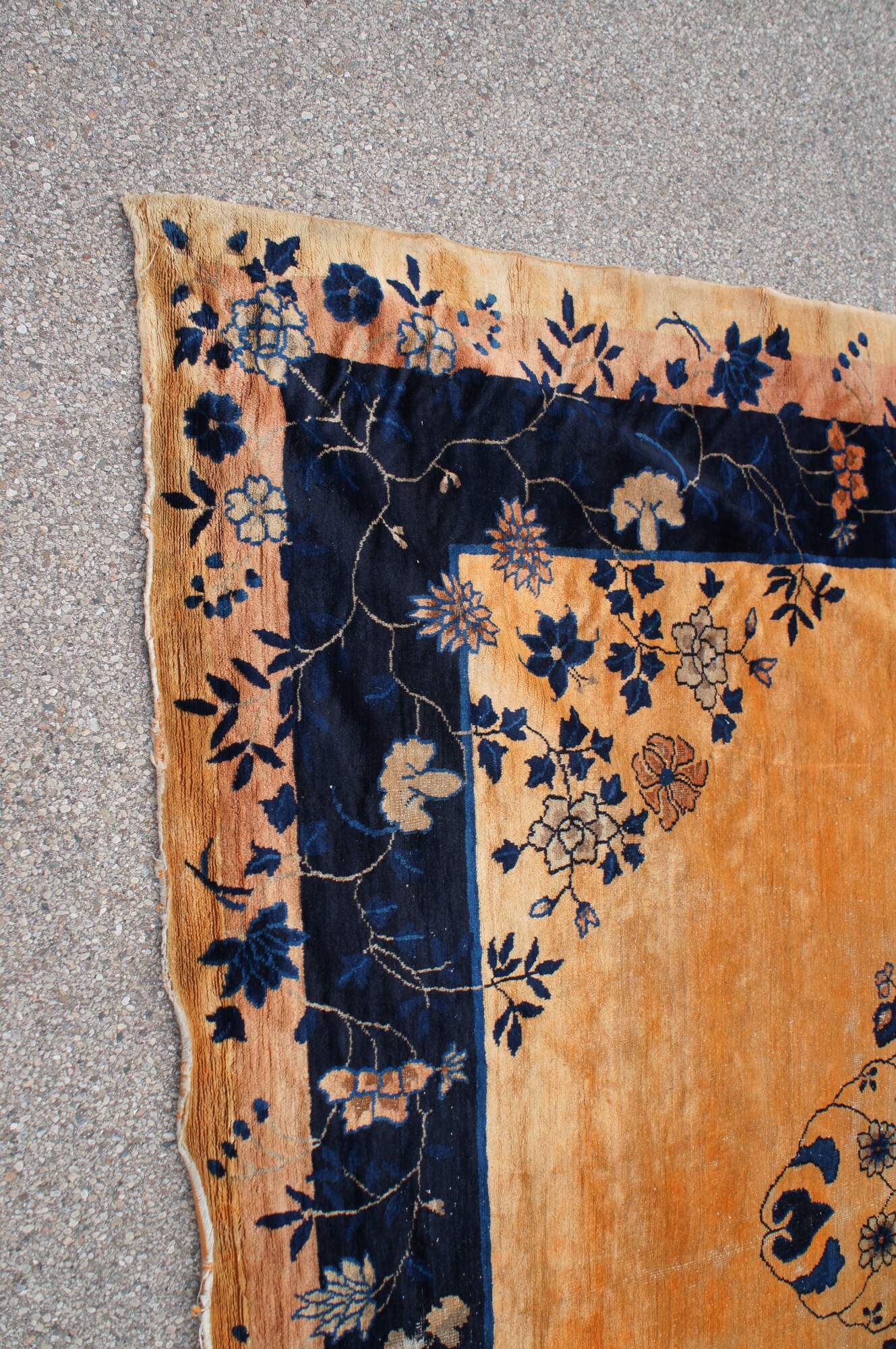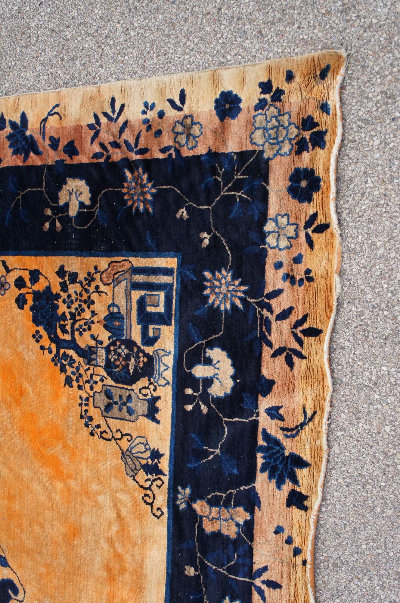 Vintage Hand Woven Chinese Peking Art Deco Oriental Area Rug. Features blue and orange foliate leaf design with central medallion. Two of the corners showcase a table with tea and vases.