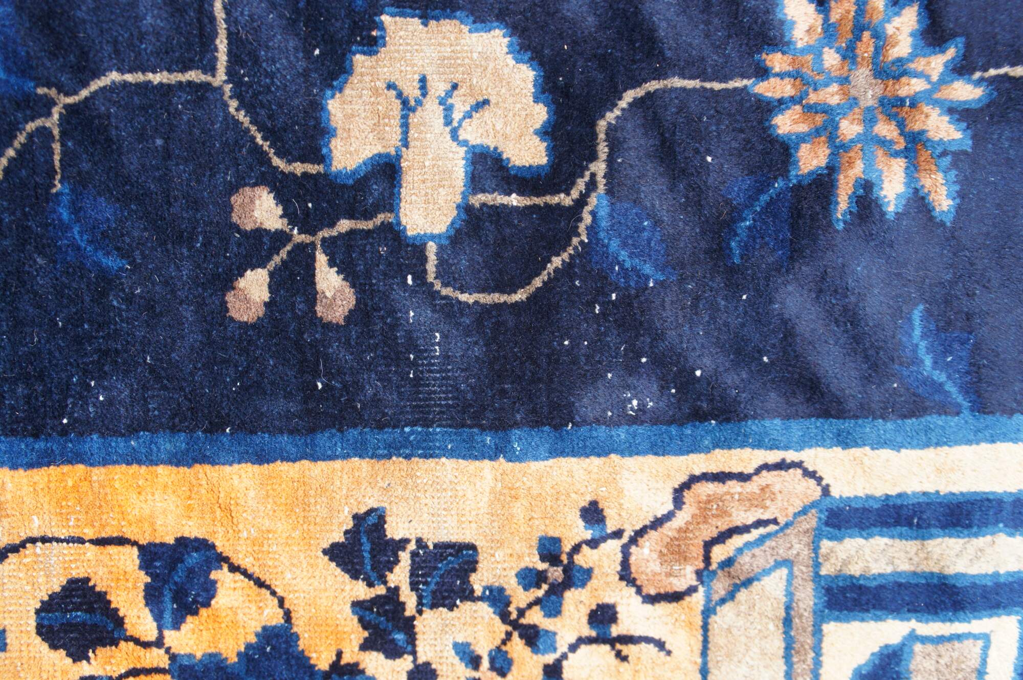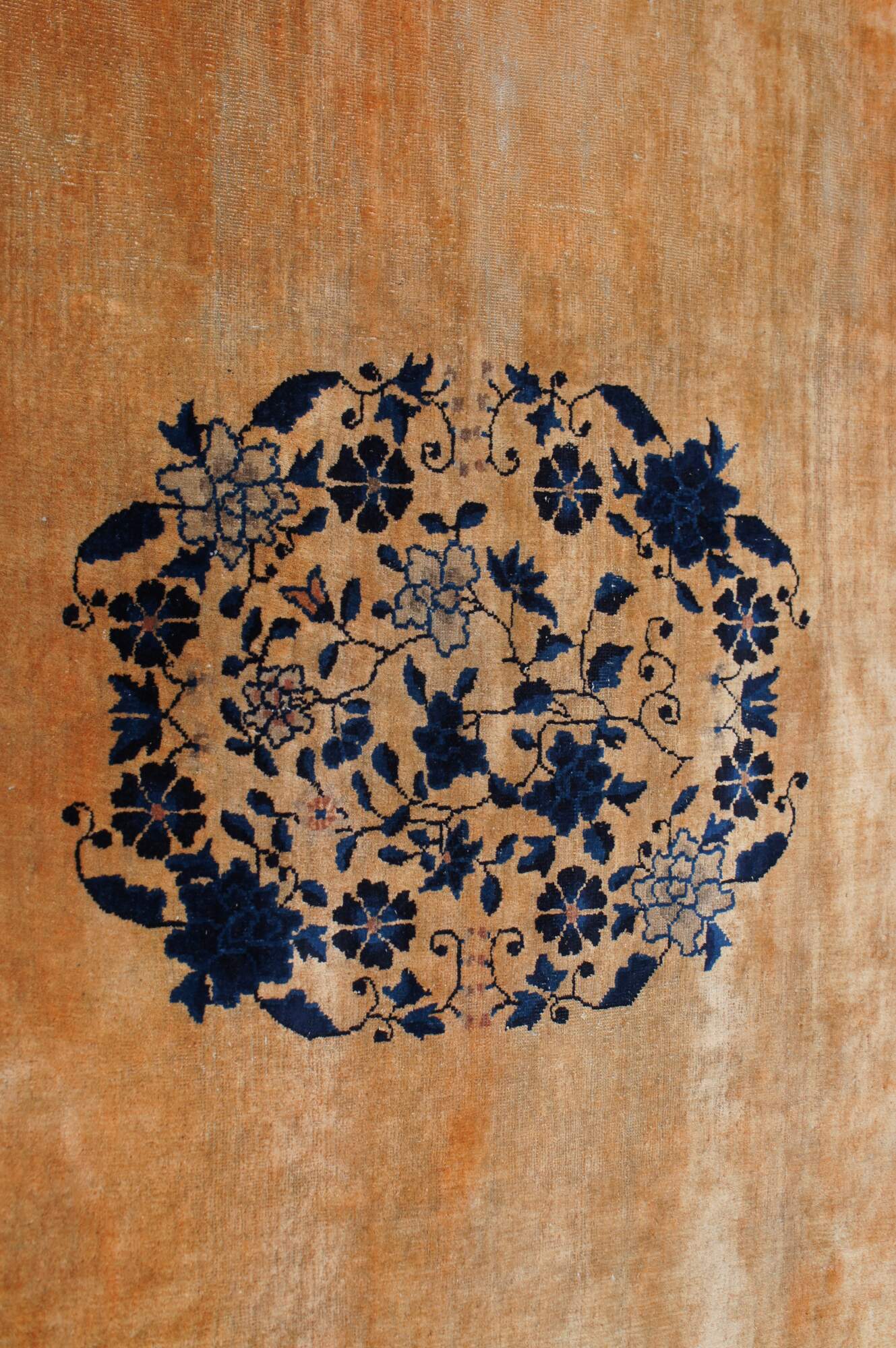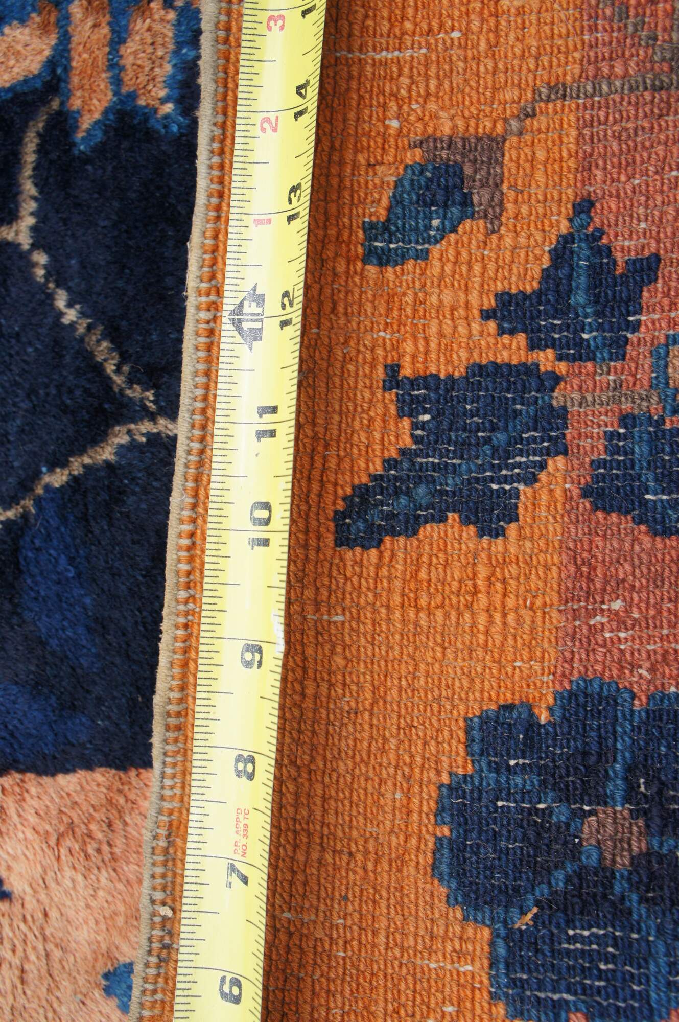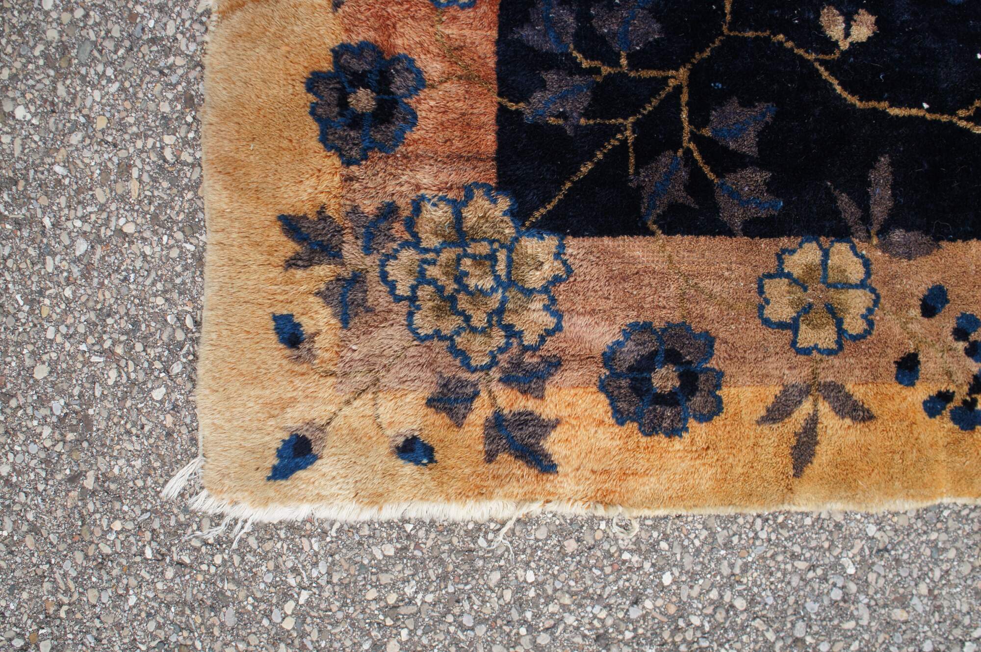 Vintage Hand Woven Chinese Peking Art Deco Oriental Area Rug. Features blue and orange foliate leaf design with central medallion. Two of the corners showcase a table with tea and vases.