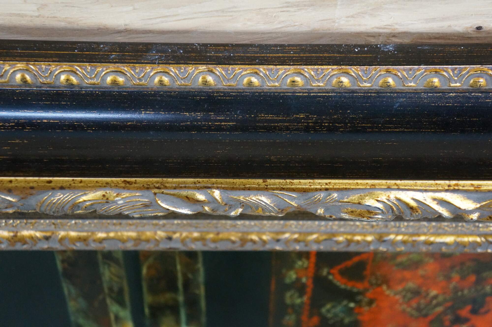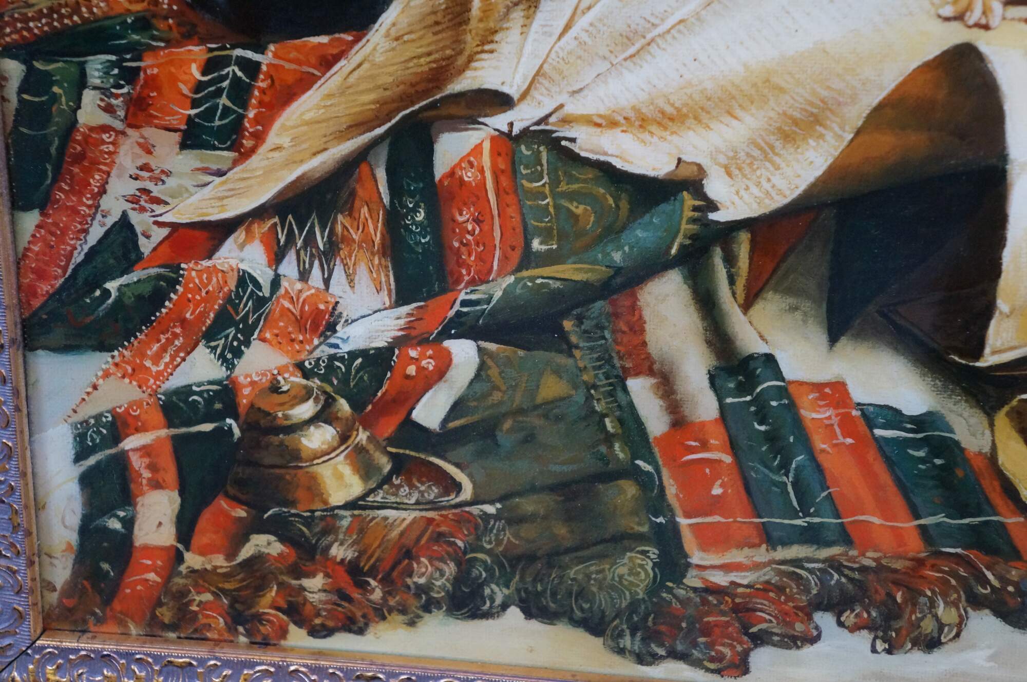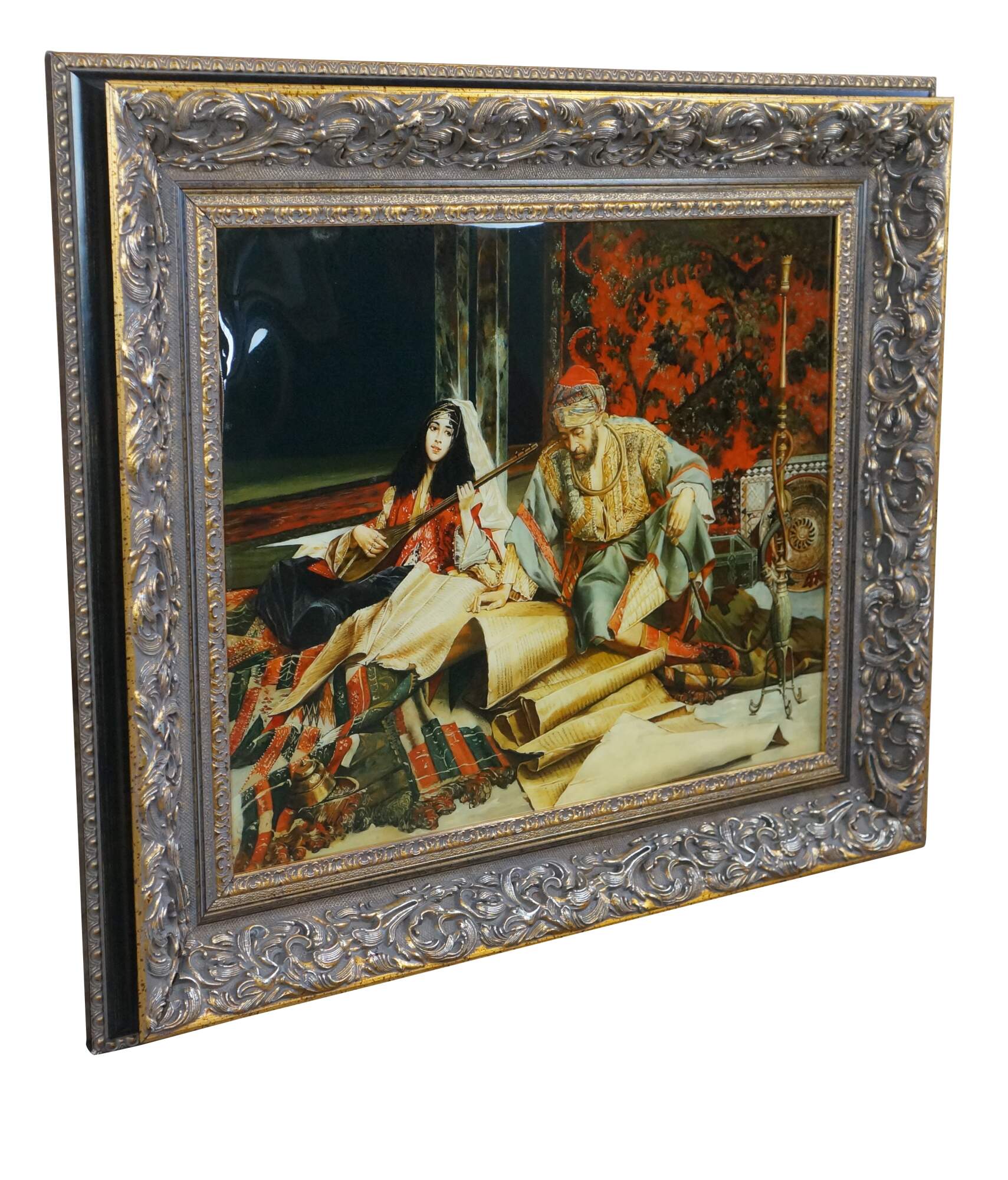 Painting on canvas, mounted to board with protective glossy resin coating. The painting features a man reading a parchment scroll while smoking a hookah. On his side is a woman playing a lute. The two are seated on an oriental rug. The painting is ornately framed in wood.