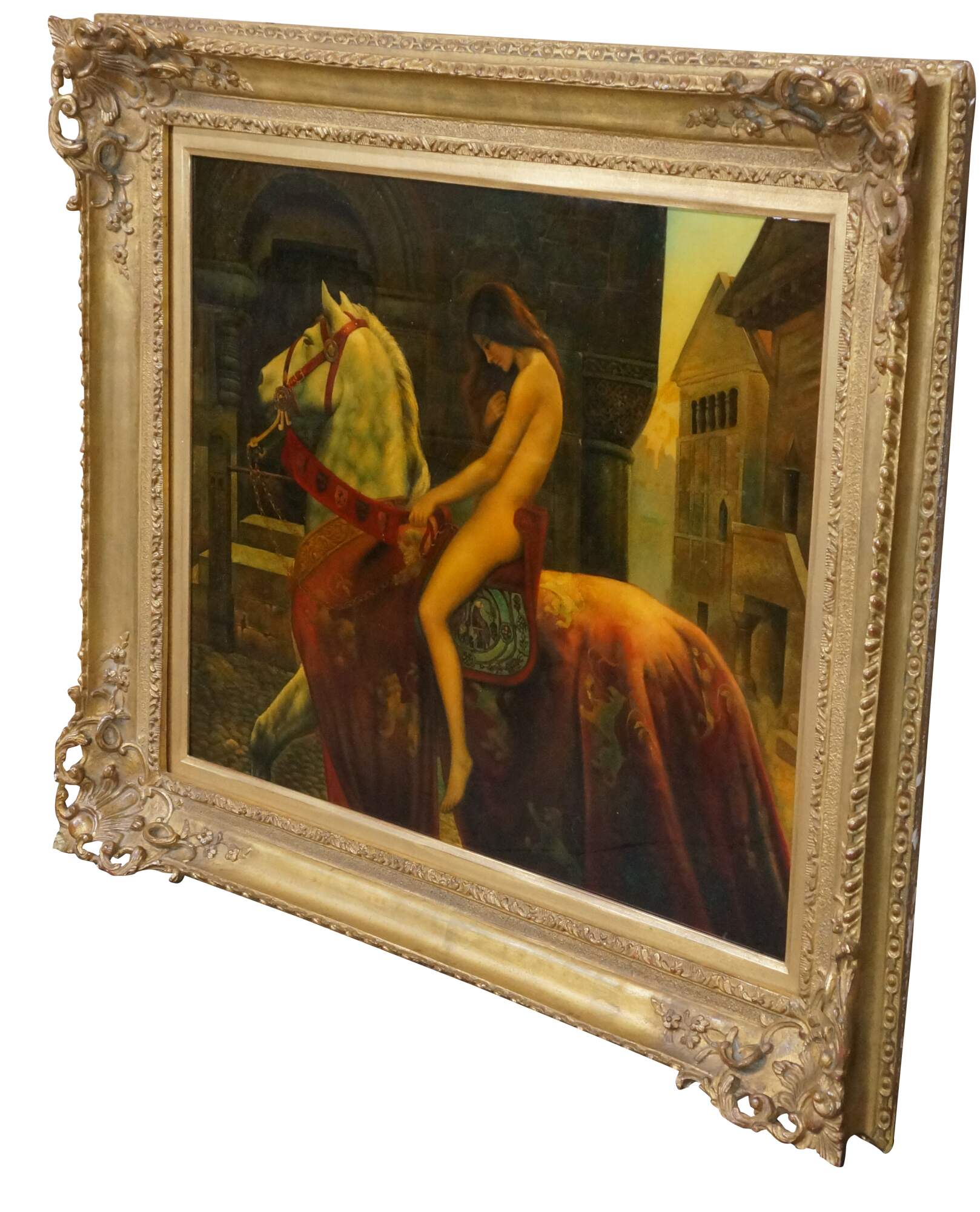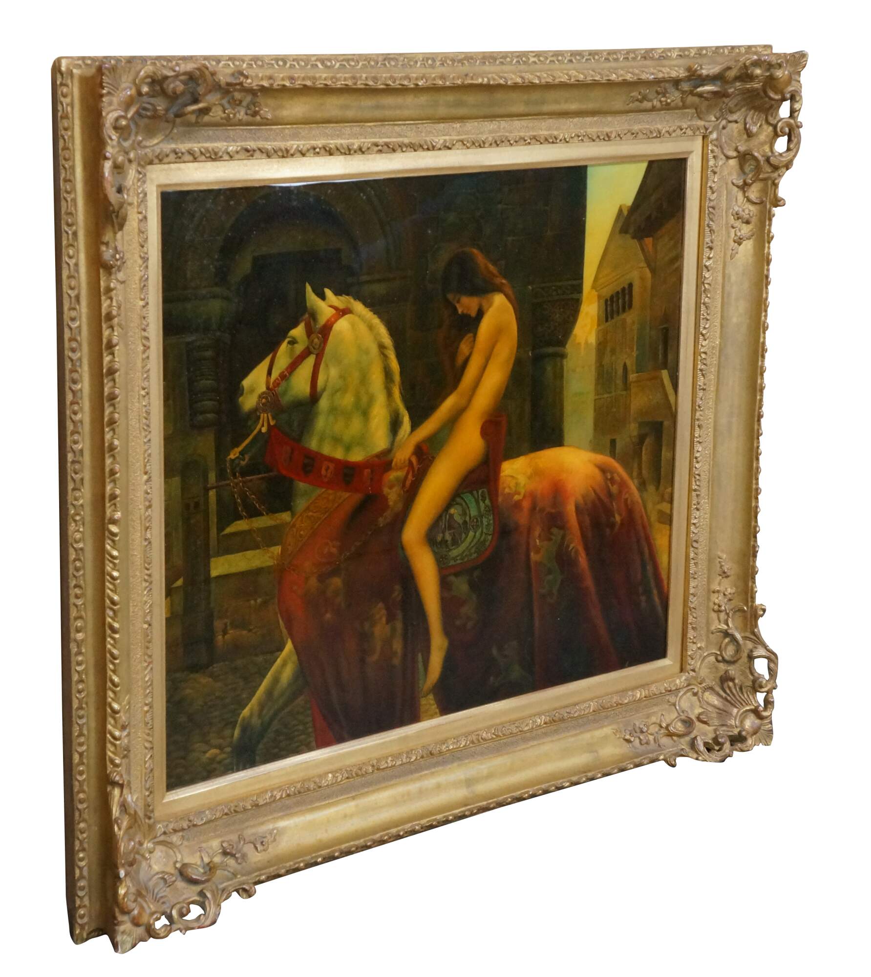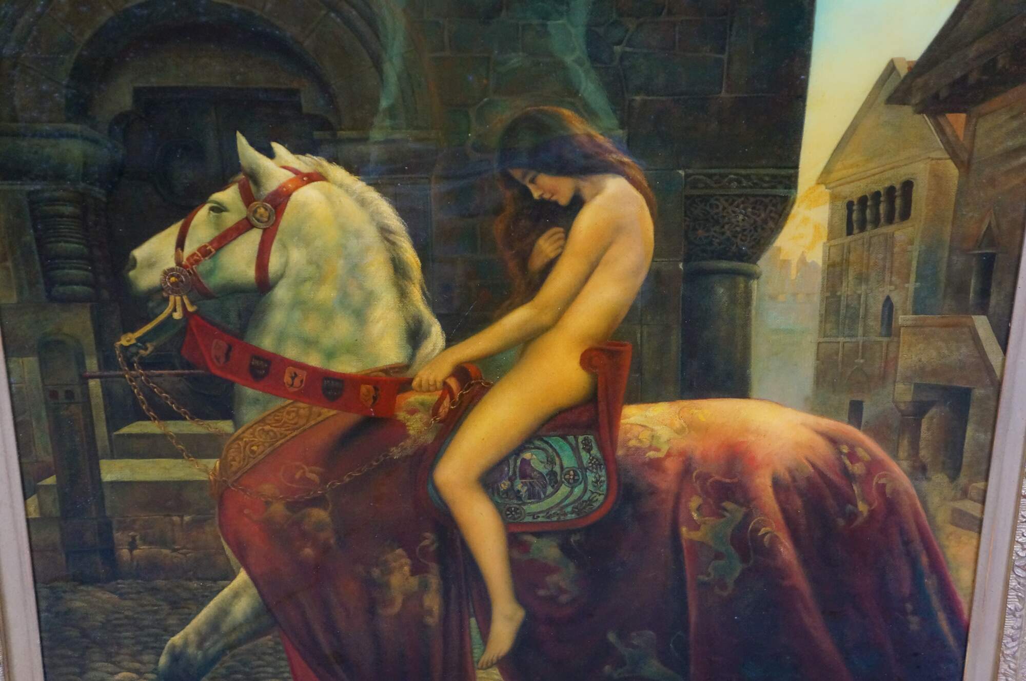 Lady Godiva reproduction Painting after John Collier, circa late 20th Century. Oil on board, framed
