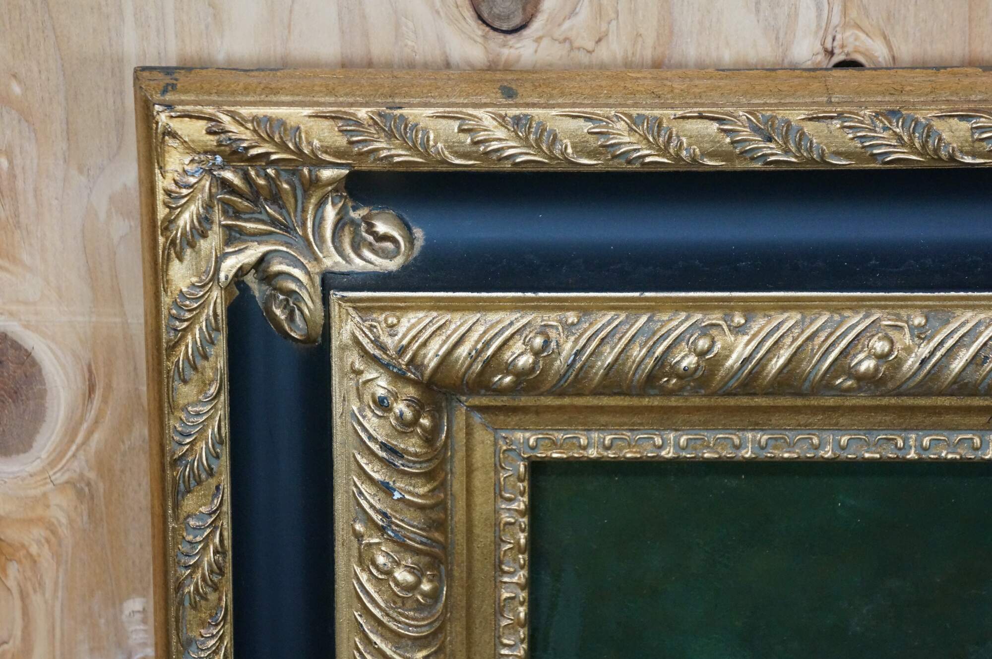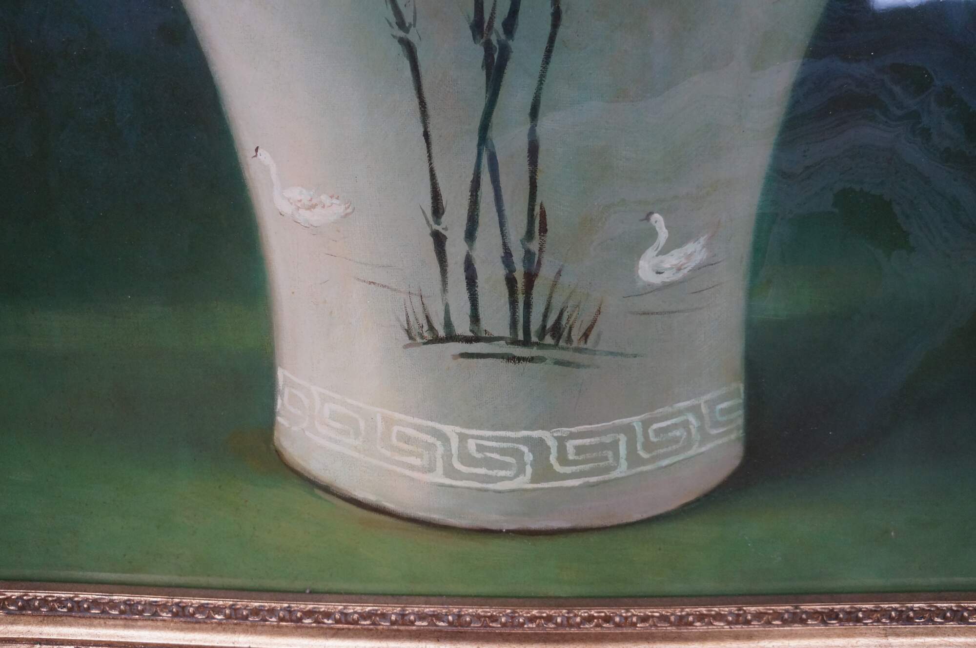 20th-century oil painting of a chinoiserie vase on canvas. The painting depicts a traditional urn or vase with plum branches, swans, and a Greek key design along the base. The canvas is framed in black and gold.