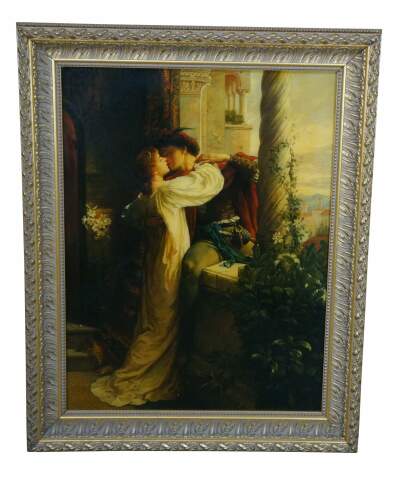 Romeo & Juliet Portrait after Frank Dicksee, circa last quarter 20th century. The original was painted in 1884. The canvas is epoxy coated to enhance color and ornately framed with a gold finish.