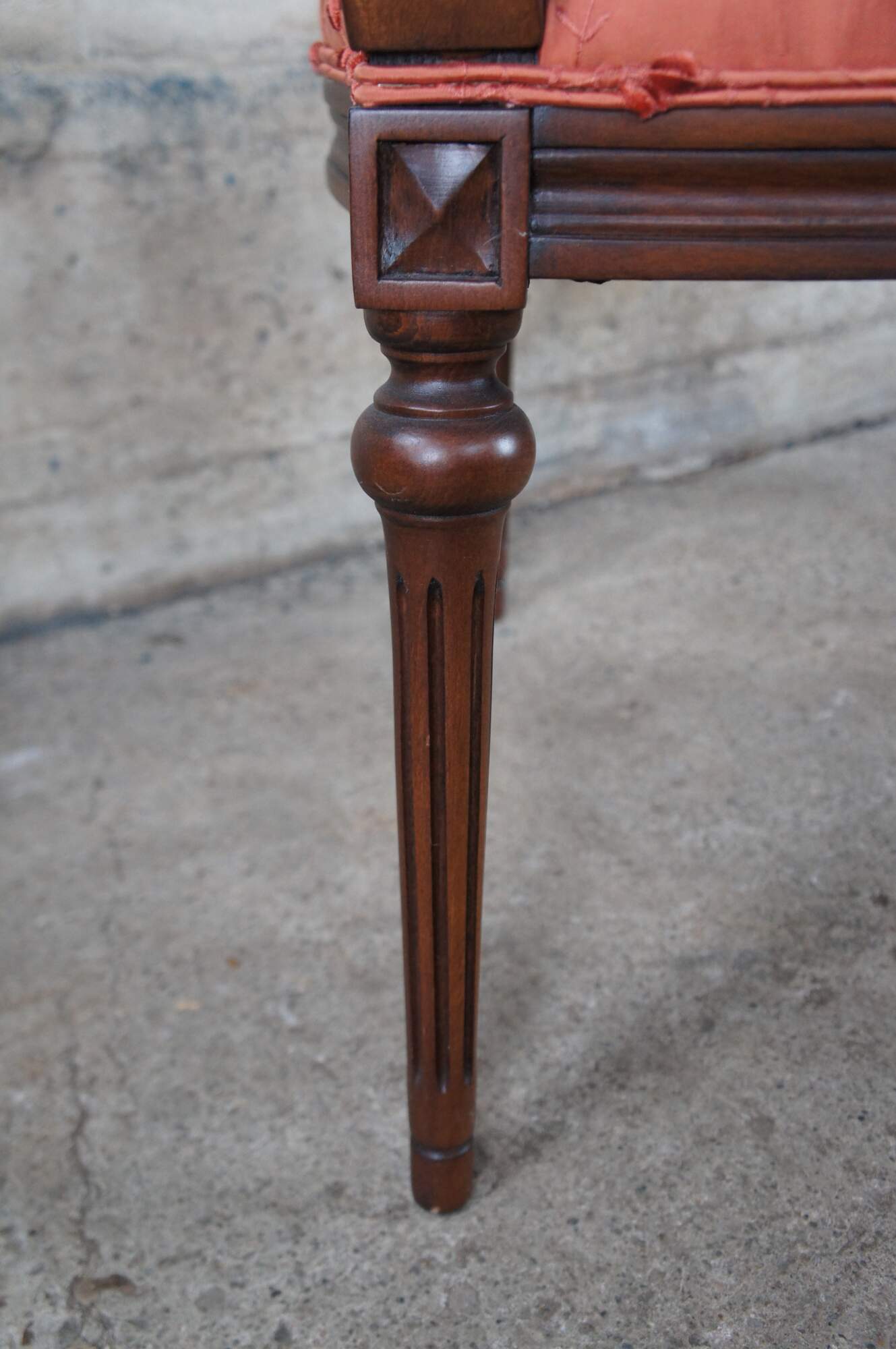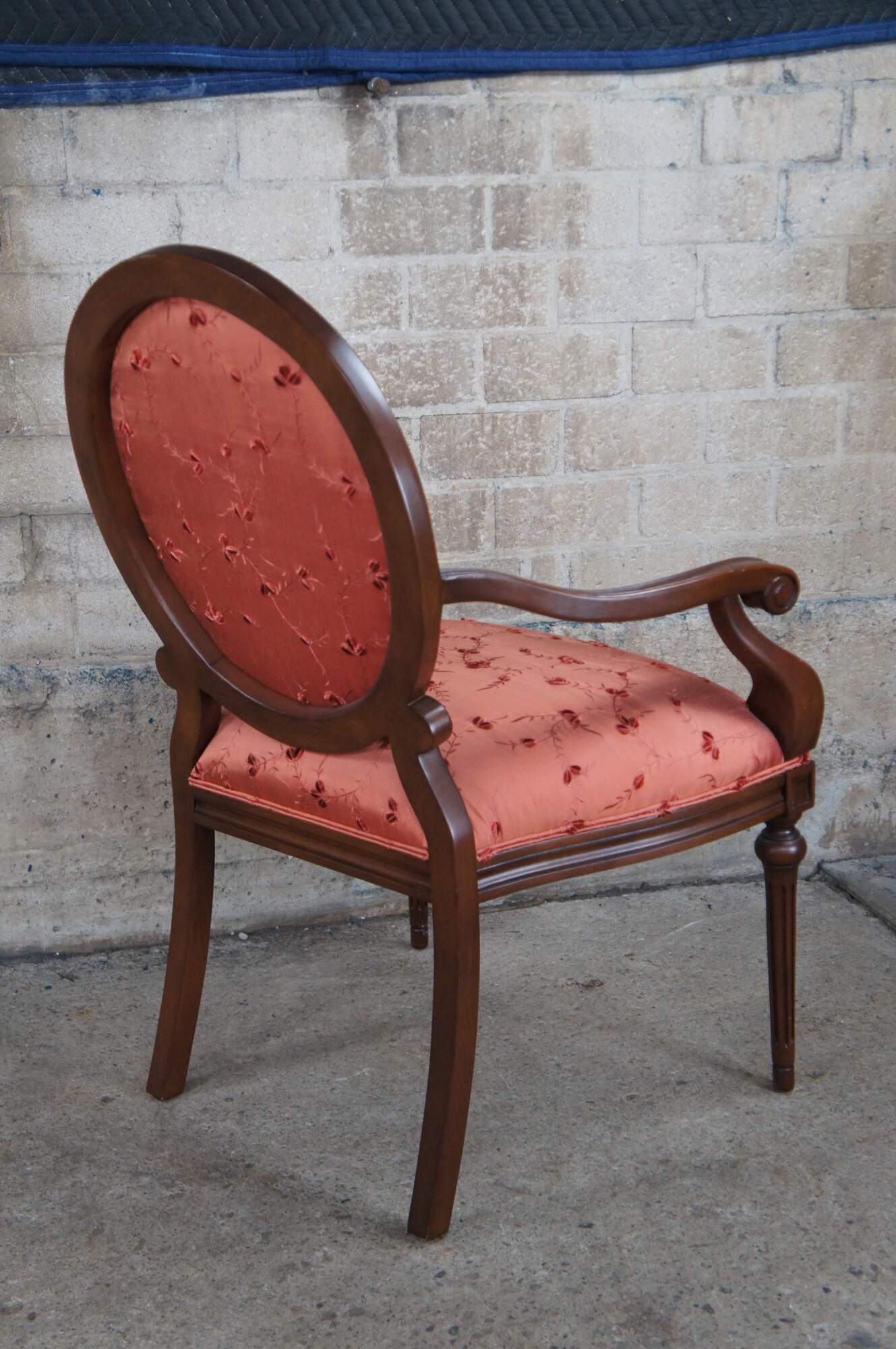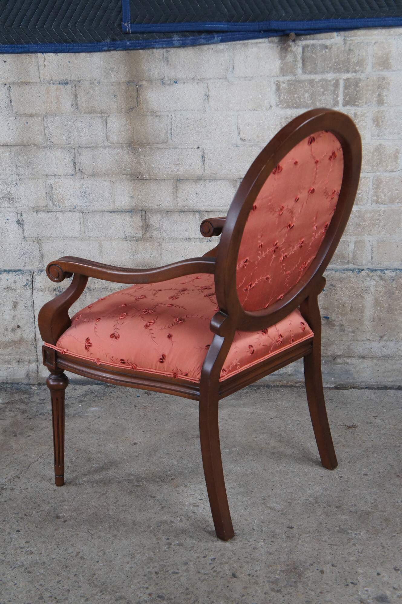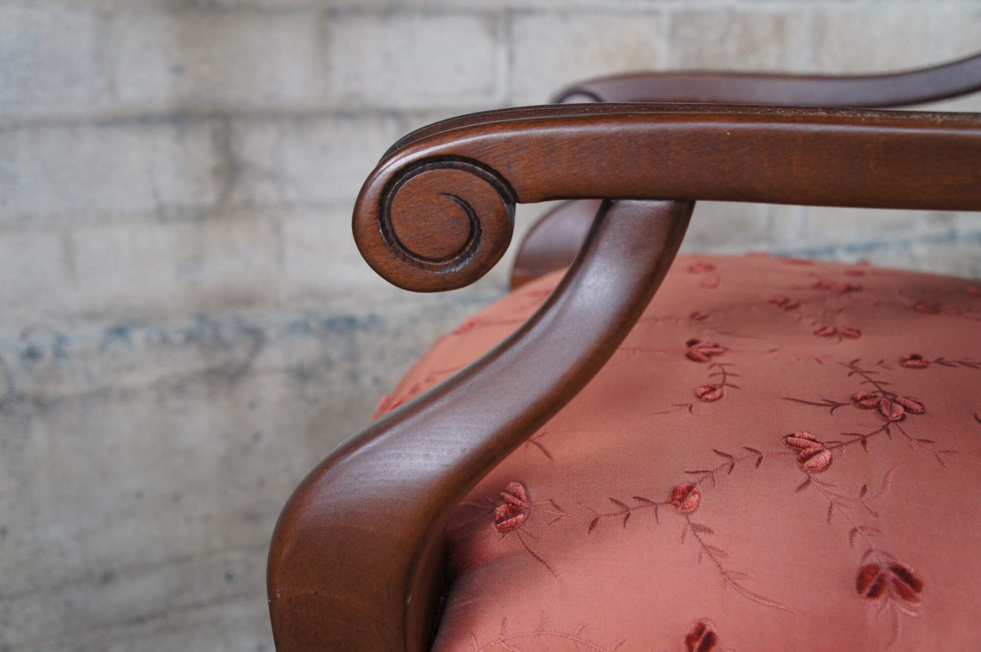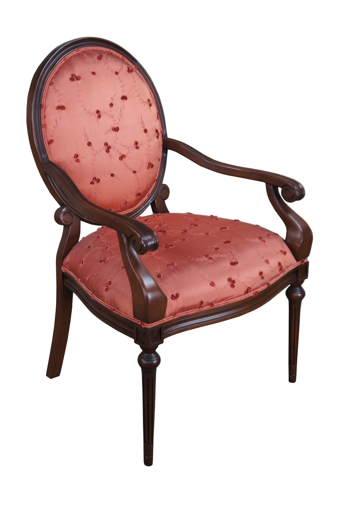 Two vintage Henredon Custom Folio Collection arm chairs. Made of mahogany featuring a round back with sloped arms, fluted legs and silk crewel raised floral upholstery.