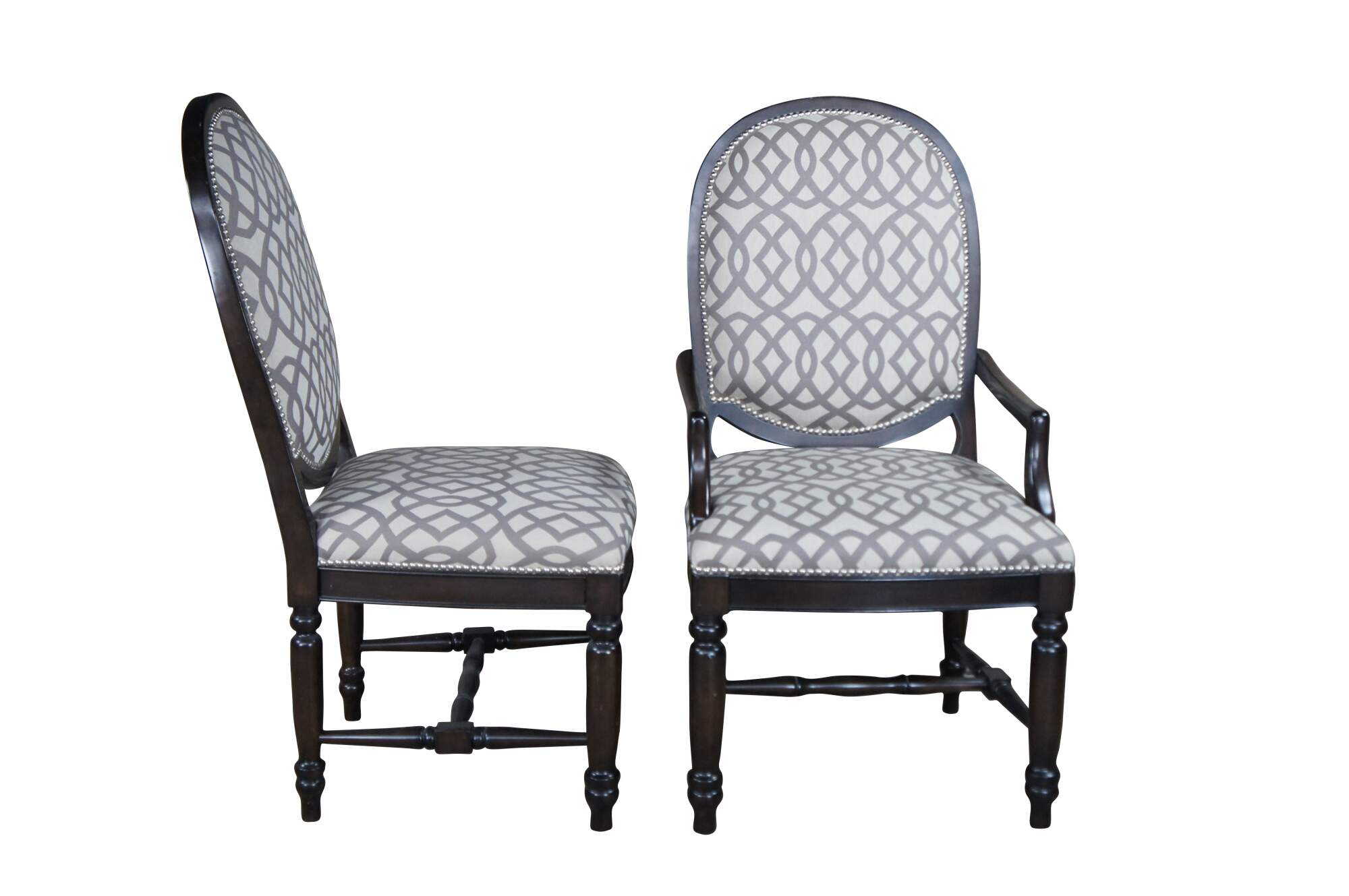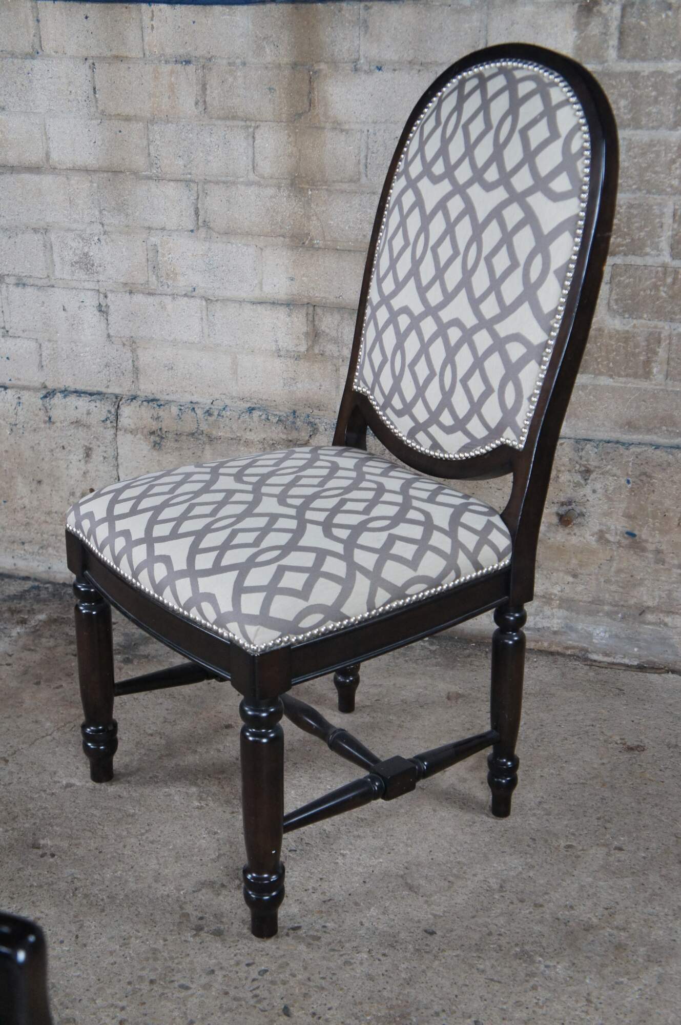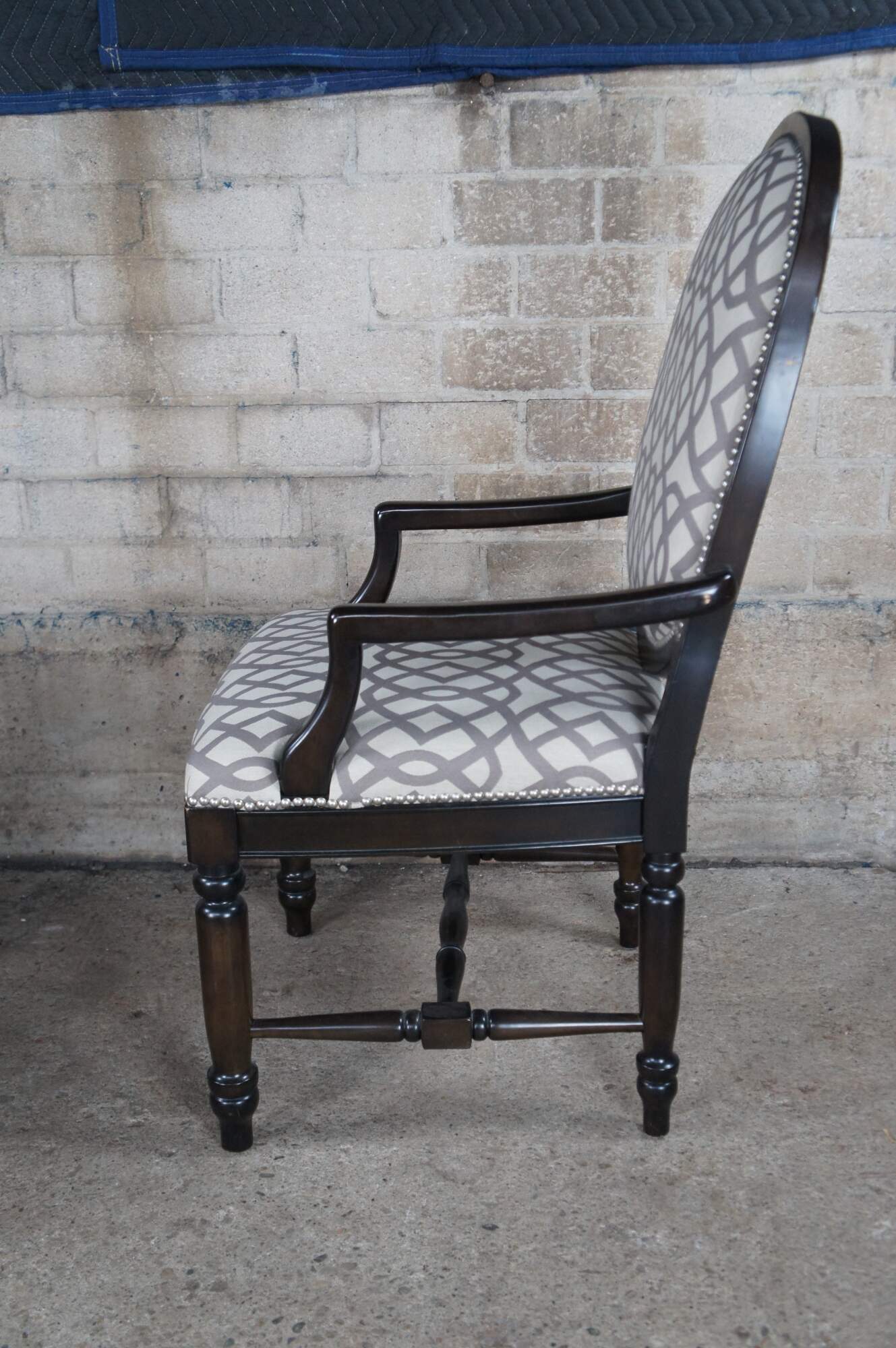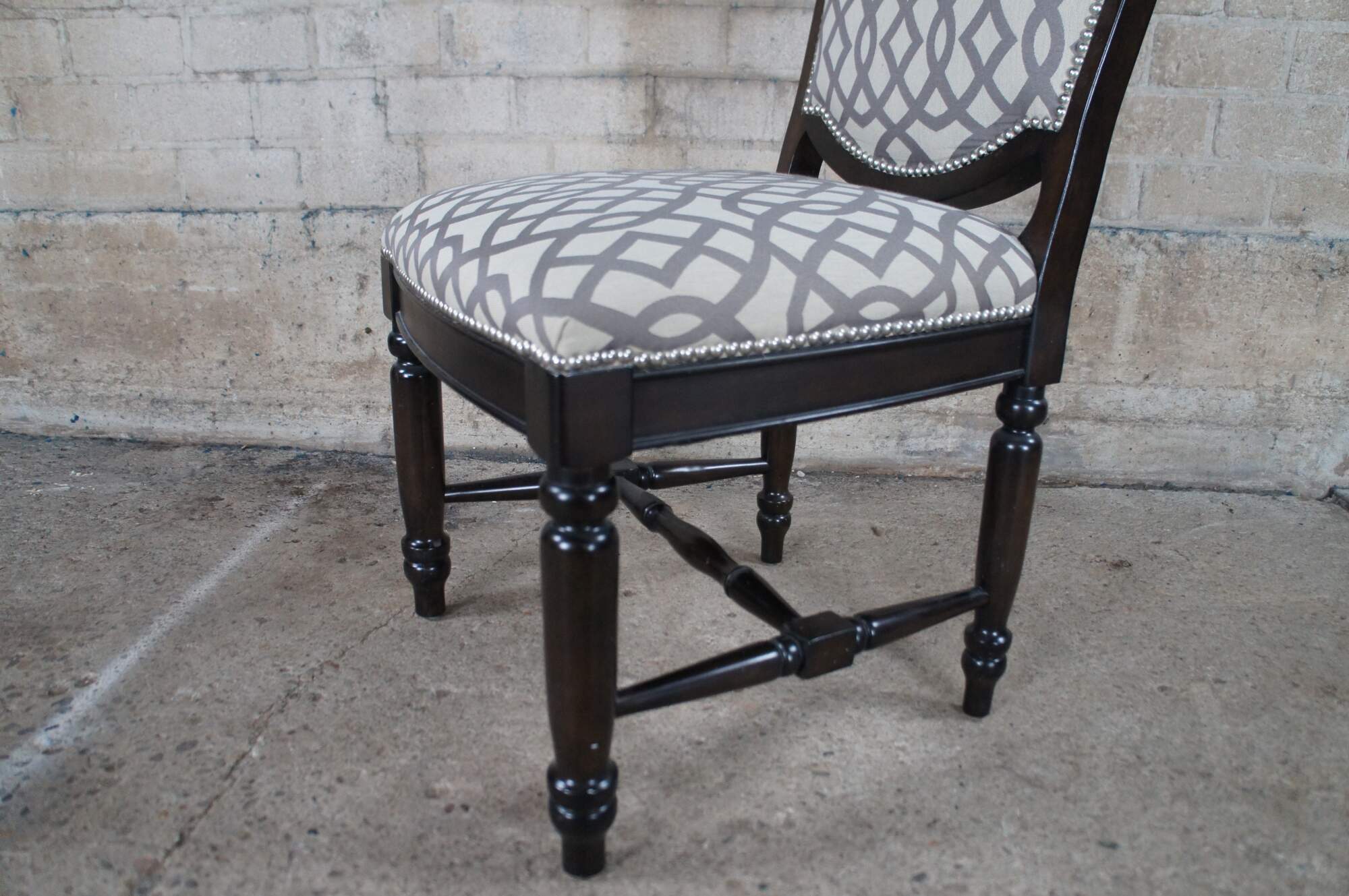 Set of six vintage Drexel Heritage oversized dining chairs featuring a contemporary fabric of interlocking geometric shapes accented with nailhead trim. The set includes two sloped armchairs and four side charis, all finished in dark walnut with turned legs and H stretchers.