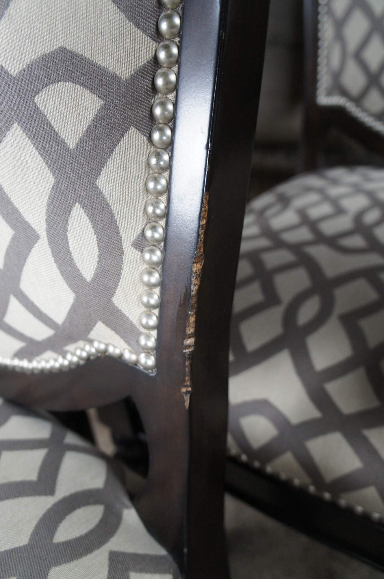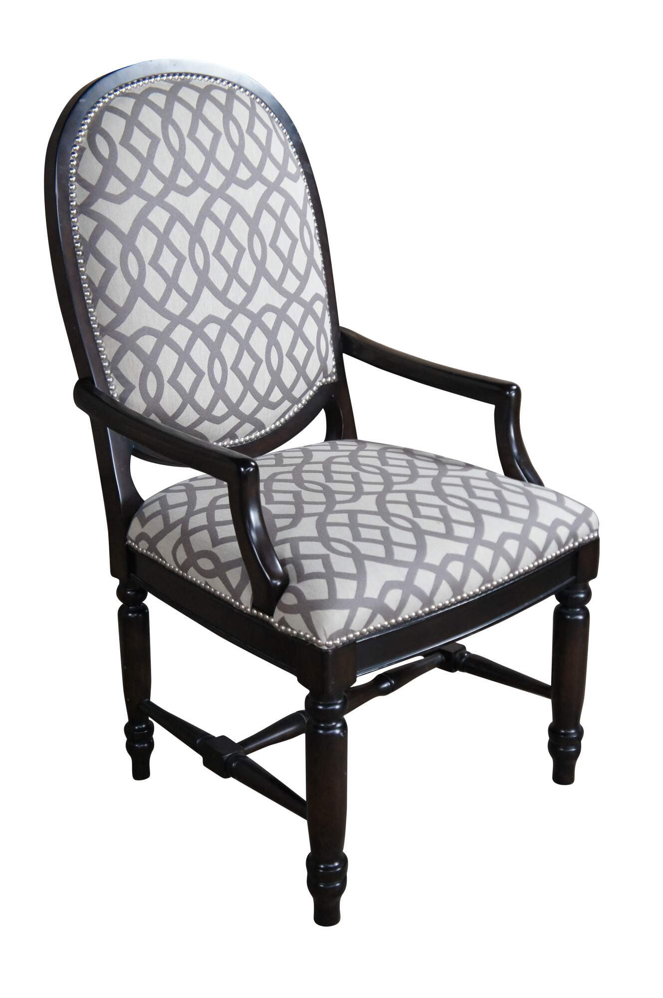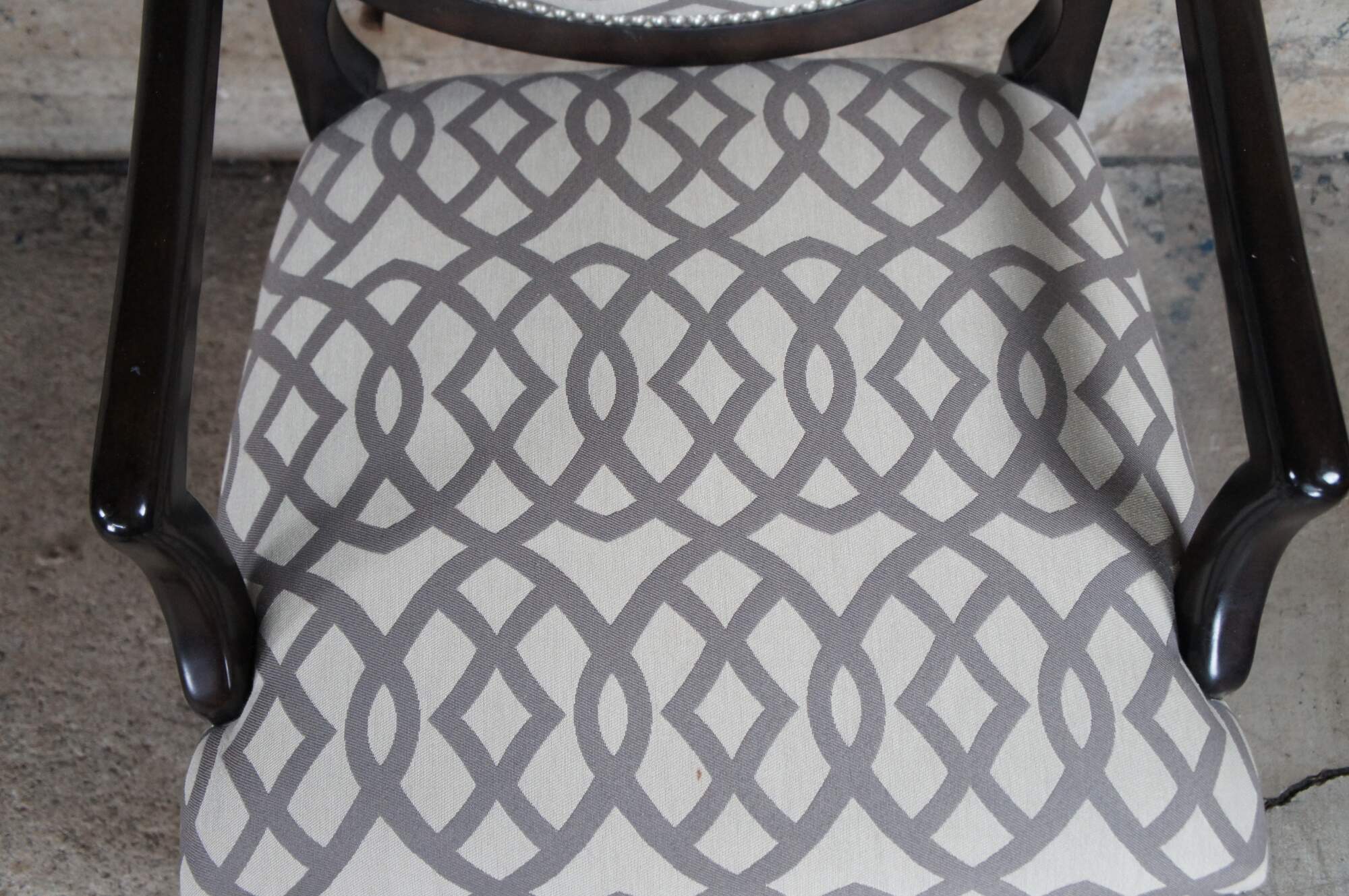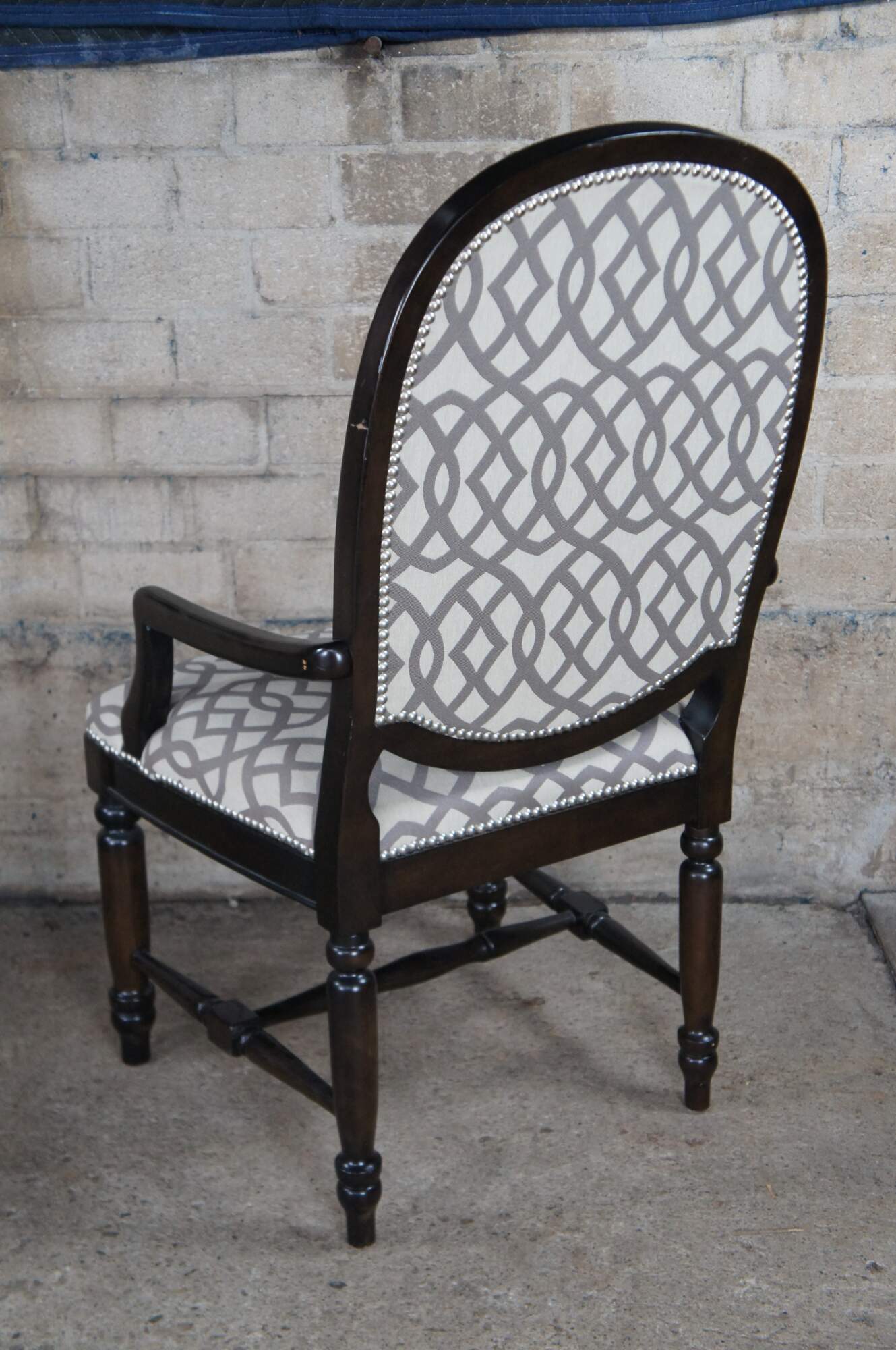 Set of six vintage Drexel Heritage oversized dining chairs featuring a contemporary fabric of interlocking geometric shapes accented with nailhead trim. The set includes two sloped armchairs and four side charis, all finished in dark walnut with turned legs and H stretchers.