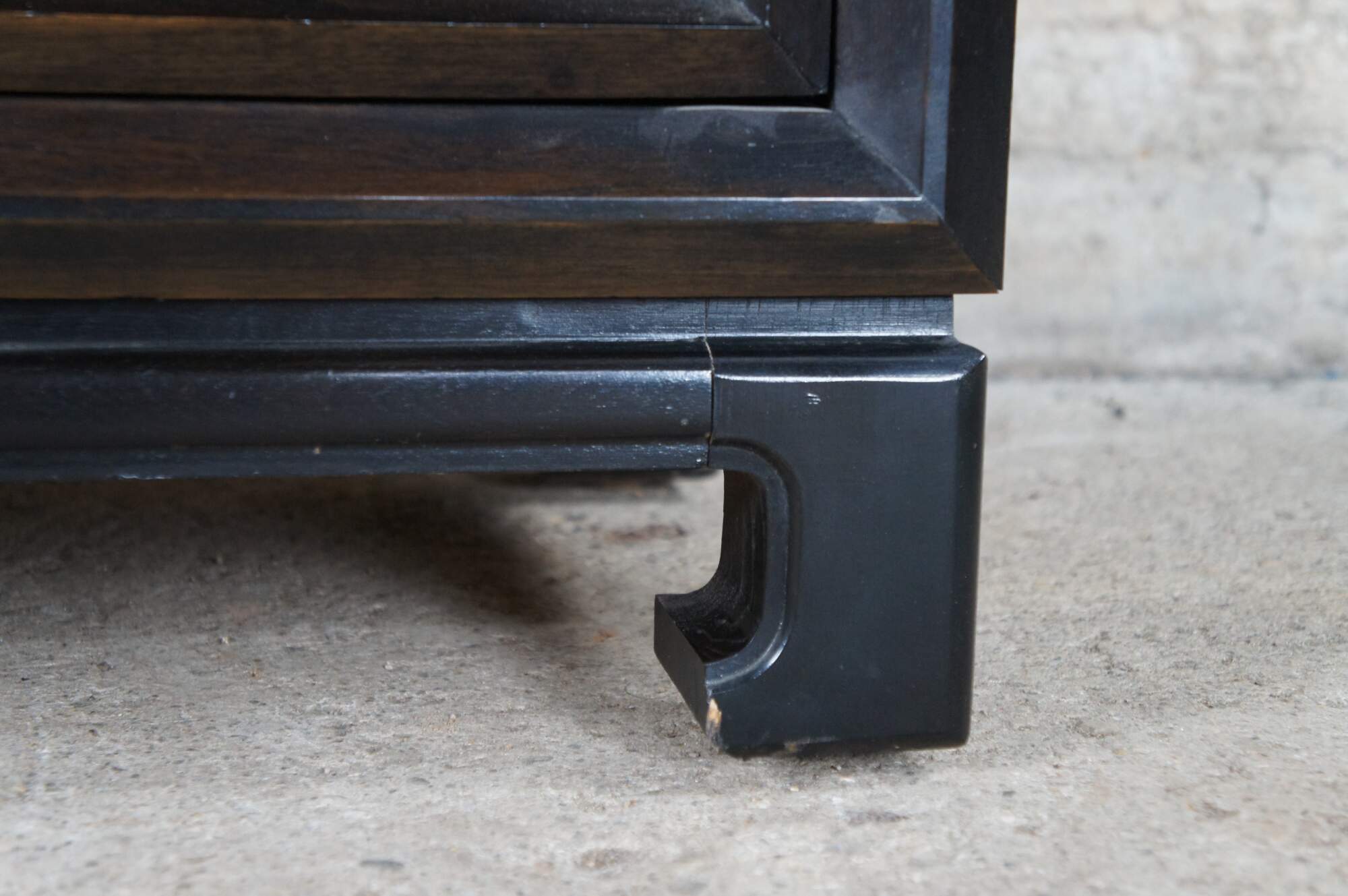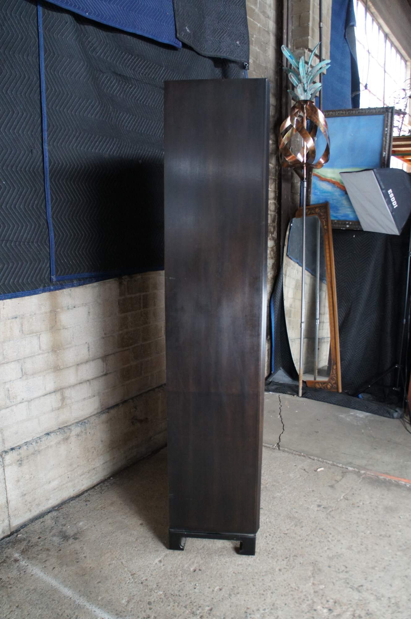 Vintage 1971 Thomasville Furniture bookcase / china cabinet / curio / showcase / drybar / hutch. Made of walnut featuring chinoiserie styling with beveled glass and burl walnut paneled doors - accented with brass ring knocker style hardware. The cabinet doors open to three illuminated shelves with plate grooves and one lower divided silverware drawer. 6529-410.