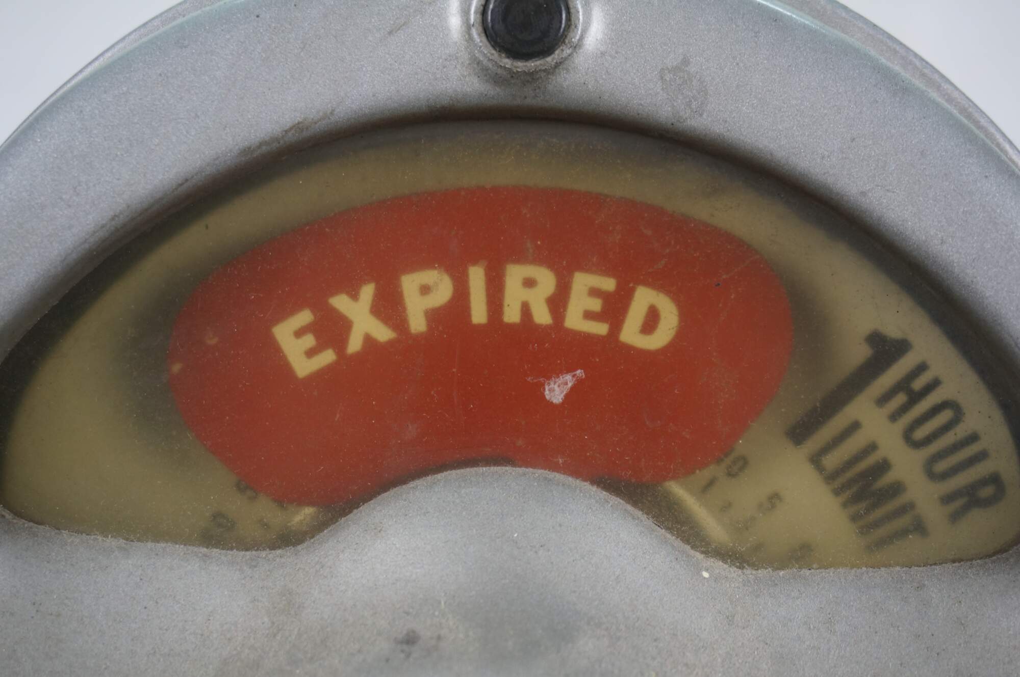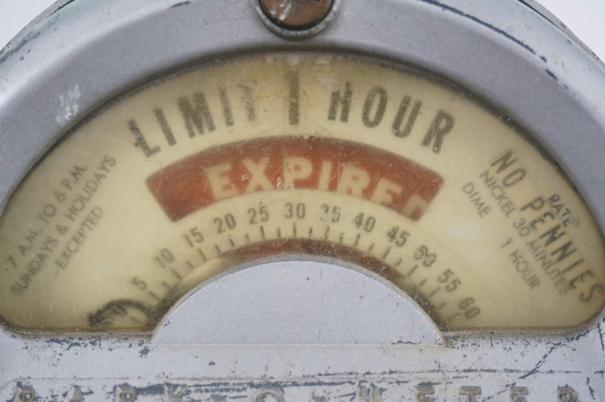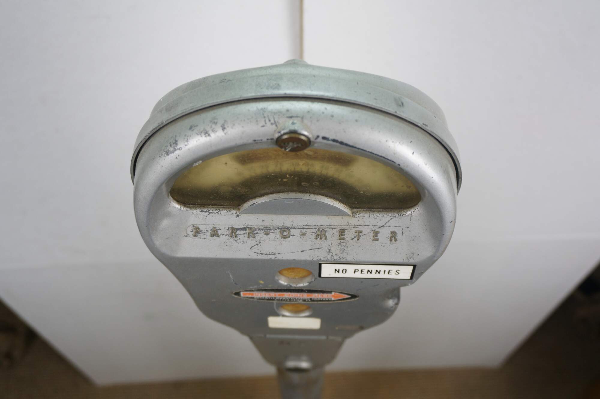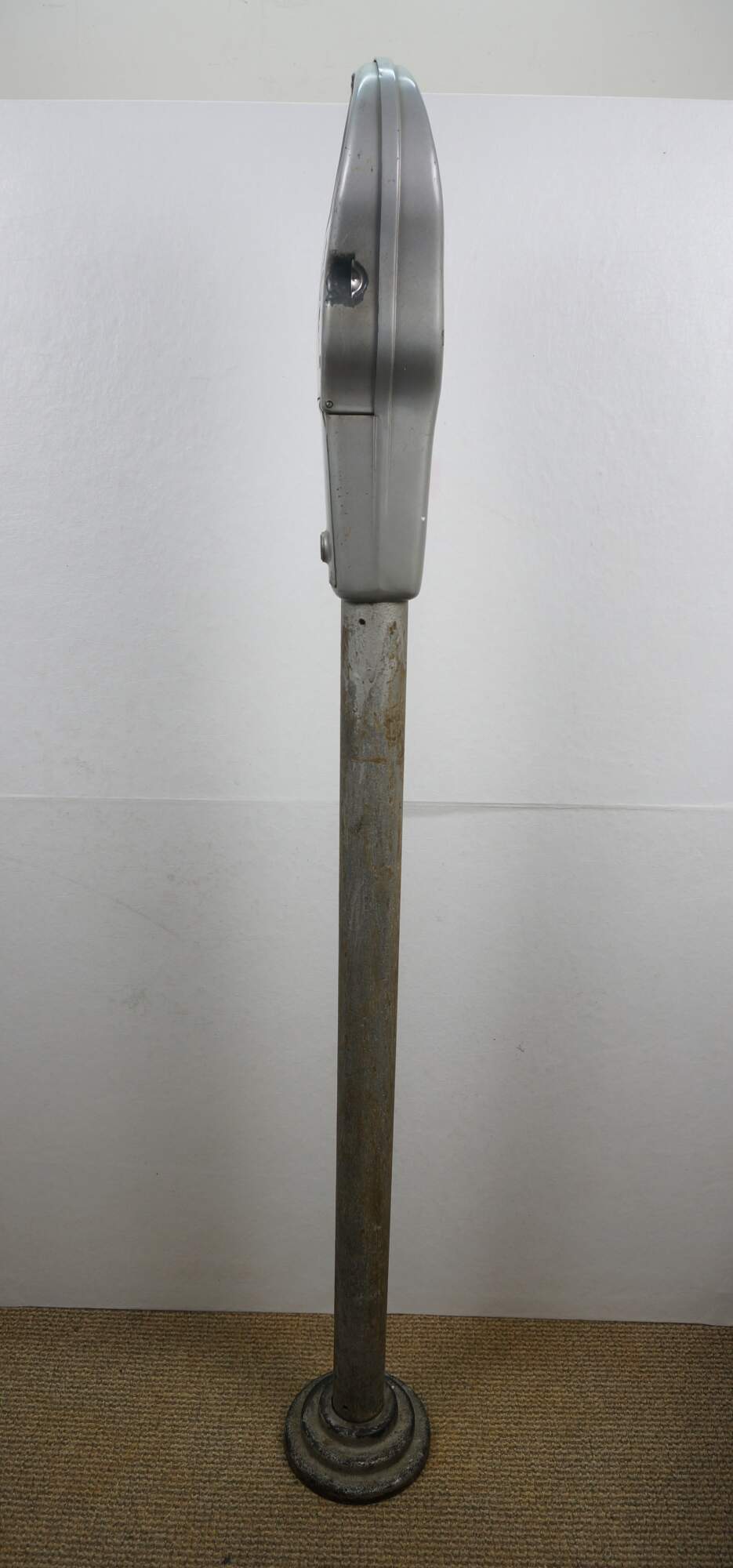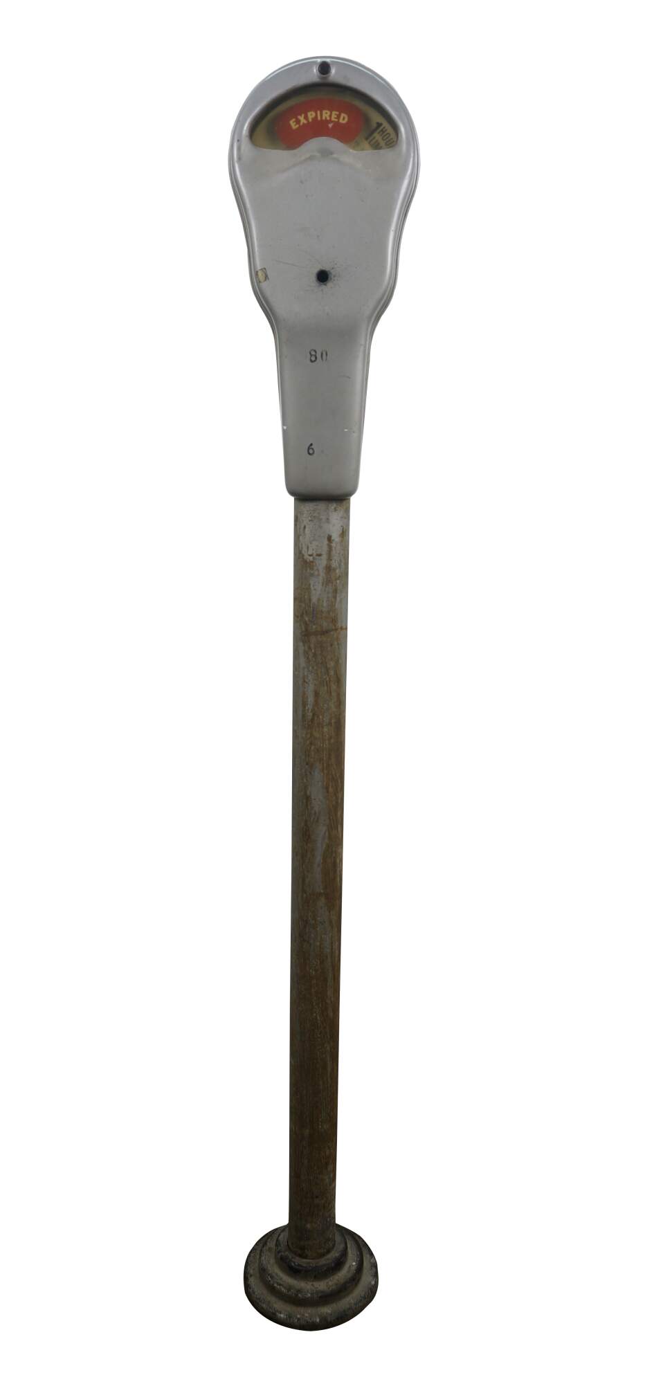 Mid to late 20th century Park-o-Meter coin operated, One Hour Limit parking meter. Silver painted guitar-shaped head mounted on original iron post and round base. Manufactured by the Rockwell Manufacturing Company, Pittsburgh, PA.