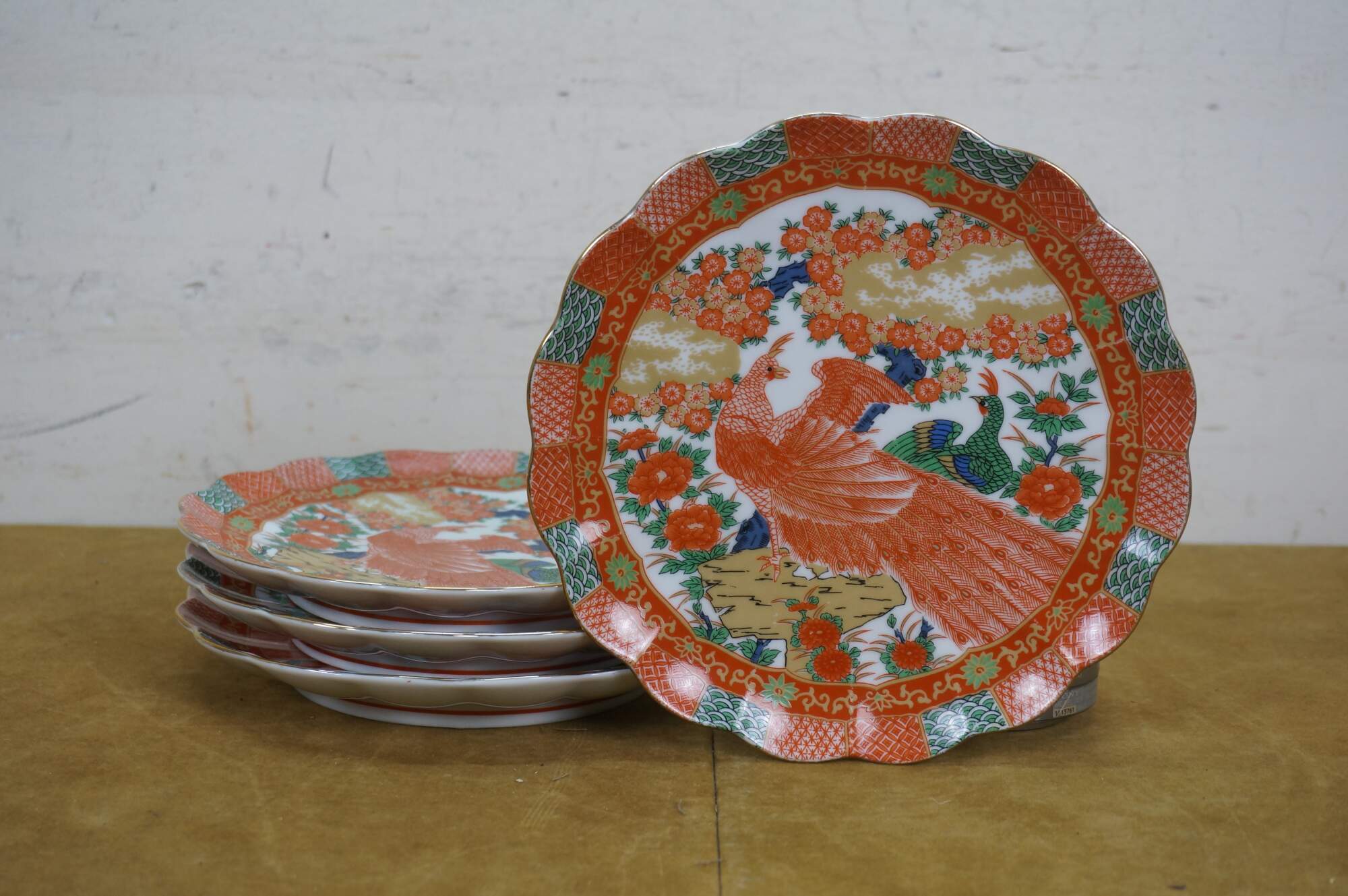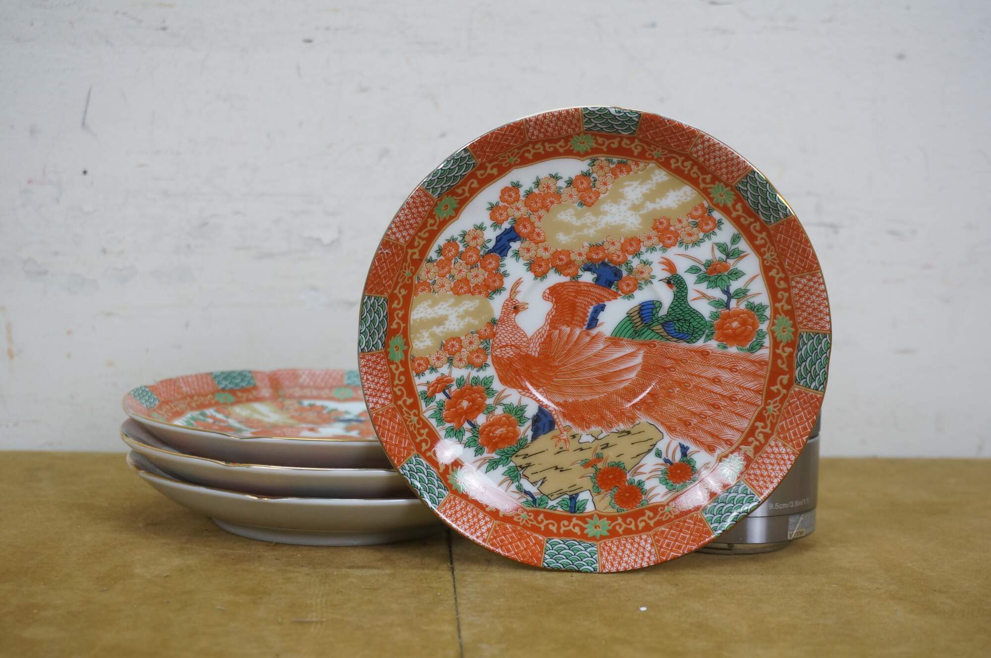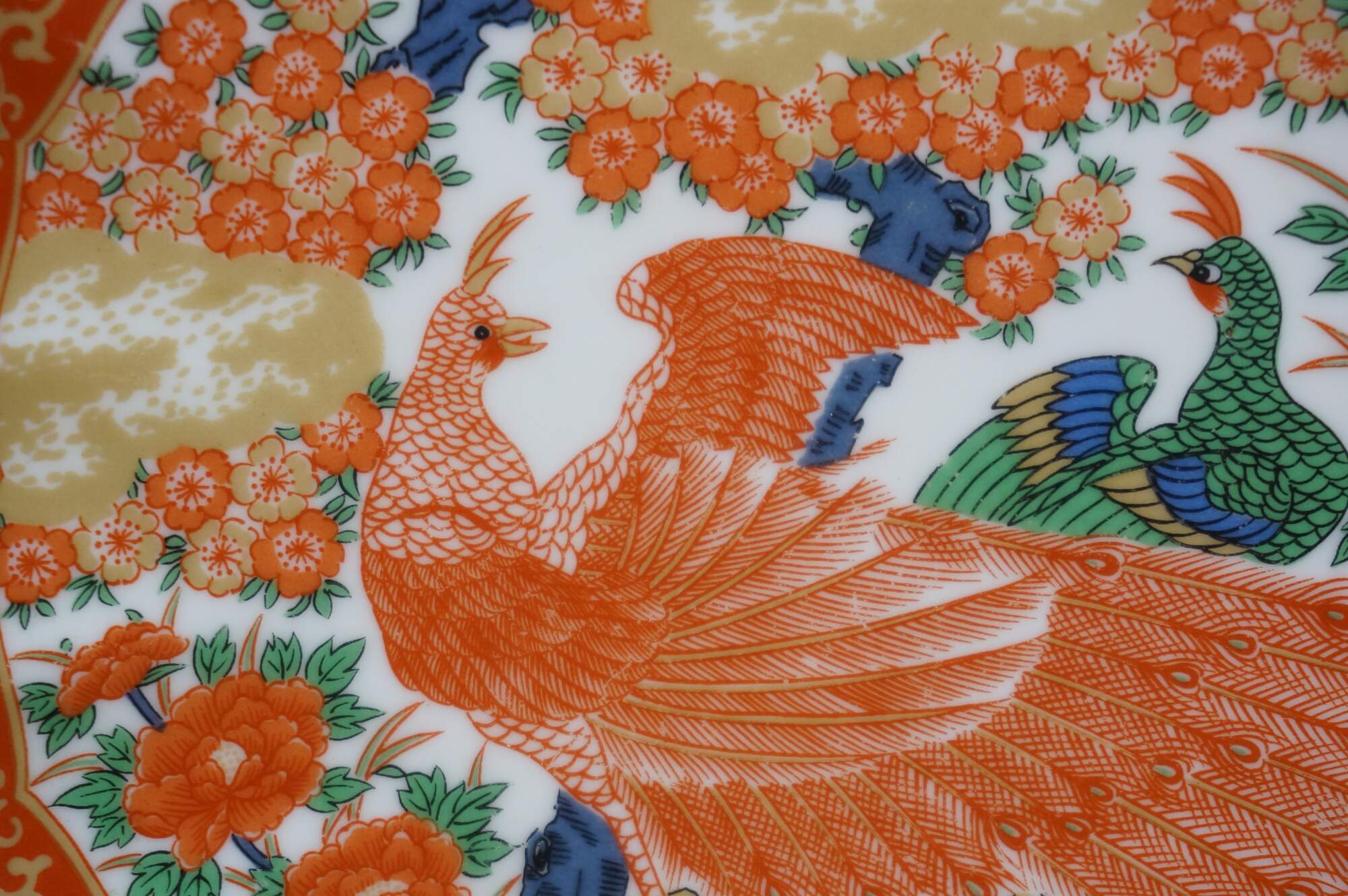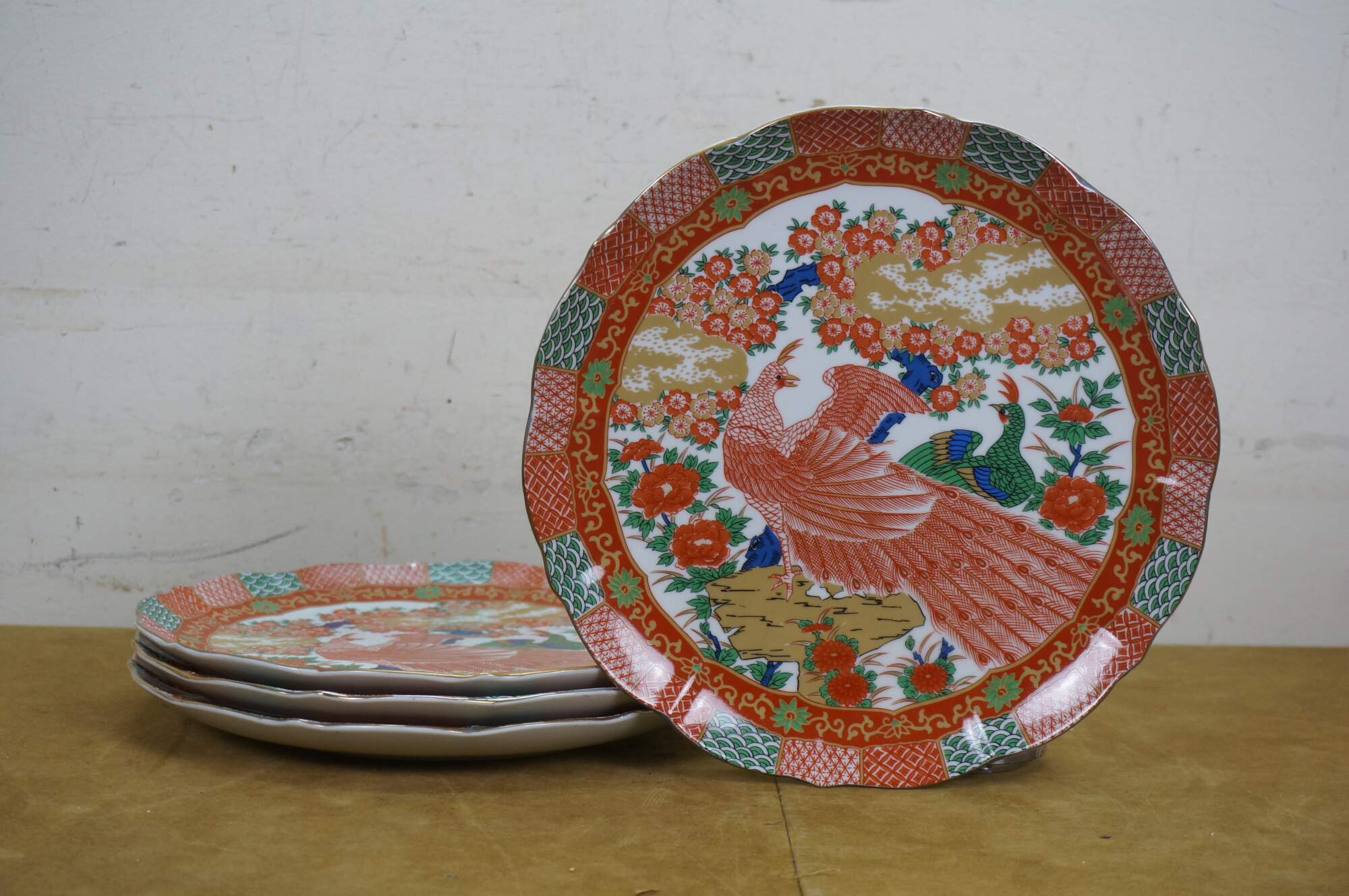 Late 20th century Arita Japan Imari porcelain dinnerware. White porcelain hand painted with a red-orange, green, gold and blue imari style design of a pair of peacocks under a flowering tree. Includes service for four: 4 Dinner Plates, 4 Soup Bowls, 4 Bread Plates, 4 Saucers, 4 Teacups.