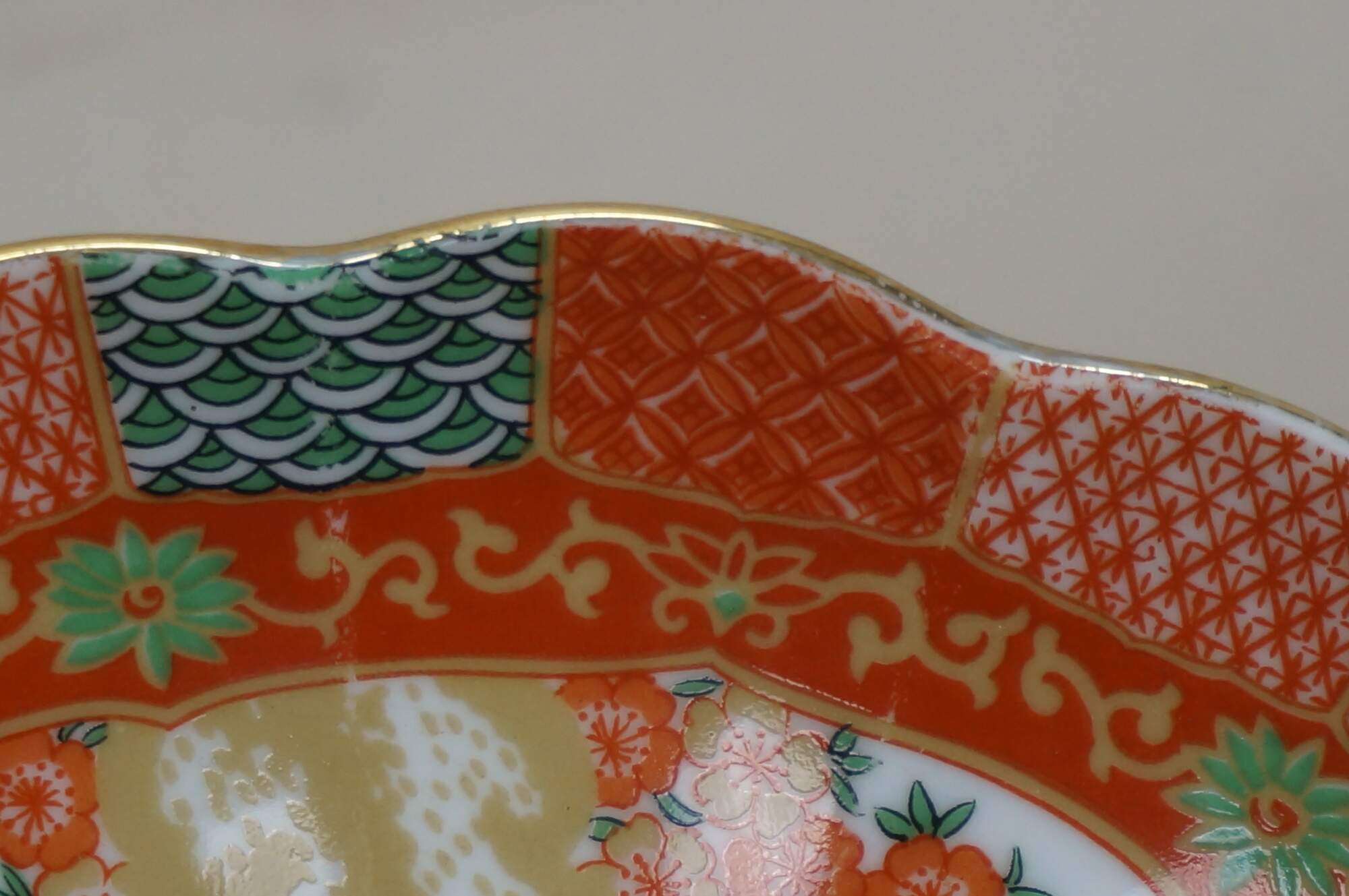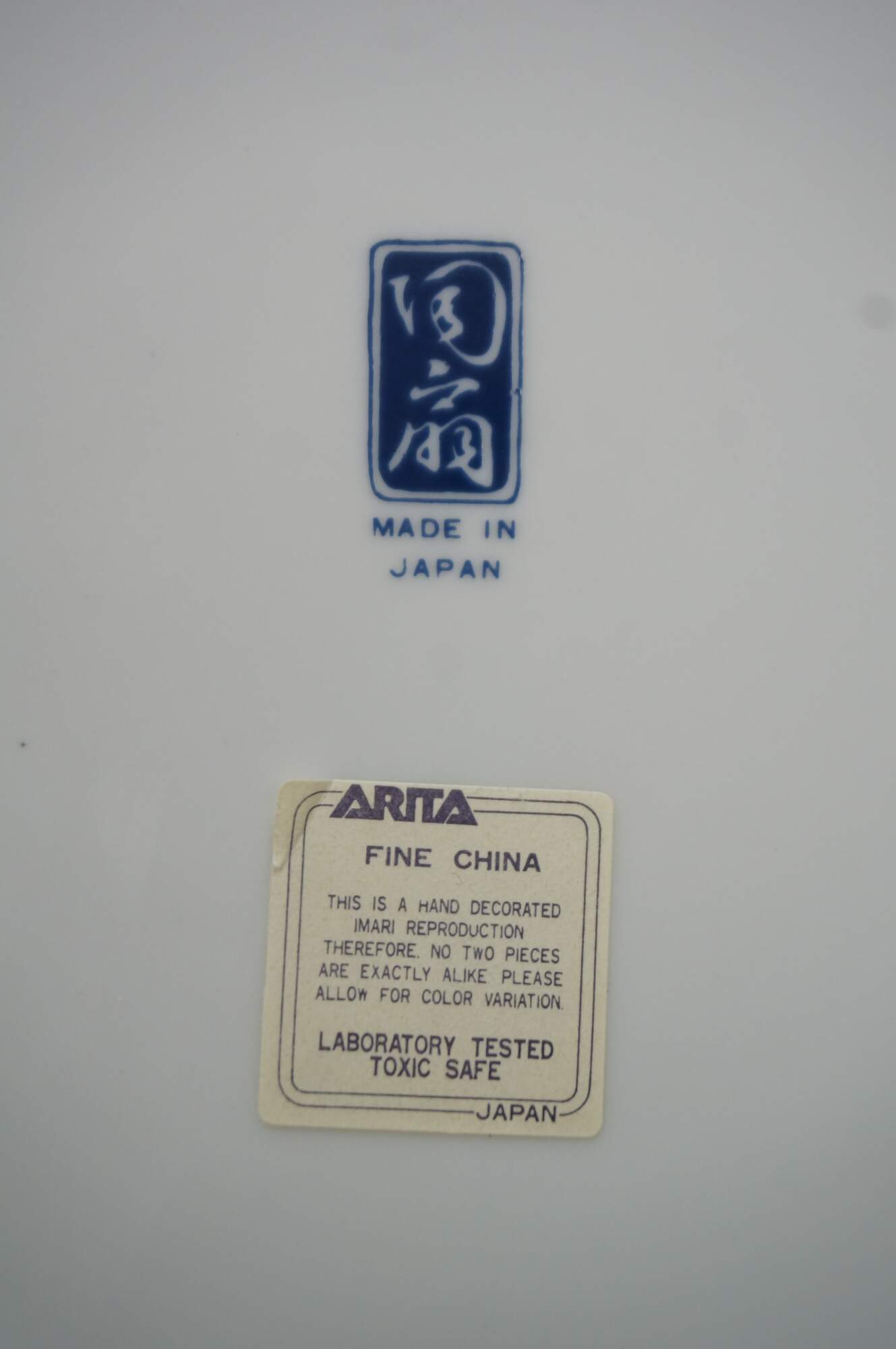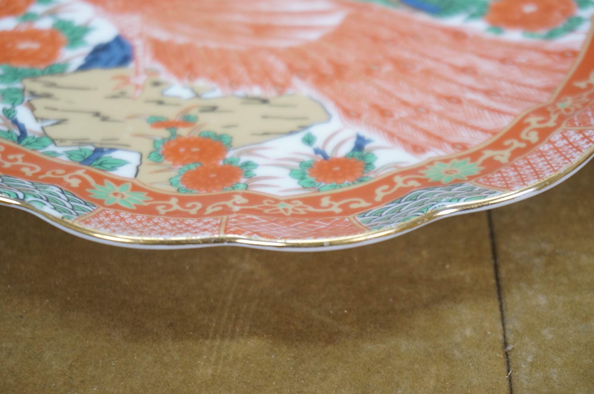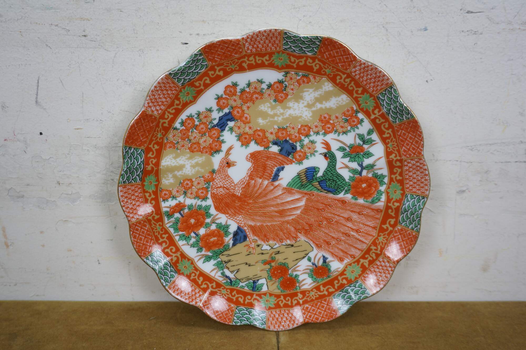 Late 20th century Arita Japan Imari porcelain dinnerware. White porcelain hand painted with a red-orange, green, gold and blue imari style design of a pair of peacocks under a flowering tree. Includes service for four: 4 Dinner Plates, 4 Soup Bowls, 4 Bread Plates, 4 Saucers, 4 Teacups.