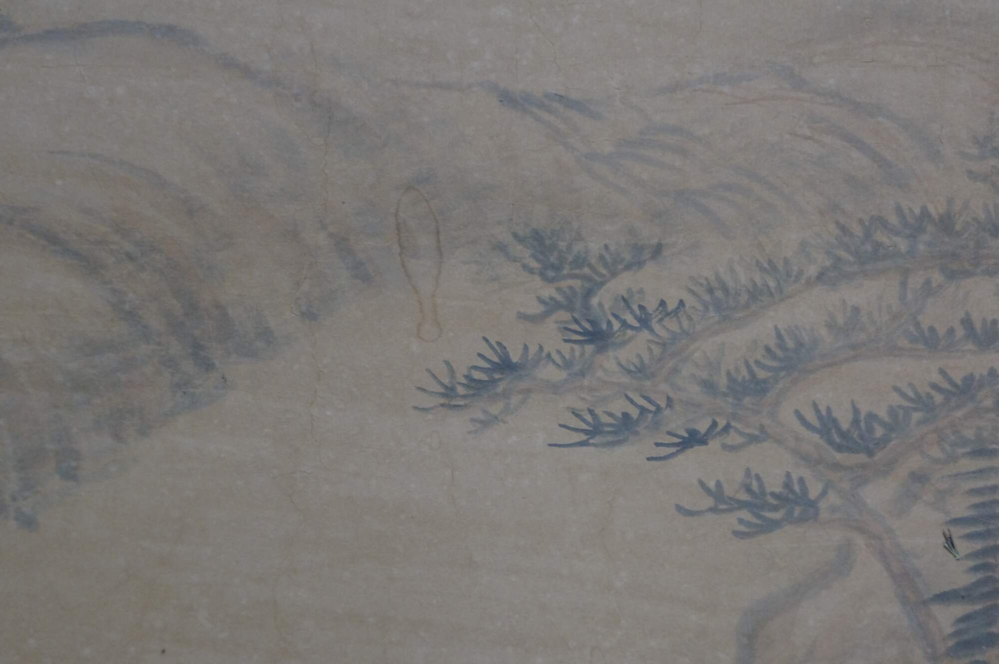 Mid to early century Chinese wall hanging scroll, painted with a pair of figures riding donkeys, crossing a bridge against a landscape of mountains and gnarled pines; by artist Sun Yunqiao. Sealed in the lower right corner. Paper on silk.